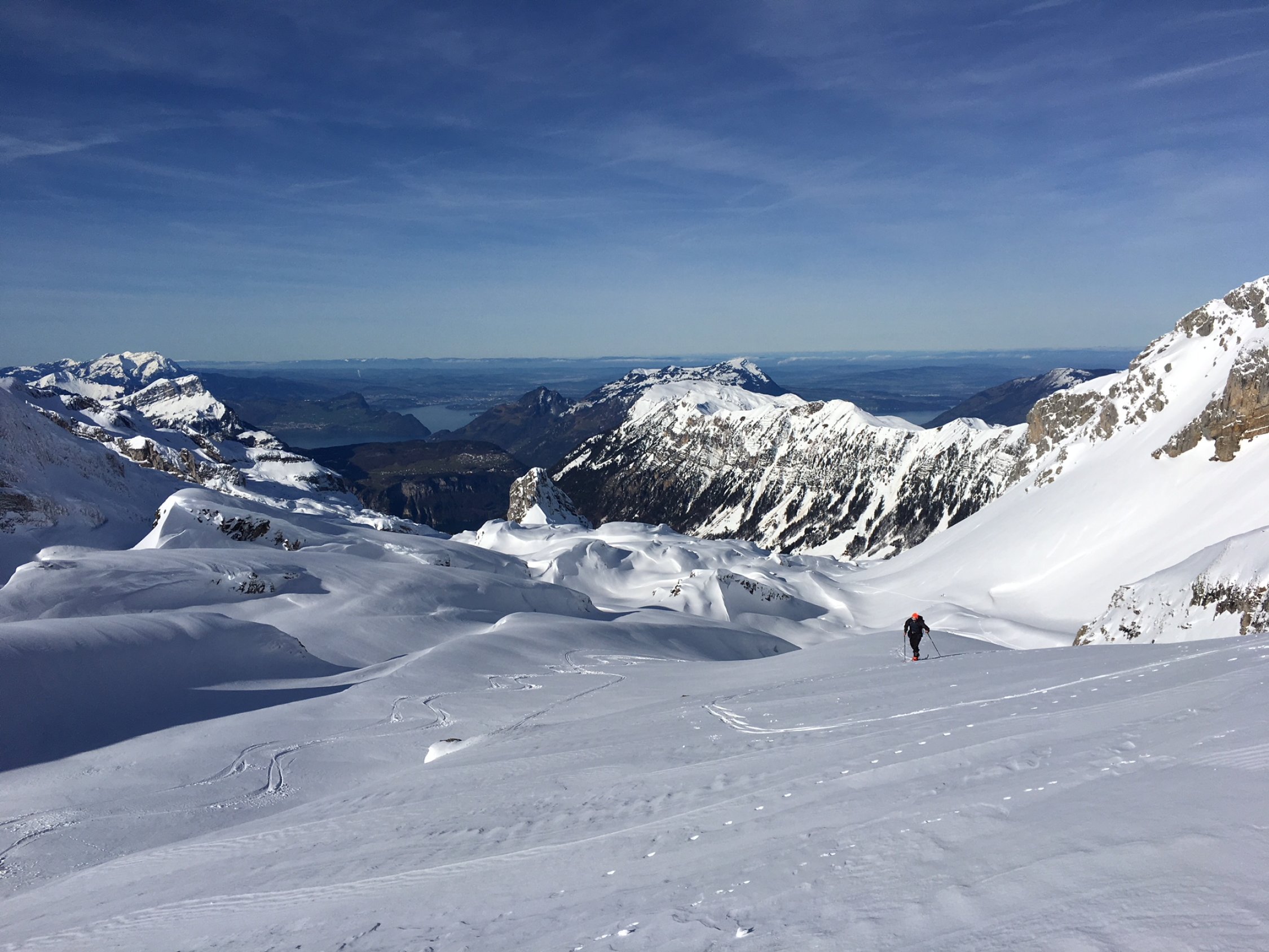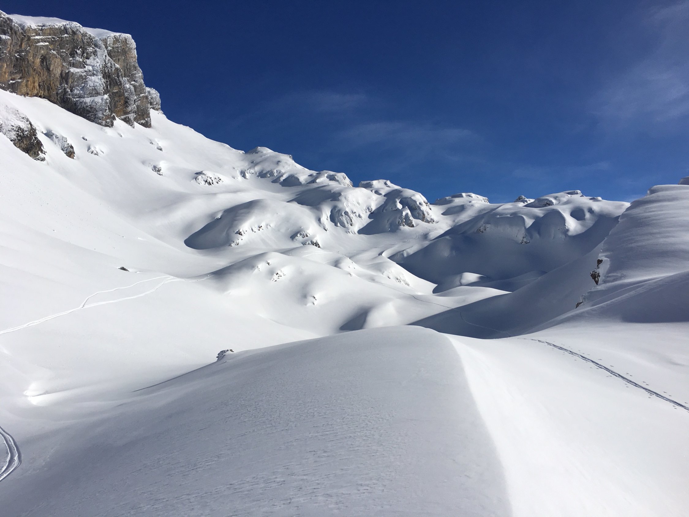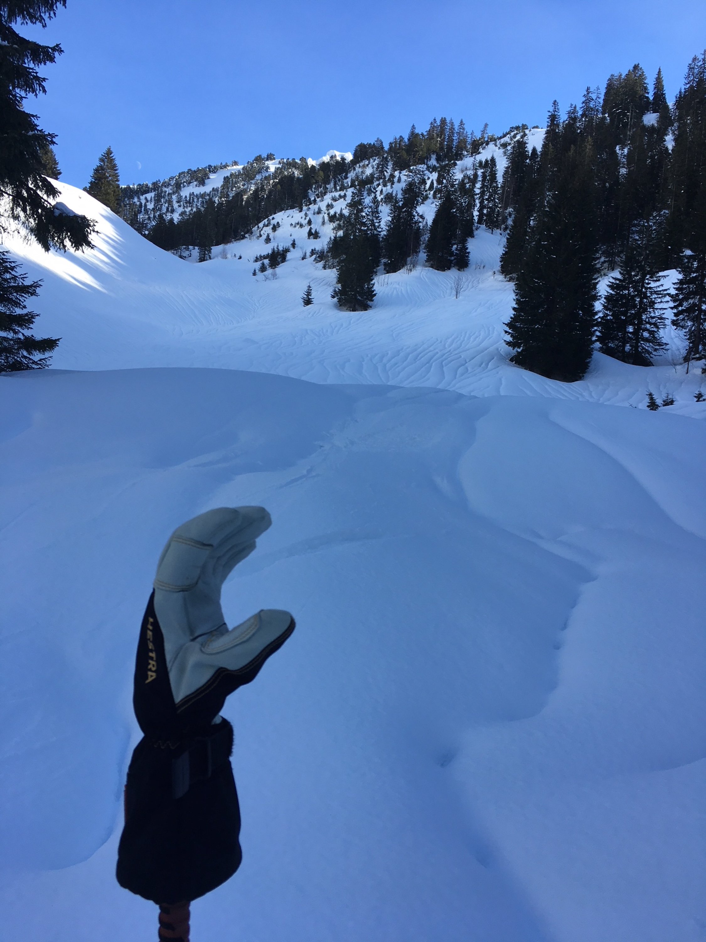 Abfahrt via Schnüerstock / Alt Stafel. Bis ca. 1800 Hm in sehr gut drehbaren gepressten Pulver / Triebschnee. Ab 1700 Hm ist die Schneedecke stark vom Regen geprägt (Rillenkonzert), weitgehend tragend und noch gut fahrbar. Keine Lawinenbeobachtungen. Manche Hänge sind massiv mit Triebschnee beladen. An sehr steilen Hängen ging auch einiges herunter, vermutlich am vergangenen Montag.