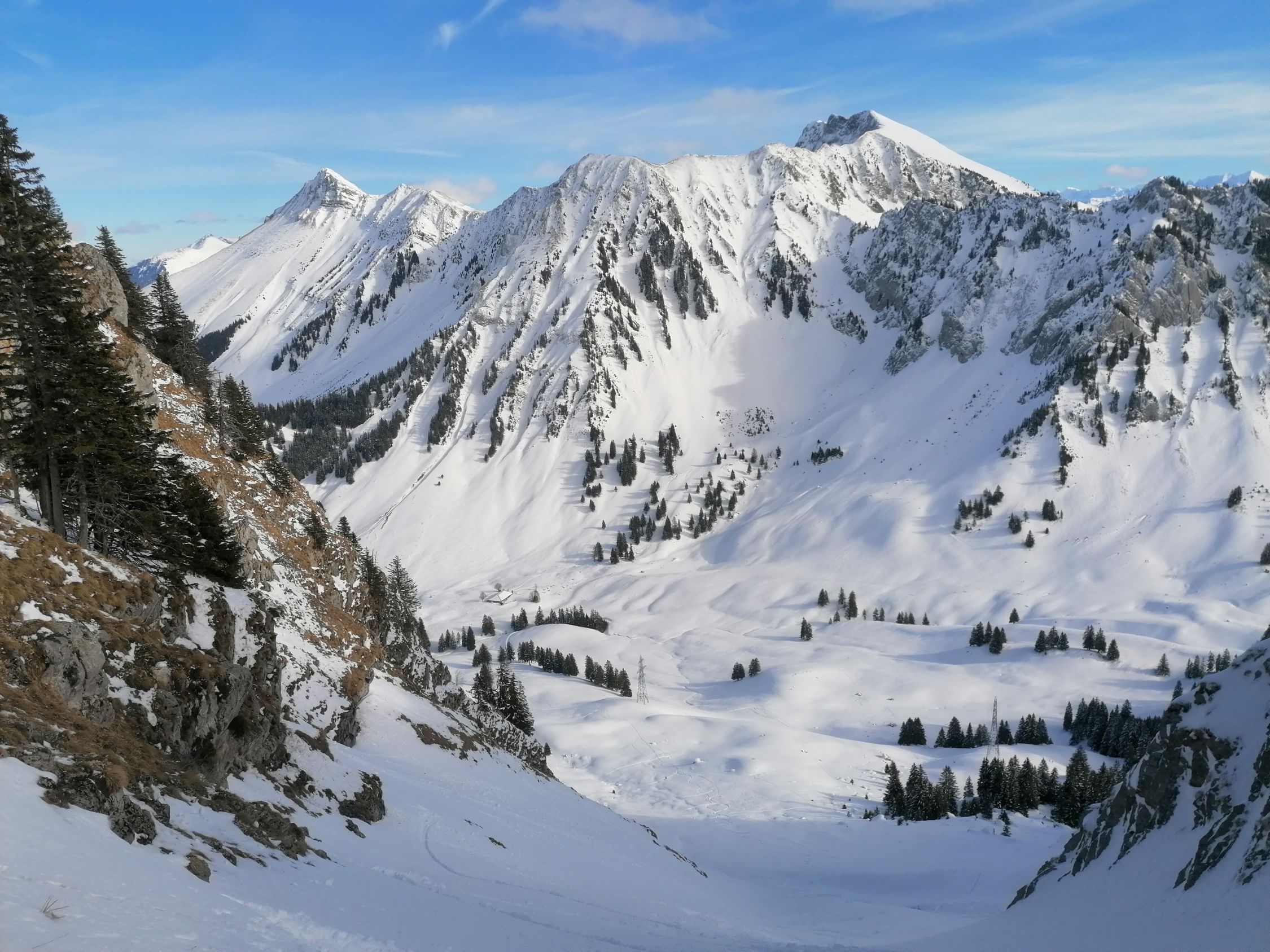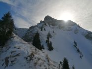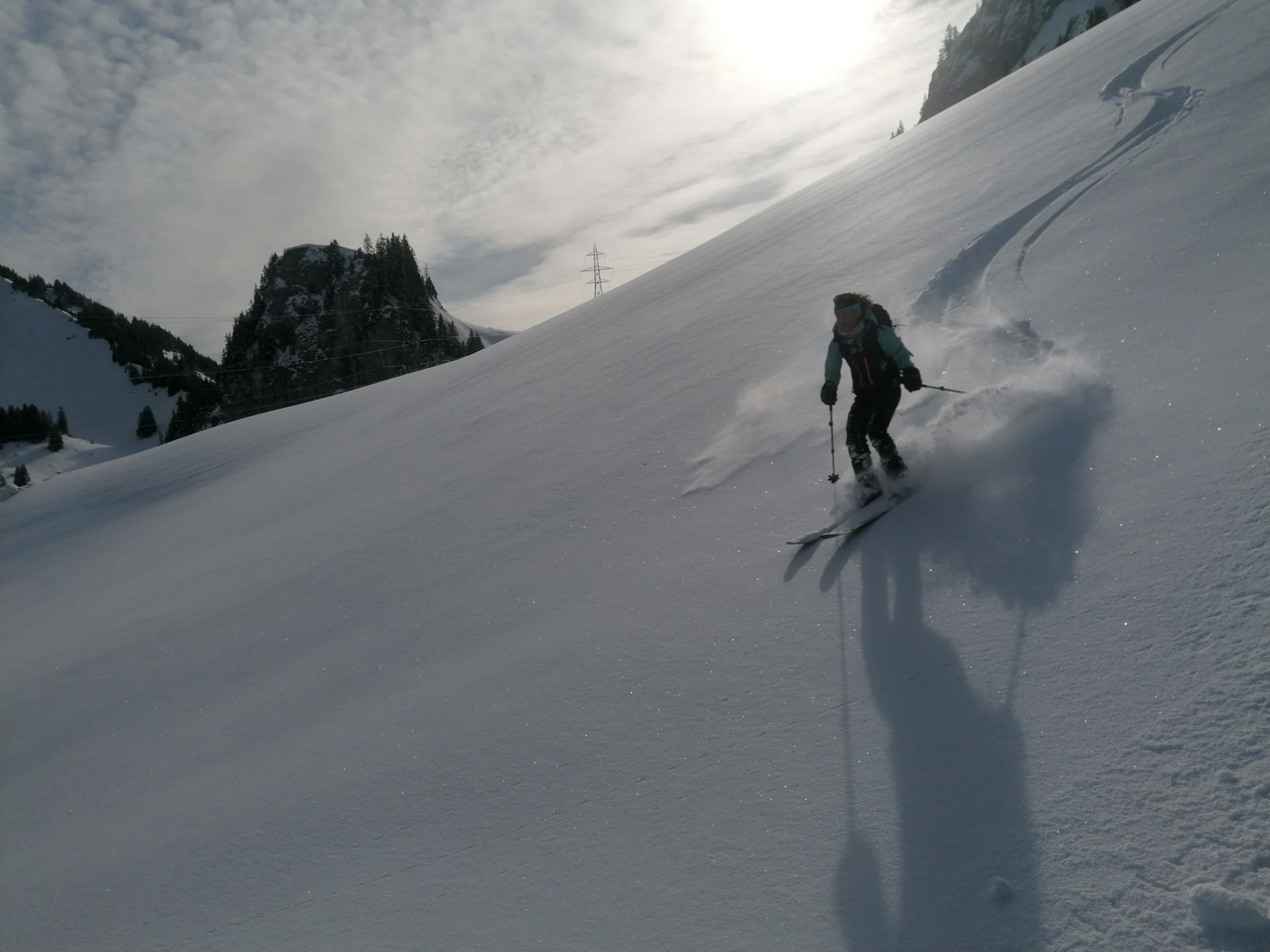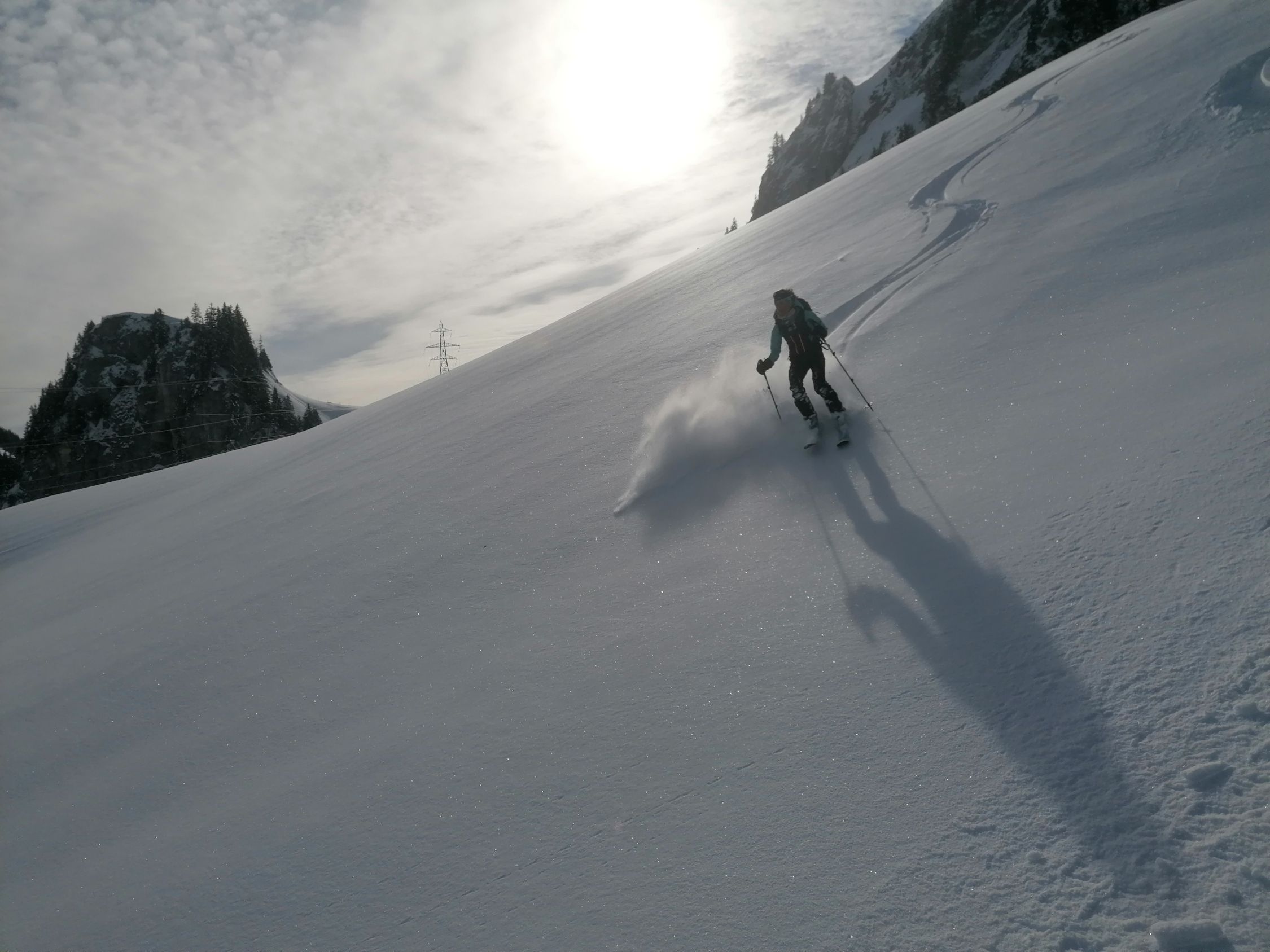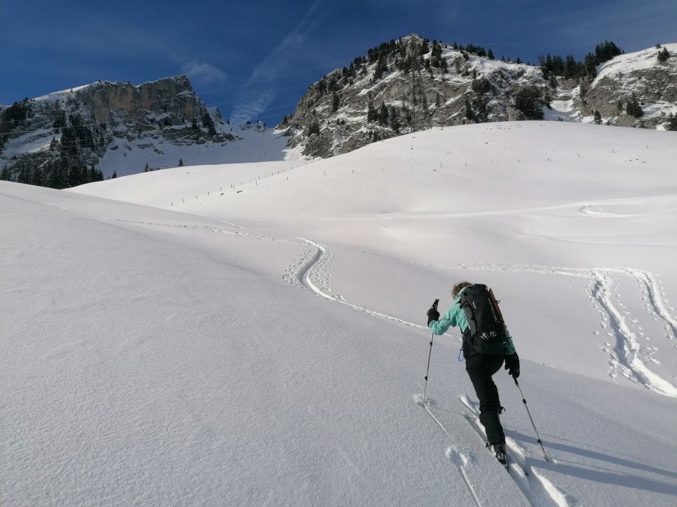 Wunderbare Halbtages-Skitour hoch über dem Schwarzsee. Der Aufstieg erfolgte von Schwarzsee über die Untere Euchselsalp, und die Südostflanke in die Fochsenflue-Lücke 1945m. Diese befindet sich zwischen der Fochsenflue und Spitzflue. Der Hang ist bis zu 40 Grad steil.