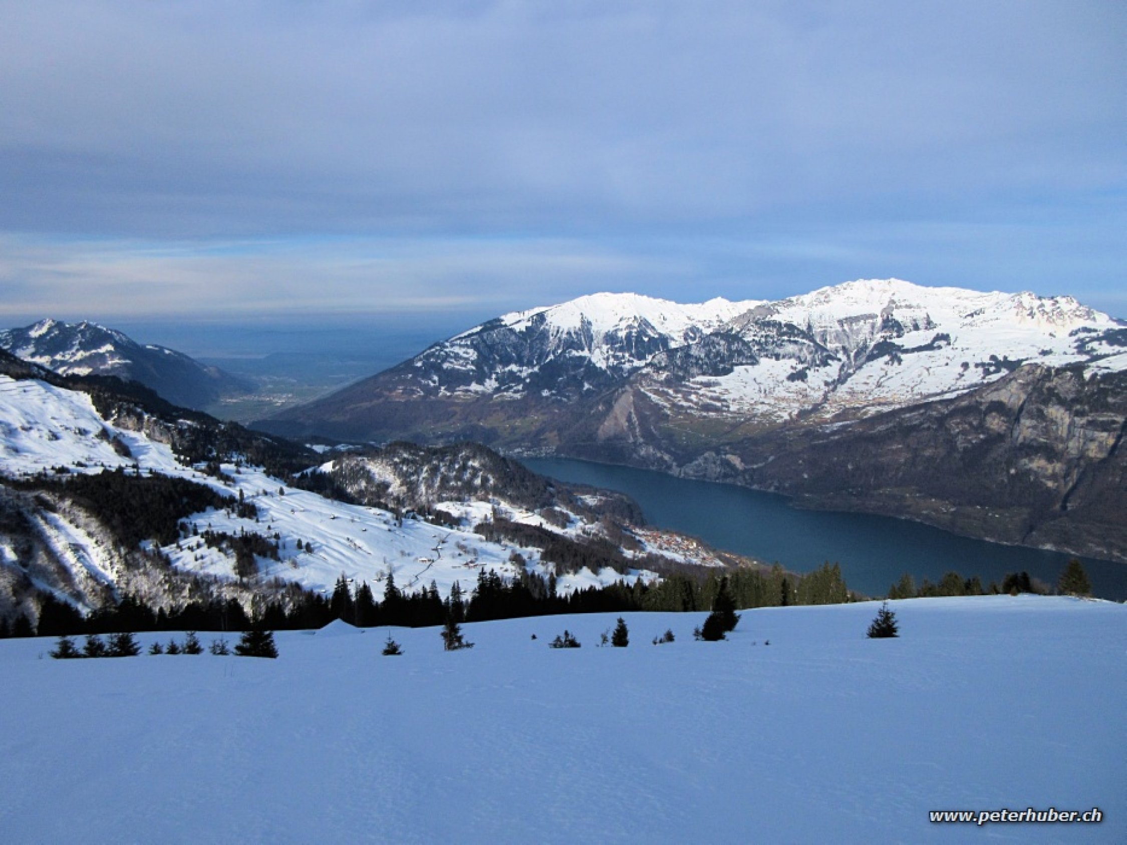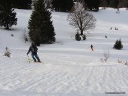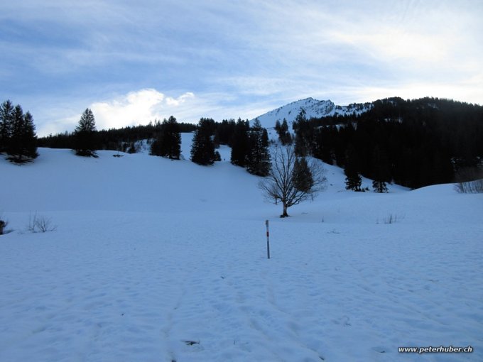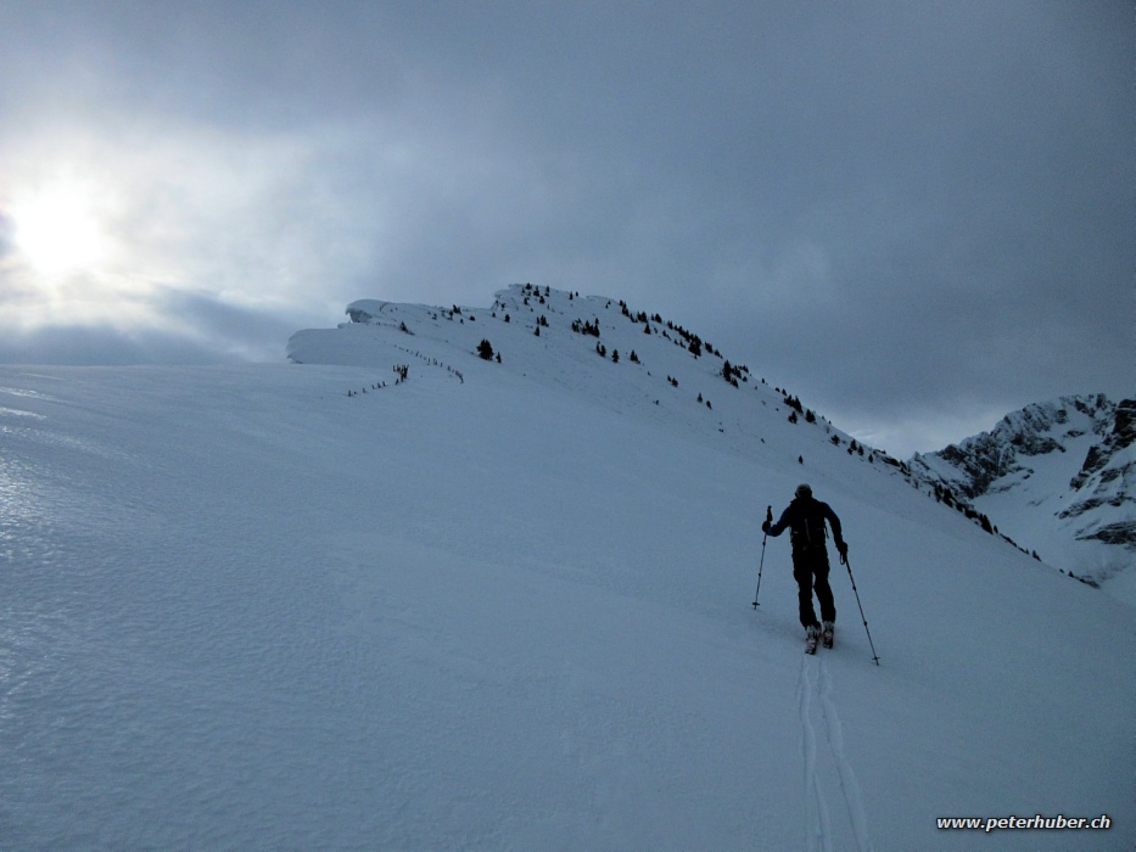 Bleicher Sonnenschein, kurz auch mal blauer Himmel, warm und windstill. Ab Hüttenberge liegt genug Schnee. Bei Ammelin sind etliche Nassschneerutsche abgegangen. Dann gefrorene Wasserrillen bis an den Waldrand ca 1600 m. Darüber wird der Schnee glasig und sehr hart sodass wir den Gipfel weggelassen haben. Selbst mit Harscheisen kein Vergnügen mehr.