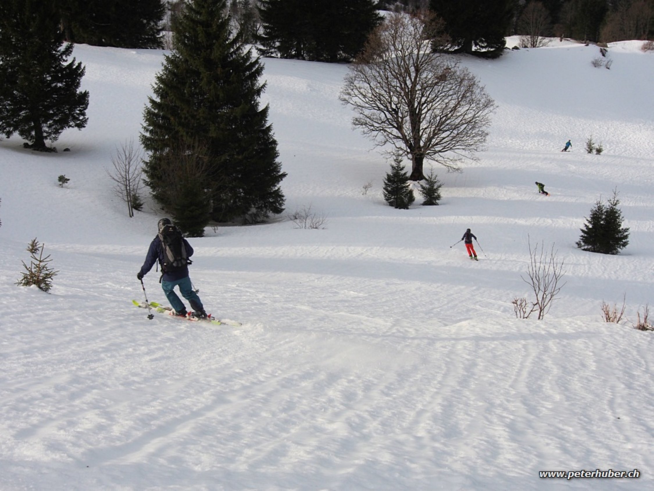 Abfahrt viele Wechsel - oben zuerst hart und schön, dann ruppige Wasserrillen, zwischen 1400 und 1200 m schöner Sulz, darunter Bruchharsch und mühsam.