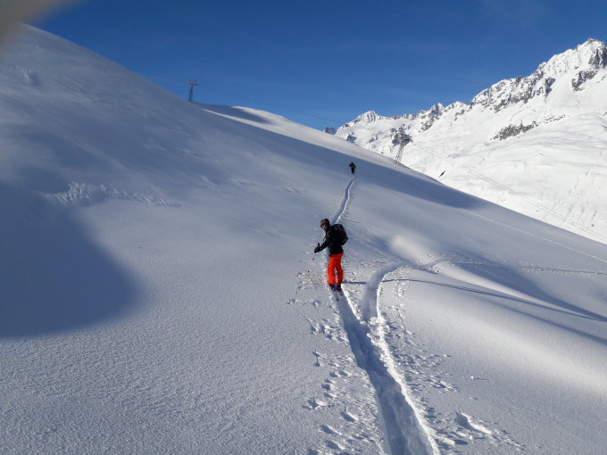 Unten hart mit Wasserläufen. Mittelteil schöner fester Pulverschnee.