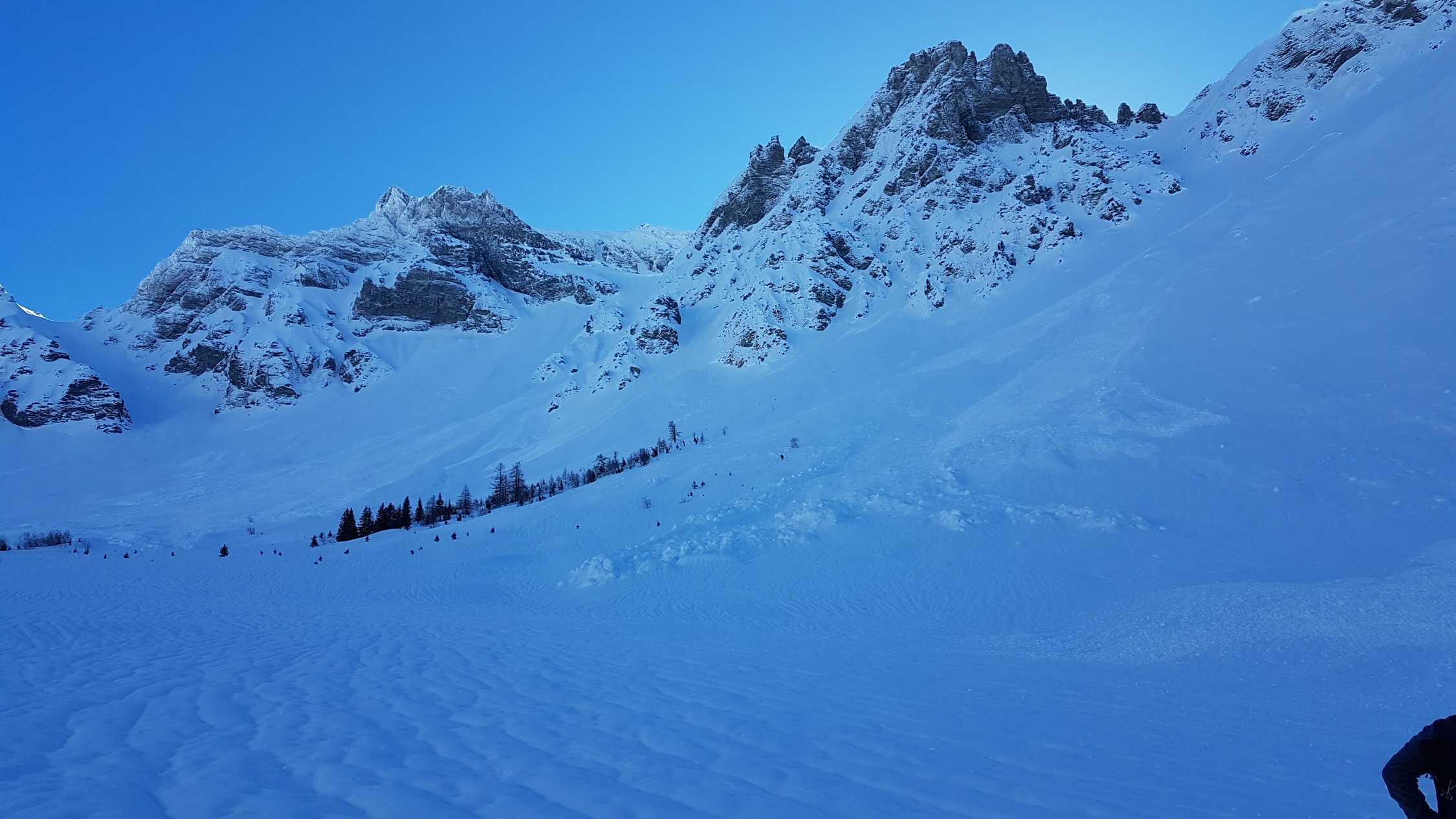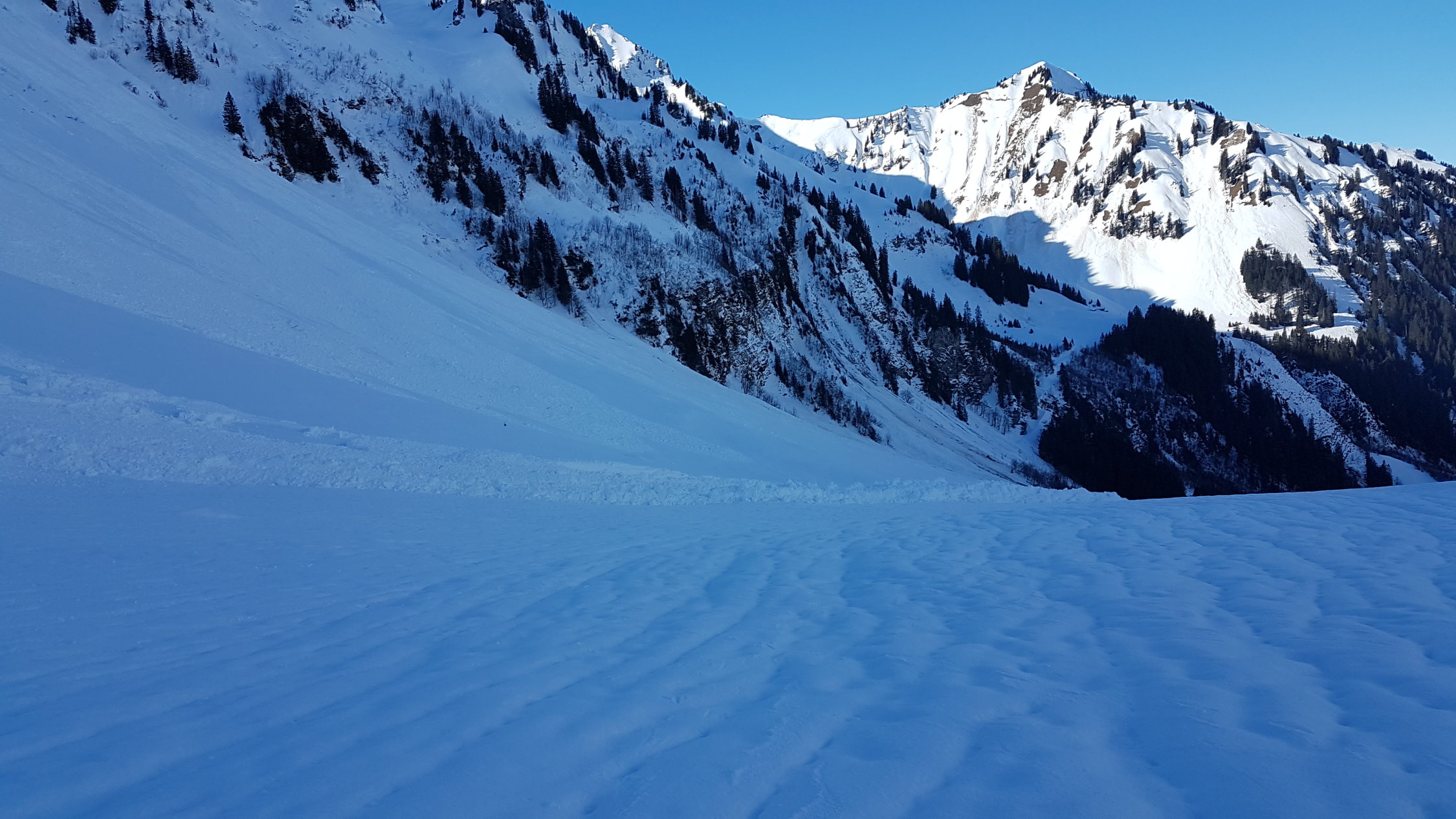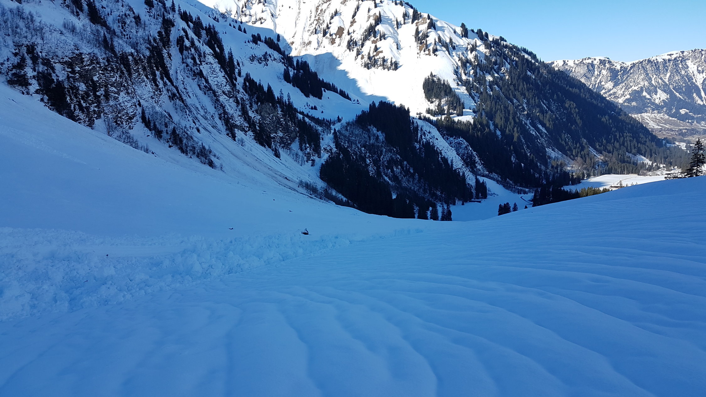 Imposant sind die Schneerutsche unter den Türmlihore. Derart weit runter kamen sie nicht einmal im Lawinenwinter 1999. Auch die zahlreichen Fischmäuler in jeder Hanglage sind beeindruckend.