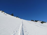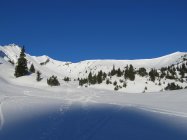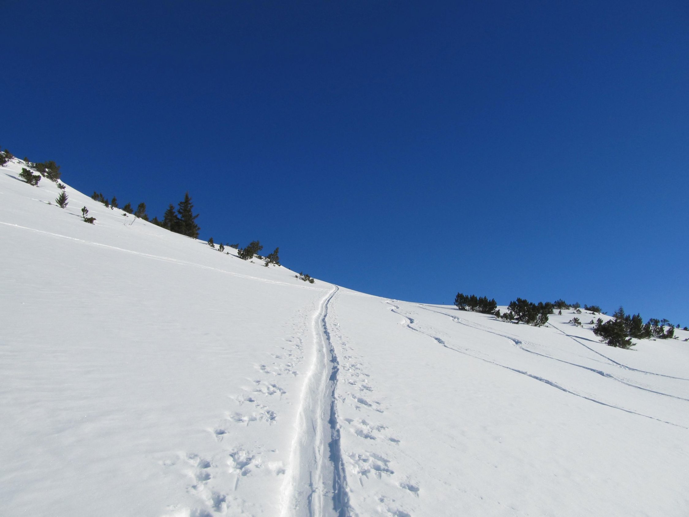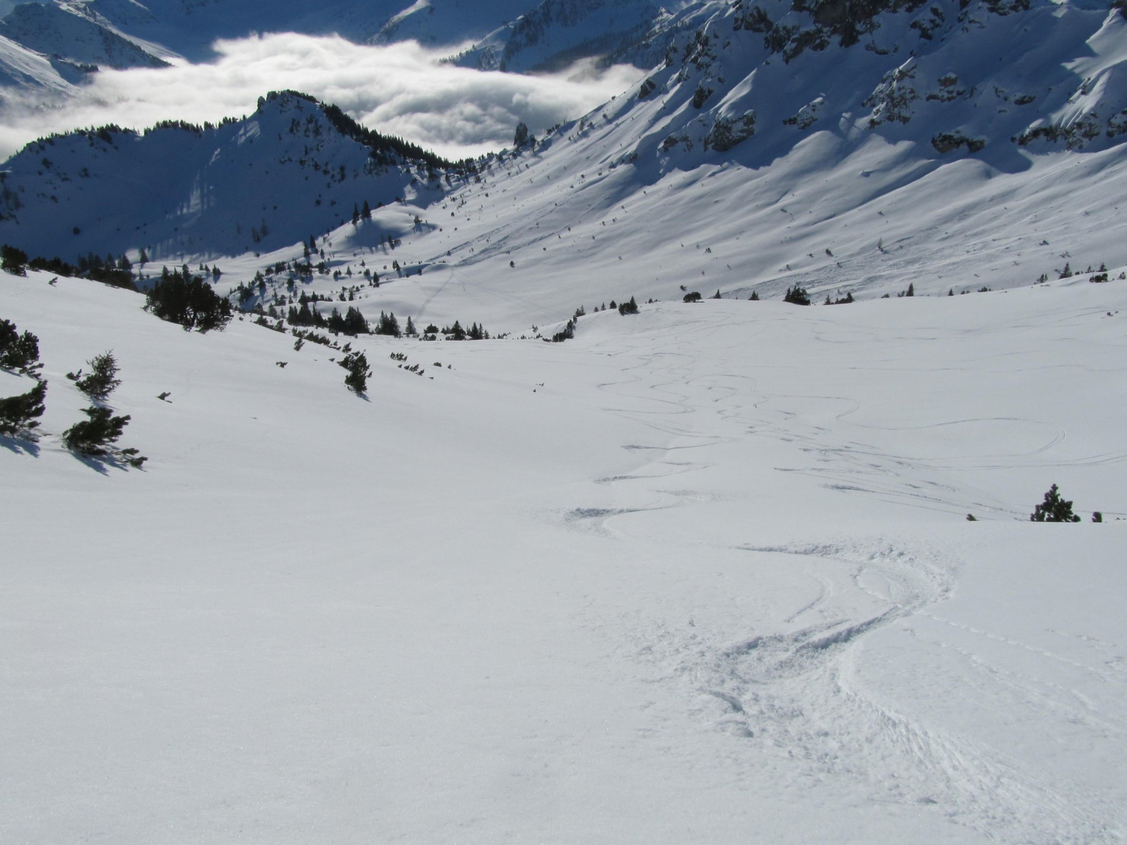 Wegen der offensichtlichen Lawinengefahr der letzten Tage führte die Spur nach Okstola runter. Vom Stachlerkopf gingen die letzten Tage 3 Schneebretter bis in die Mulde hinab.