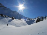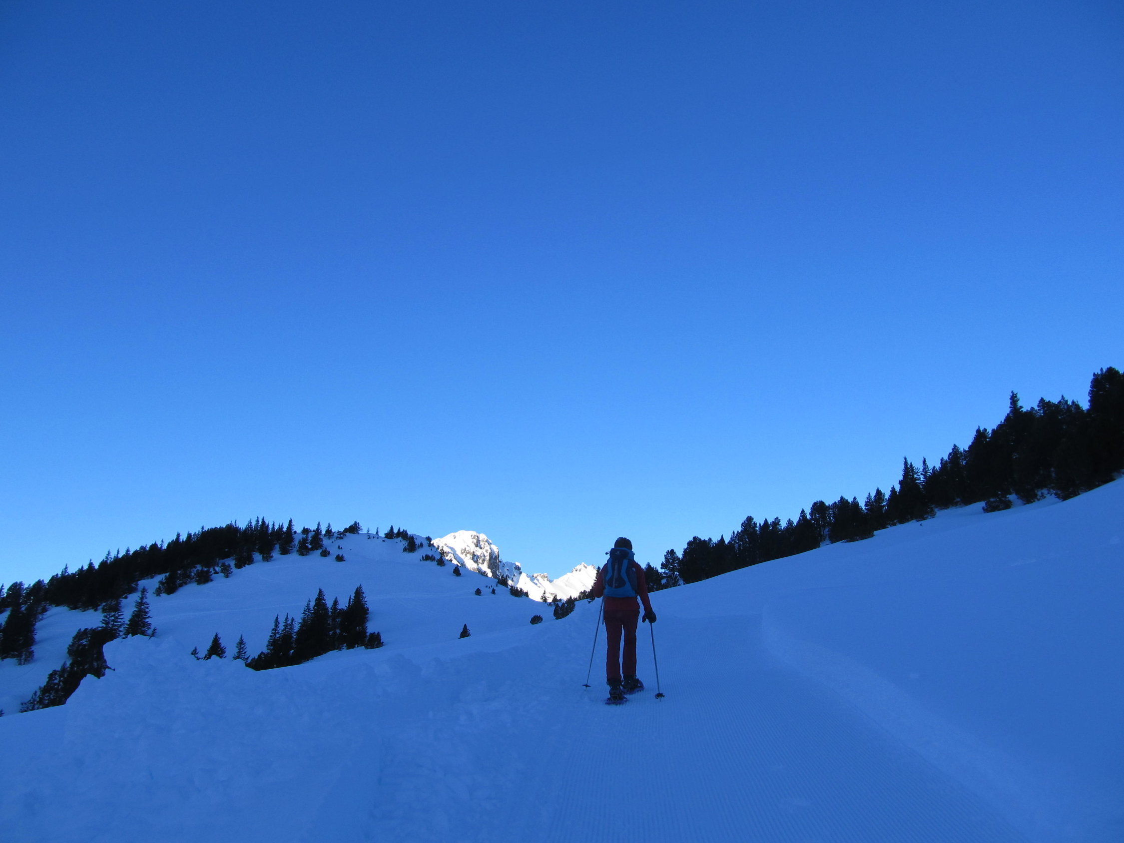 Malbun war bei unserer Ankunft vorübergehend nebelfrei. Bei -1 Grad Start. Bis Sassförkle auf dem planierten Weg. Über Obersäss noch im Schatten. Die Traverse nach dem Wechsel in die Nordflanke wurde nur kurz begangen.