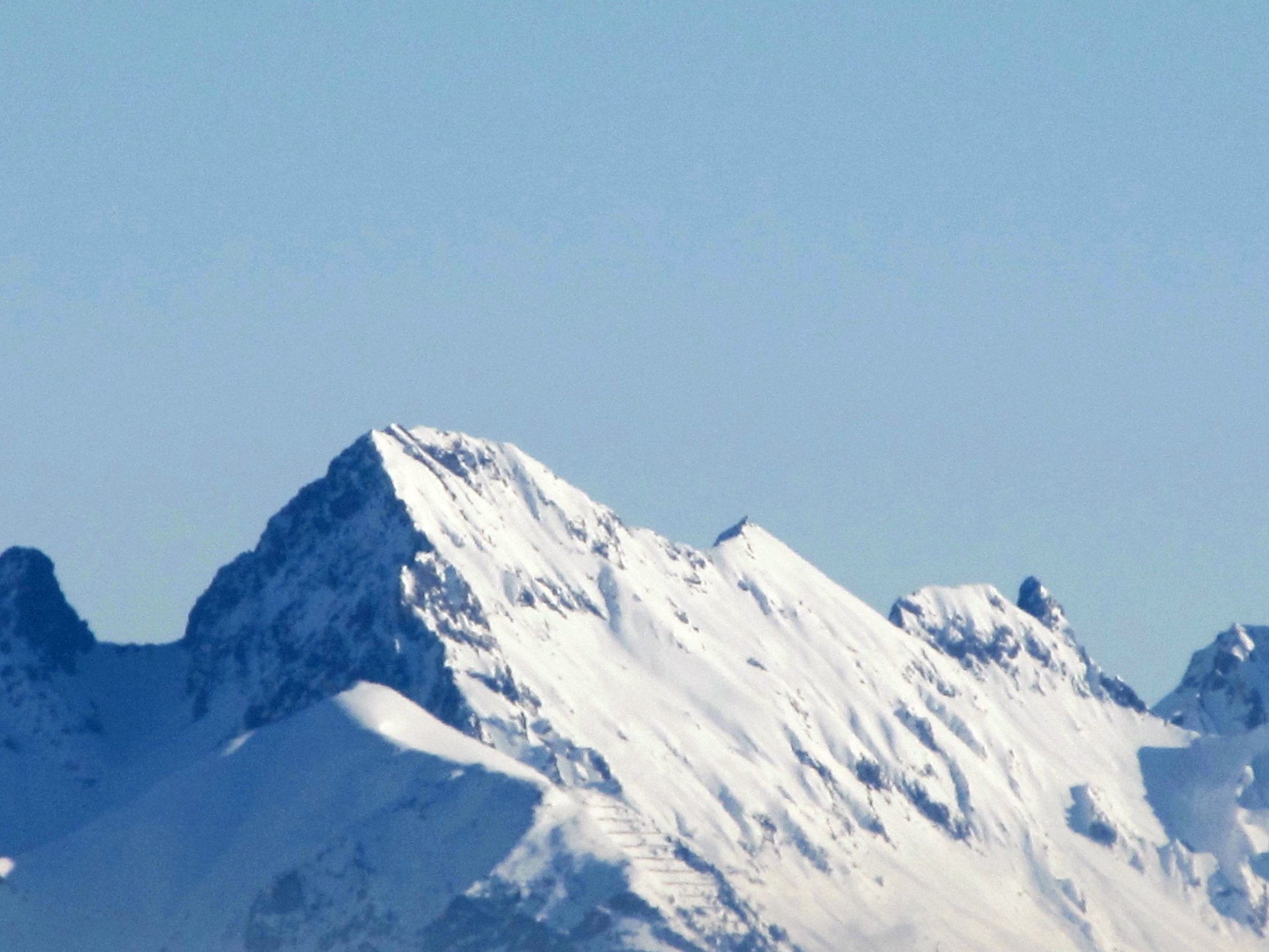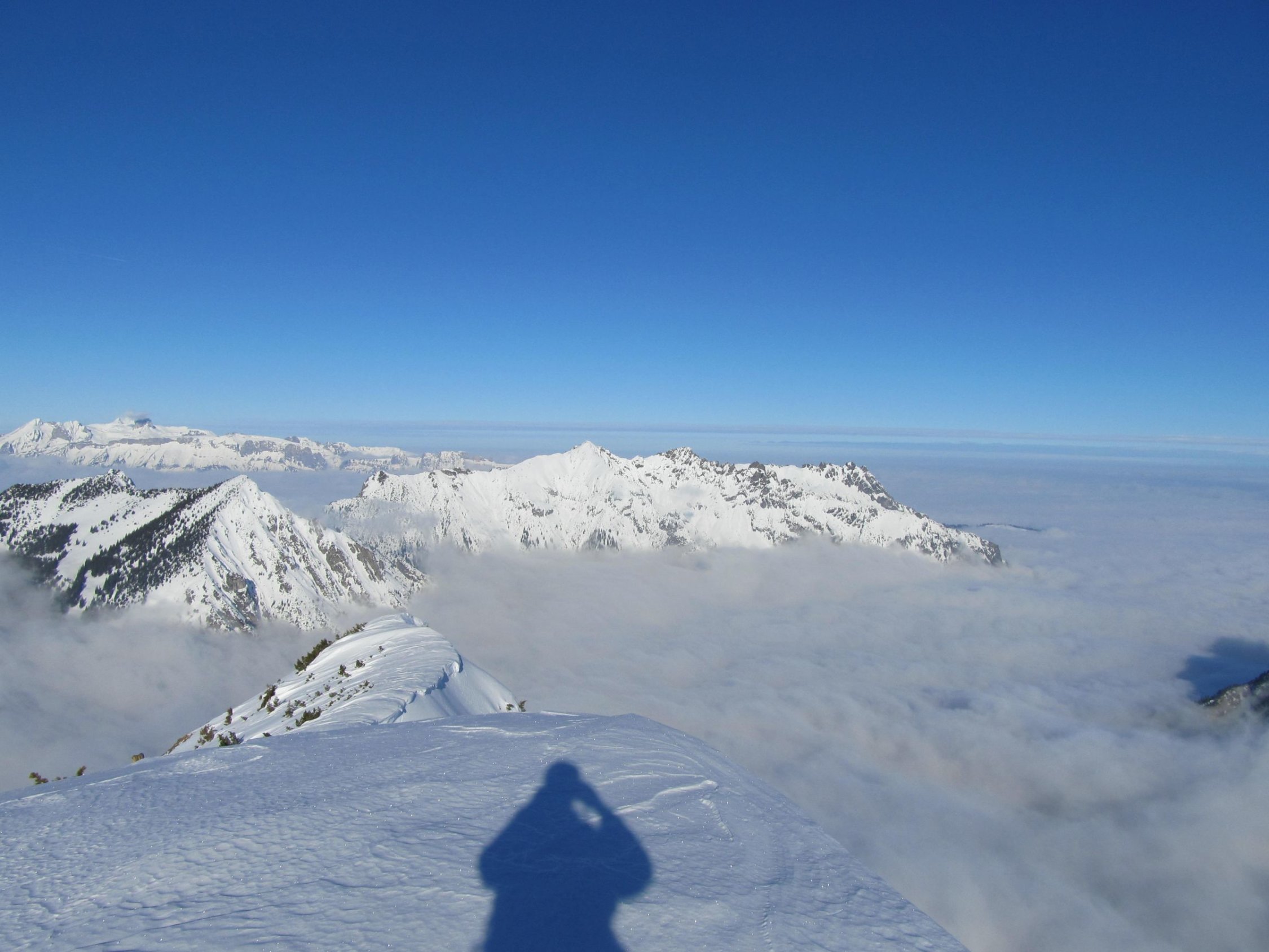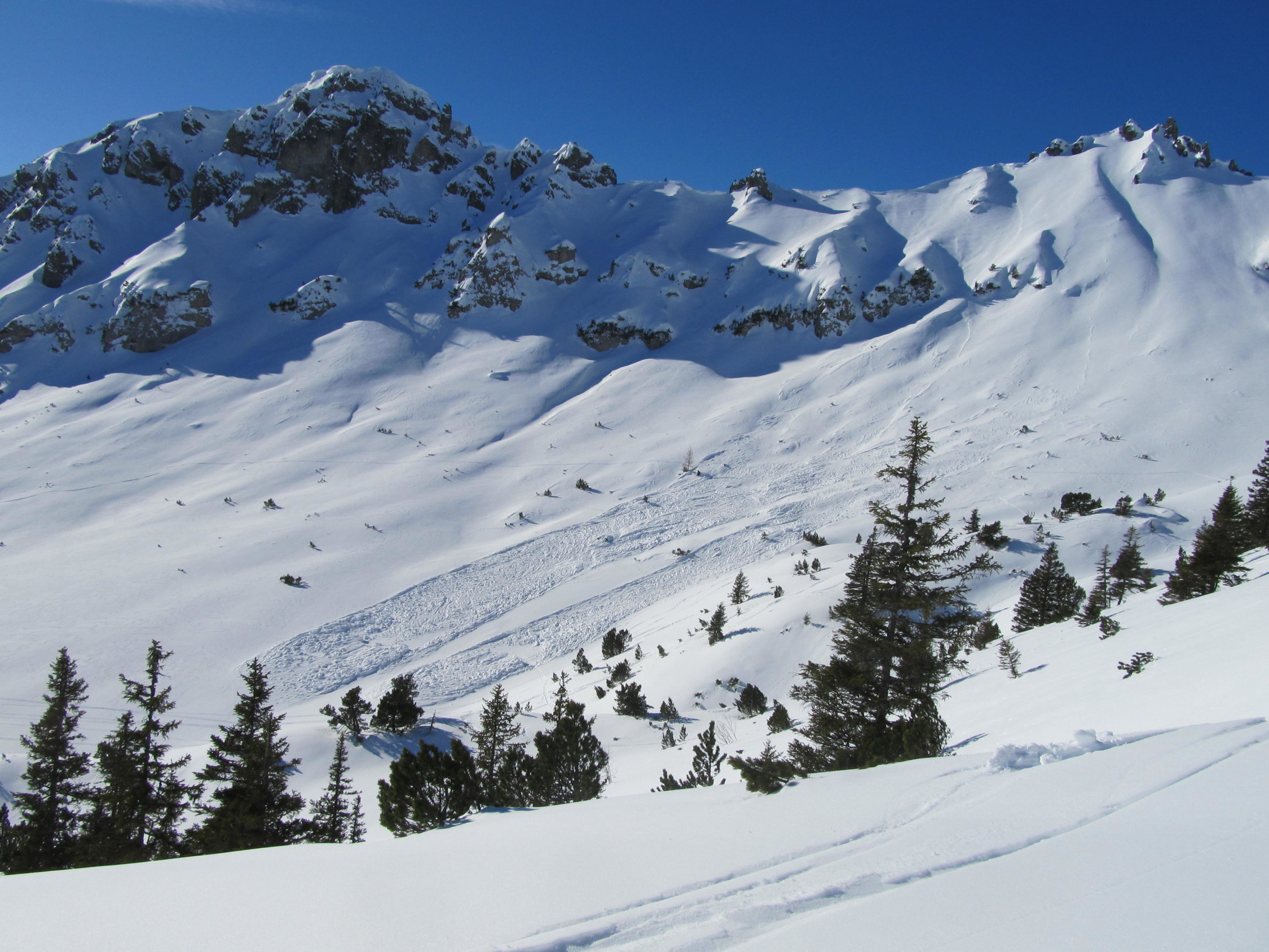 Schneequalität teils verharscht, nordexponiert pulvrig. Der Gipfelhang war beim Abstieg aufgesulzt.