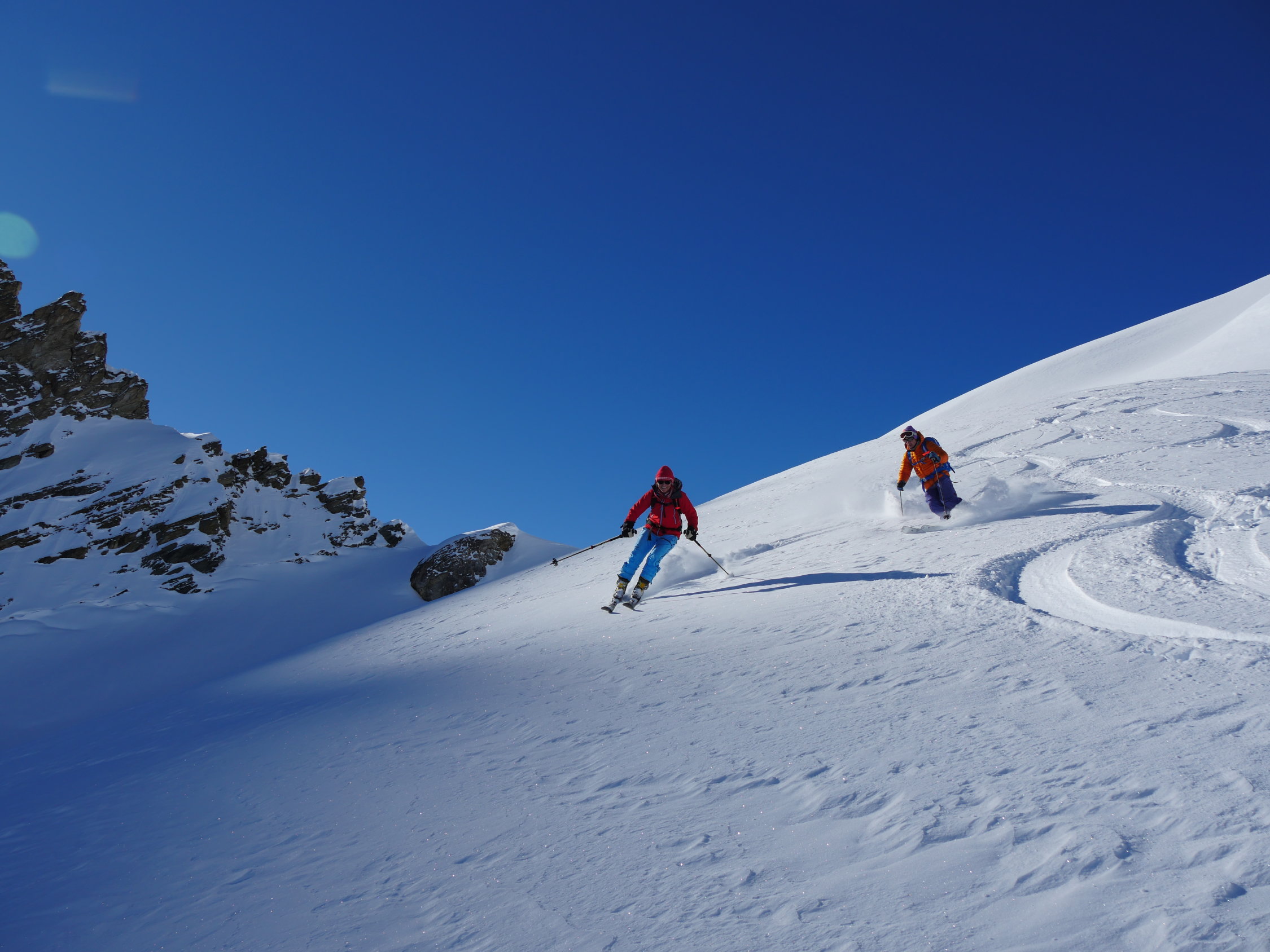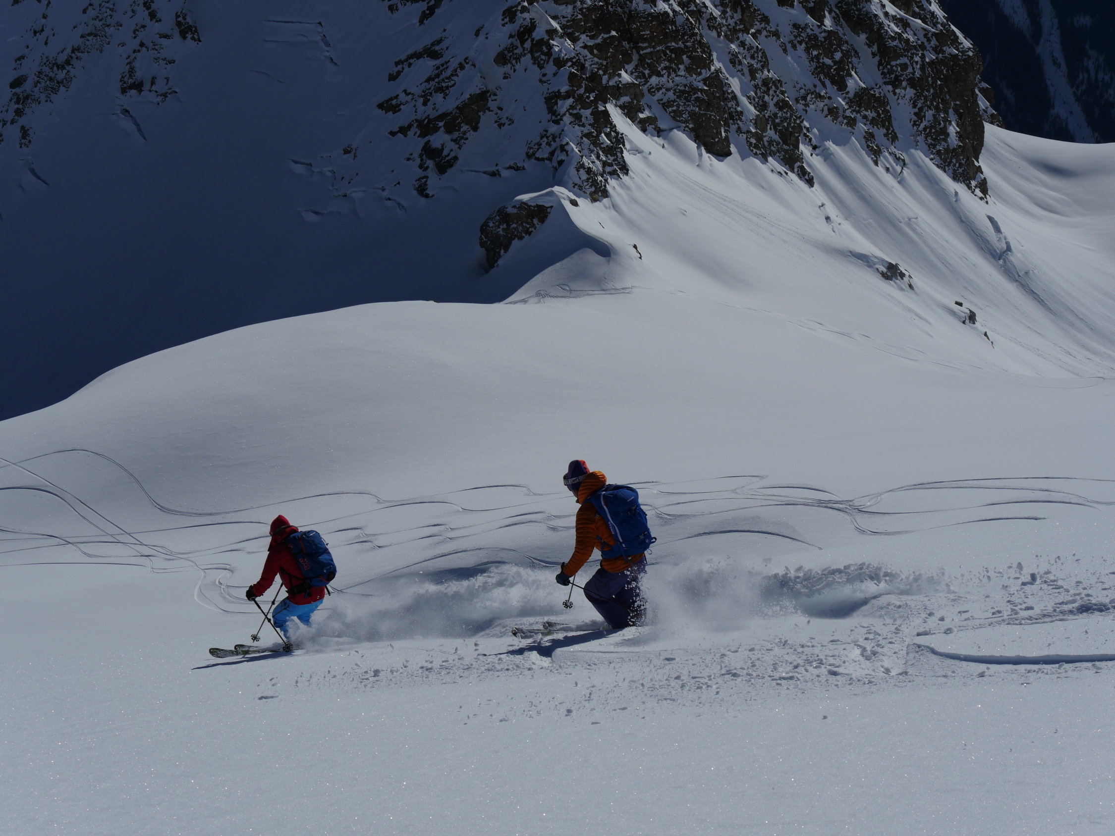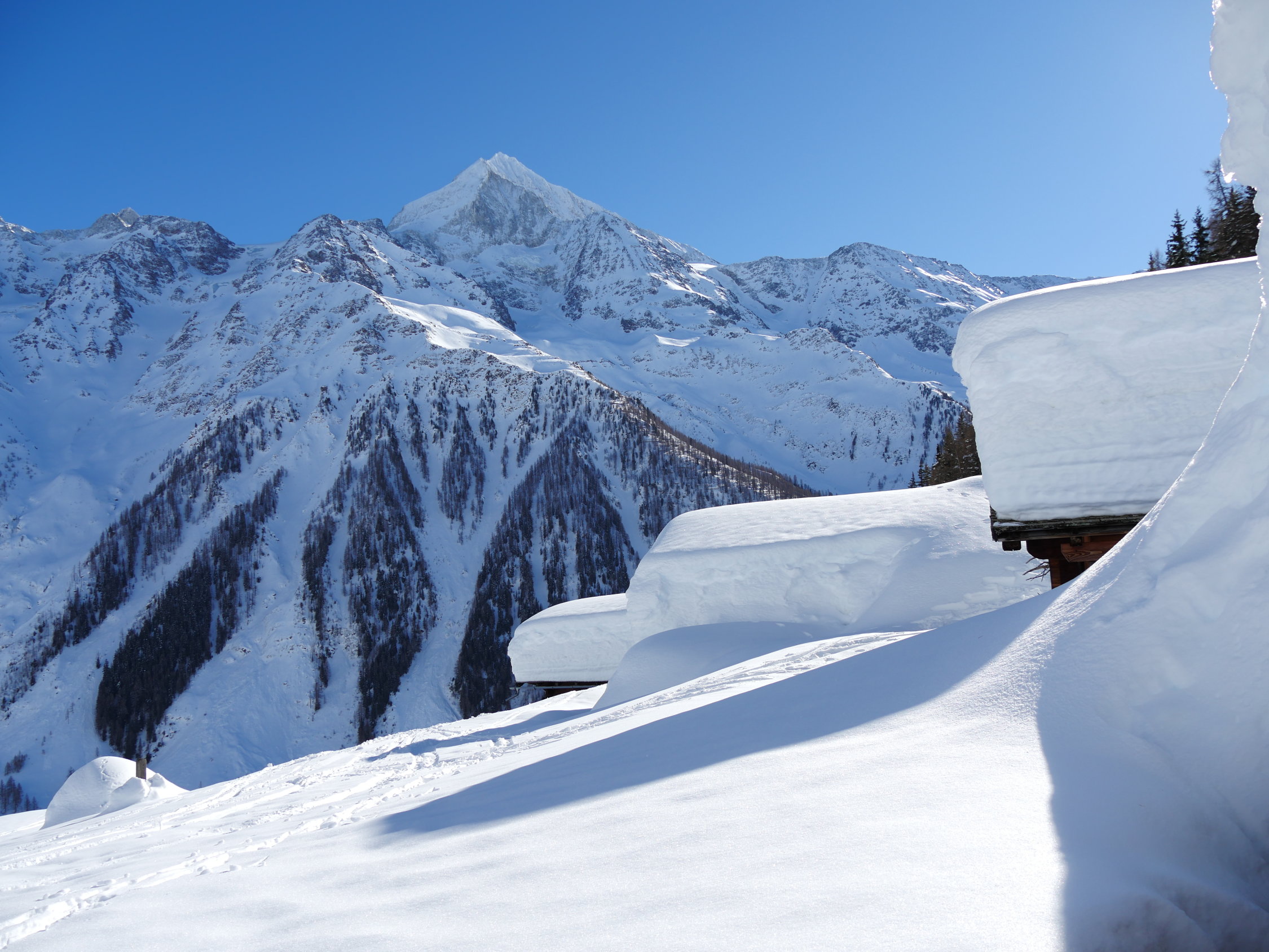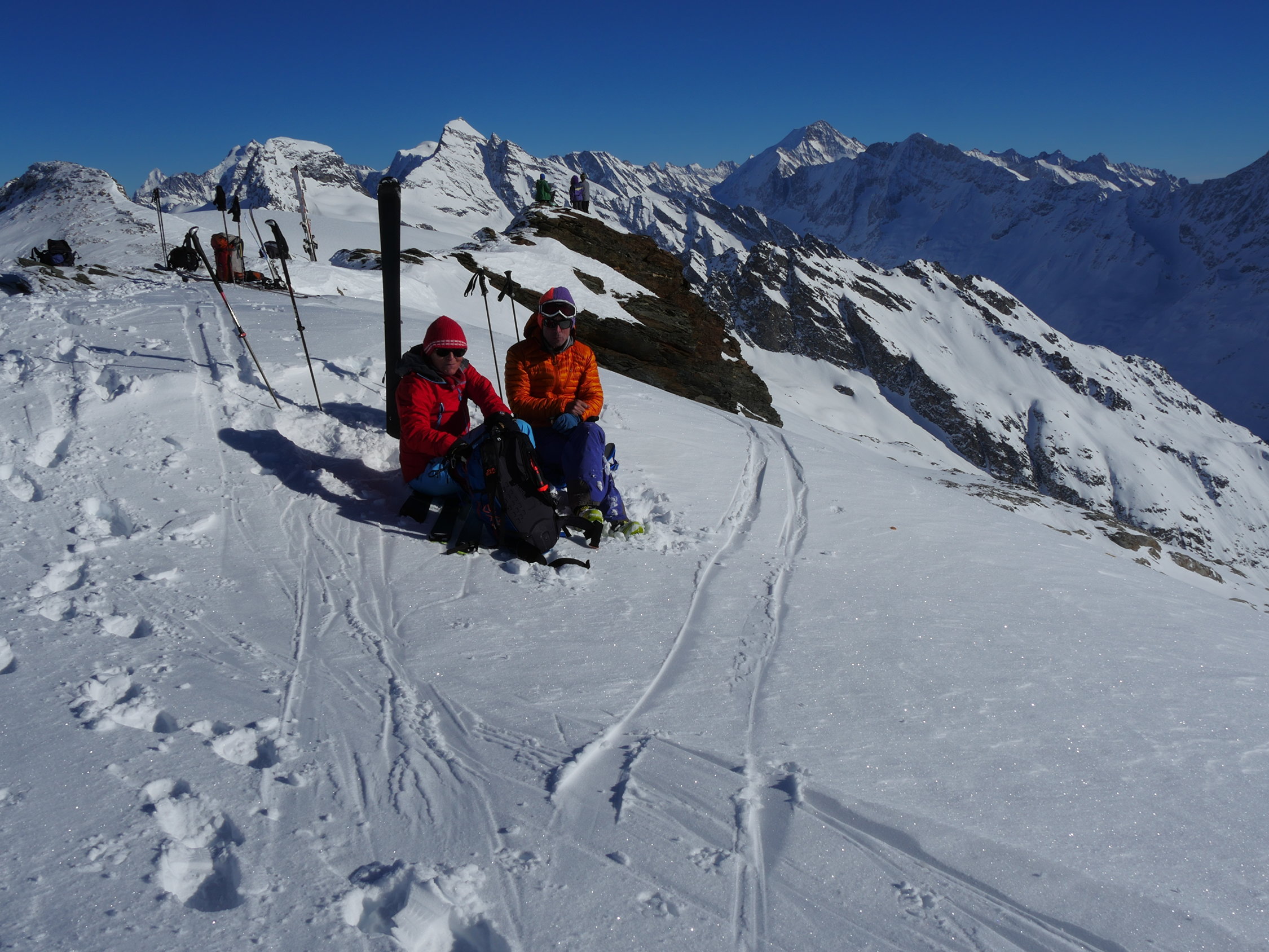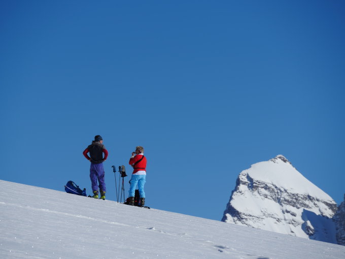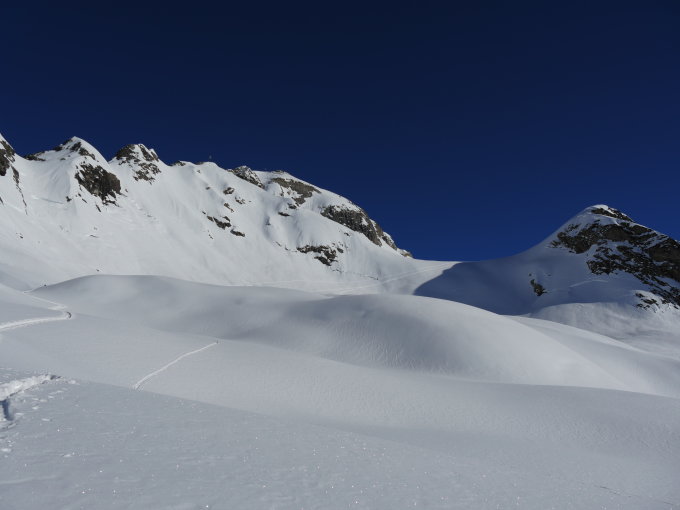 Pulver gut und wenig hats auch nicht. Gute Spur bis zum Gipfel, hier ist zum Teil hart und abgeblasen. Sonnseitig bereits leicht gdeckelt, im schattigen Tellin noch recht pulvrig. In den unteren steilen Passagen auch Windgepresst. Richtung Blatten bereits tragfähig aufgesulzt.Hat Spass gemacht. Danke Carlo und Ruth für die Geduld.