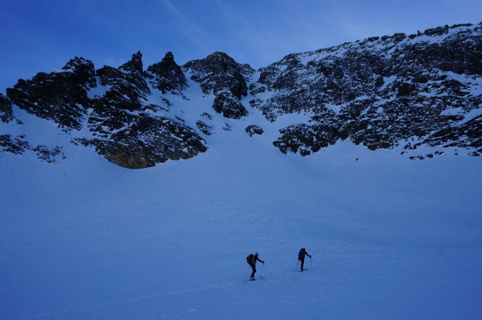 Die Rinne in gutem Presspulver, sehr gut zu gehen und zu fahren. Ausstieg mit Ski nicht möglich, Depot kurz vor dem Grat und leicht über eingeschneite Felsen. Das Riiterkar hart, aber kein Bruchharsch, viel Schnee auf der Forsstraße.