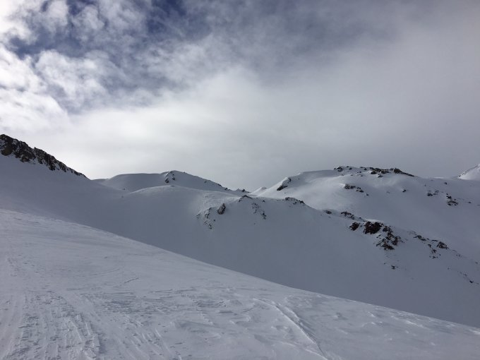In der Abfahrt vom Maschgenkamm noch pickelhart. Der Aufstieg durch Zastrugis und auf einem fiesen Deckel liess Schlimmes befürchten für die Abfahrt.