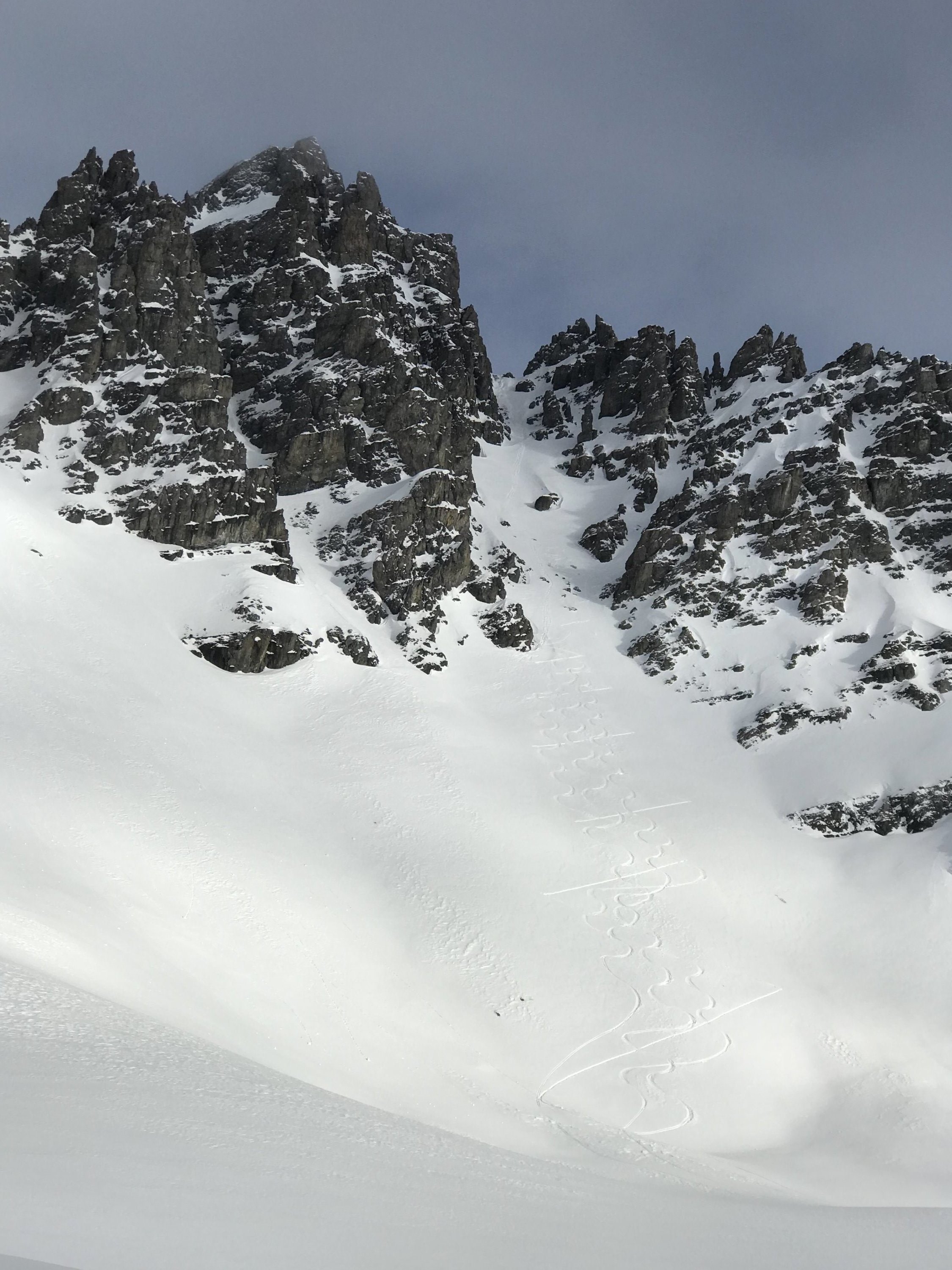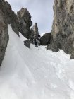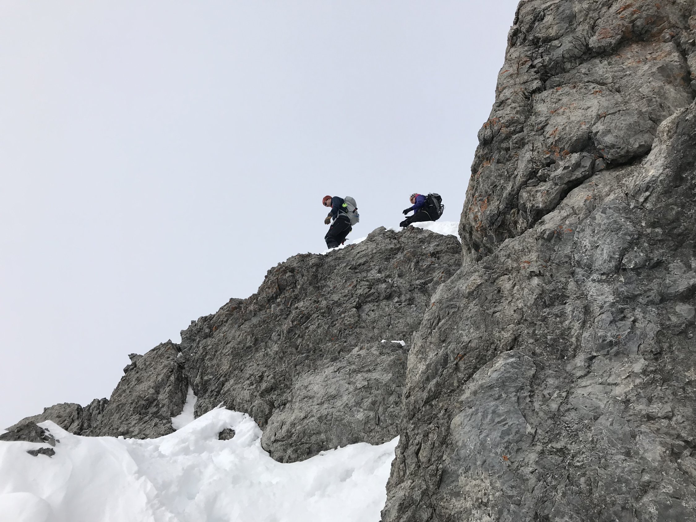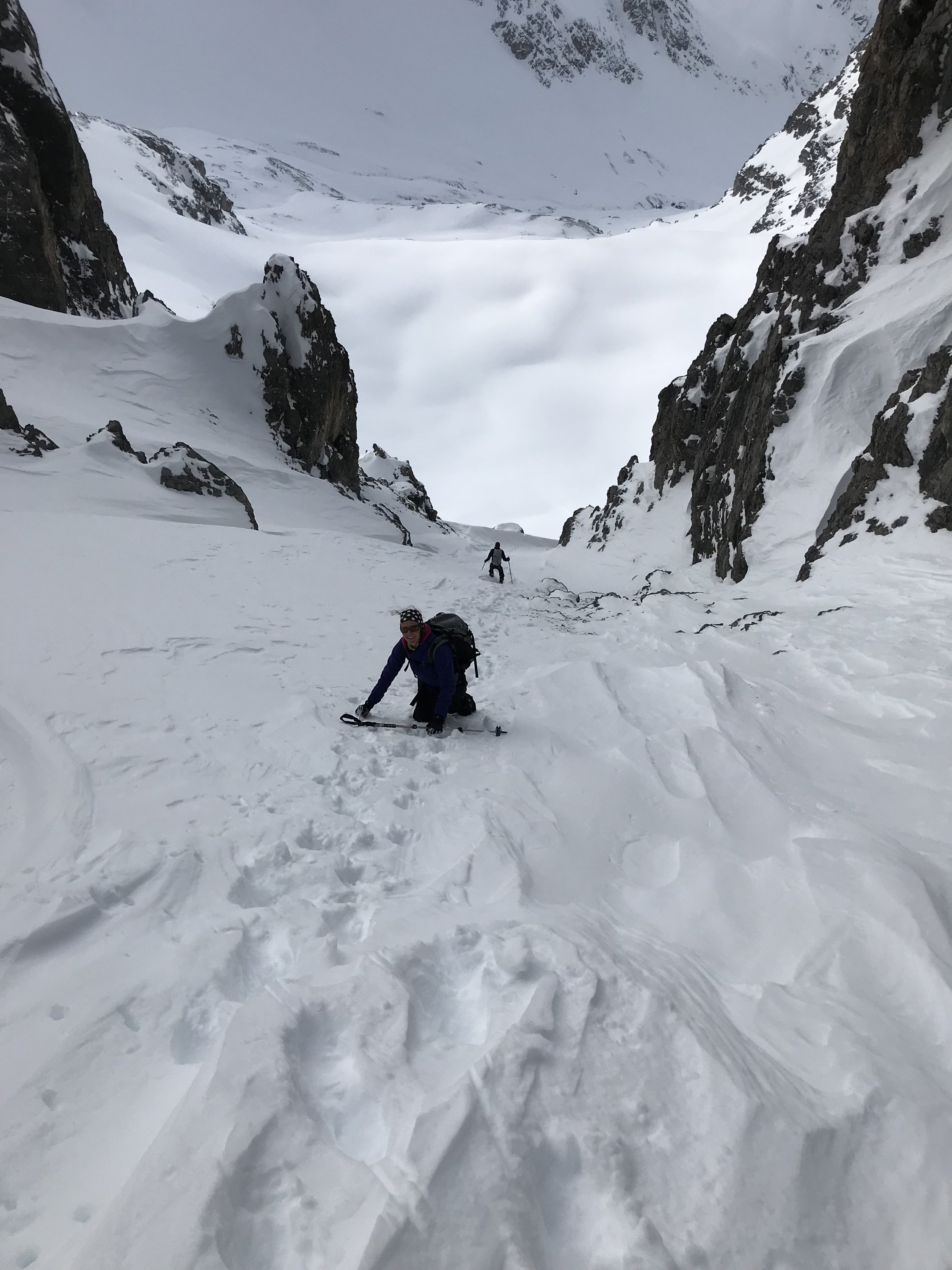 Grosse Couloir in die Lücke sehr guter Trittschnee. Für das Couloir am Gipfelaufbau ebenfalls guter Trittschnee. Dazwischen mehrere leichte Kletterstellen. Pickel und Steigeisen notwendig. Fussaufstieg Skidepot bis Gipfel ca. 1.5h.