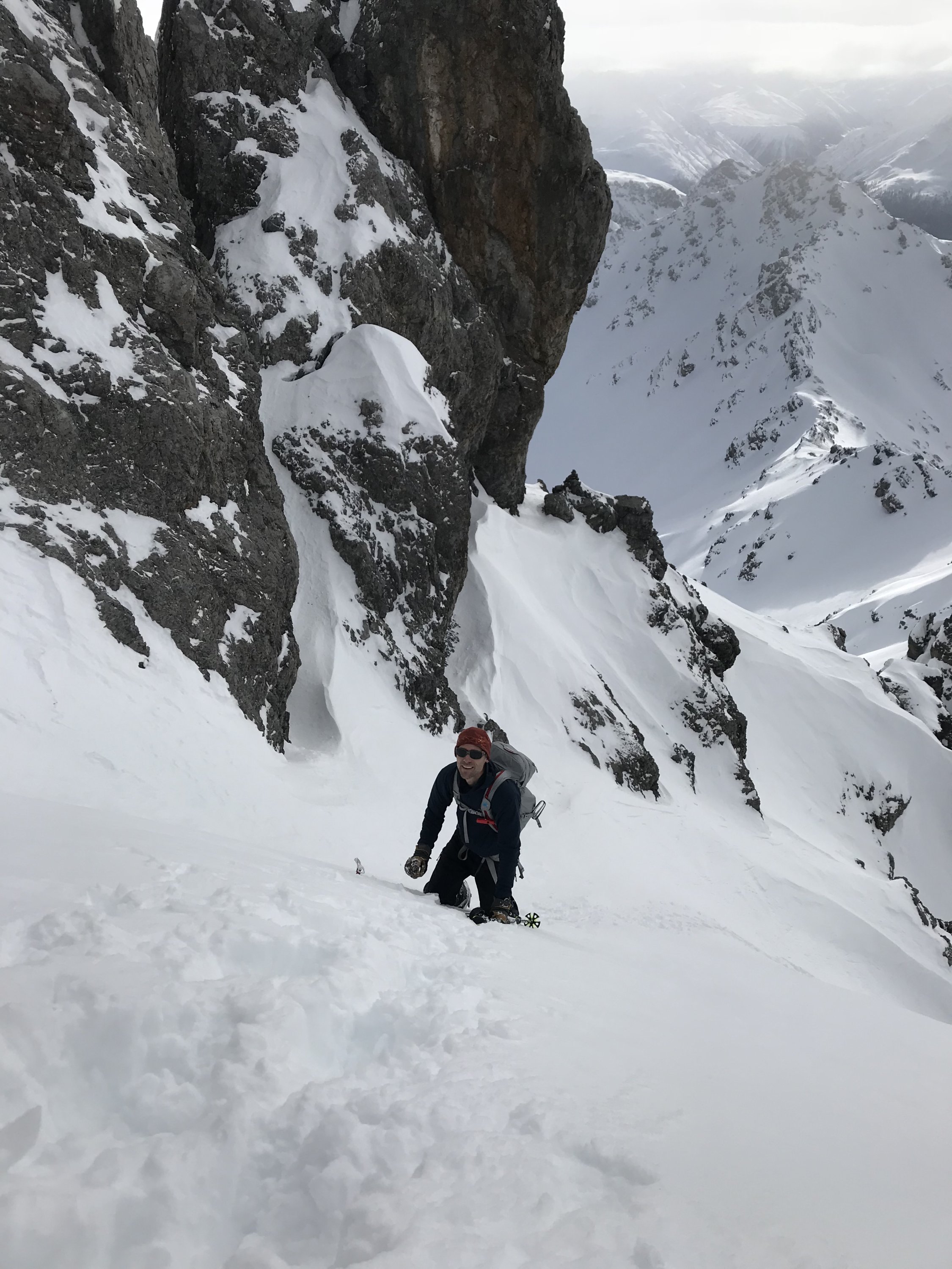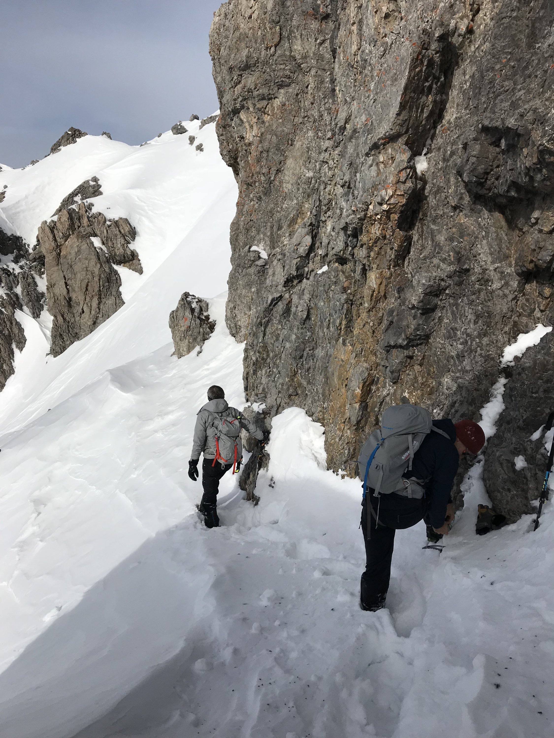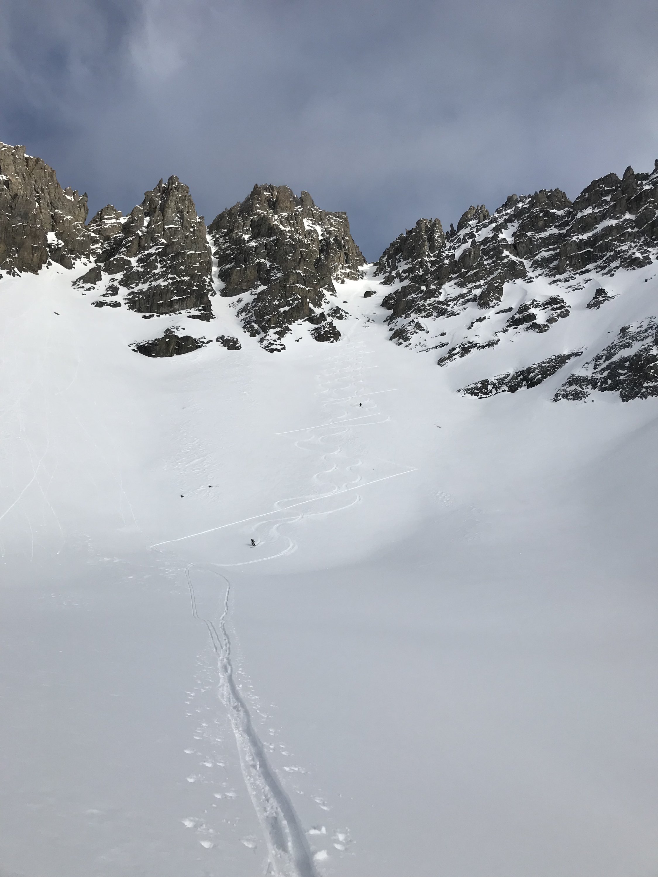 Grosse Couloir in die Lücke sehr guter Trittschnee. Für das Couloir am Gipfelaufbau ebenfalls guter Trittschnee. Dazwischen mehrere leichte Kletterstellen. Pickel und Steigeisen notwendig. Fussaufstieg Skidepot bis Gipfel ca. 1.5h.