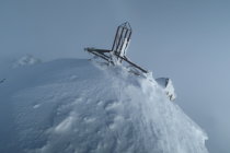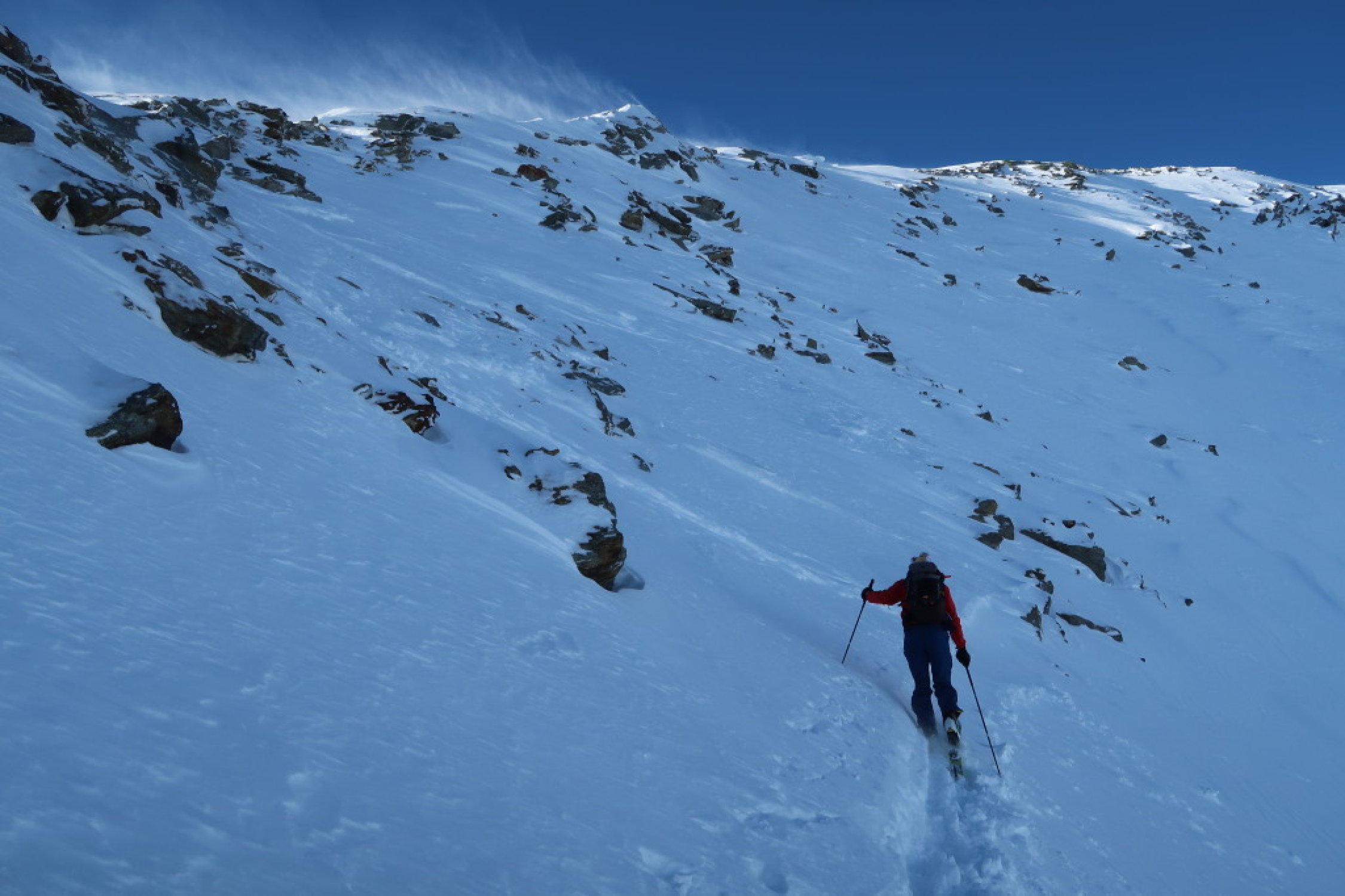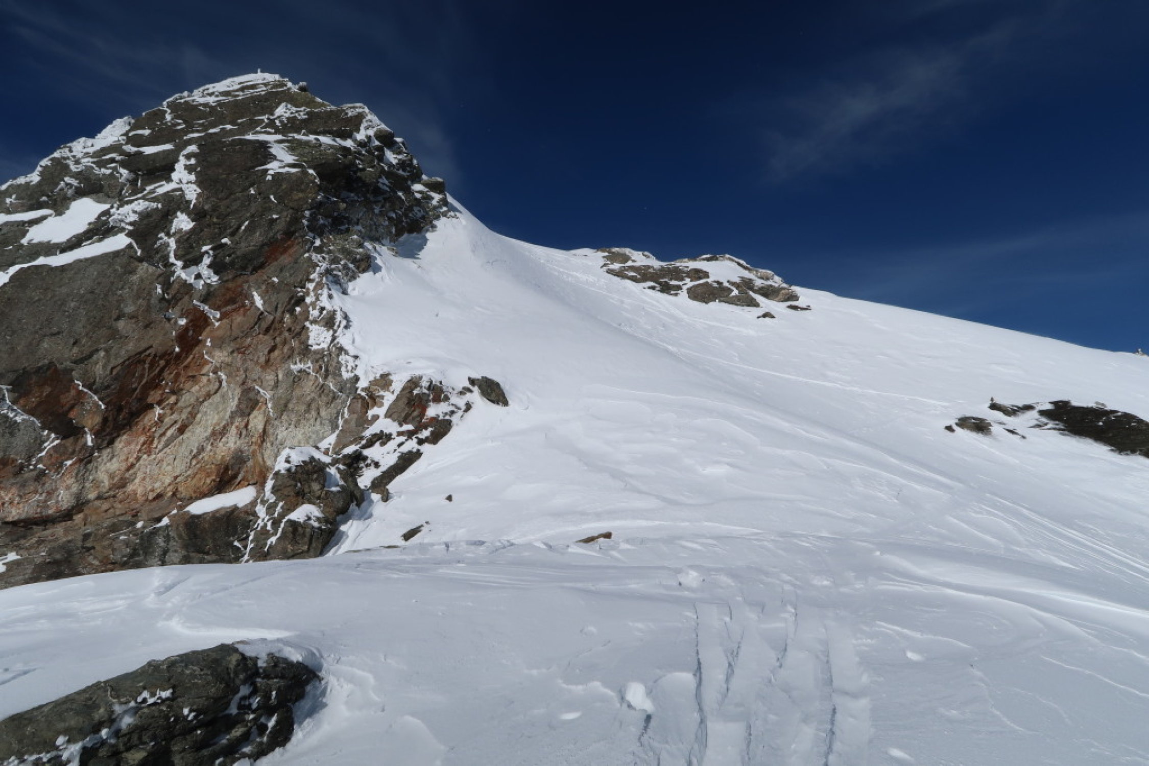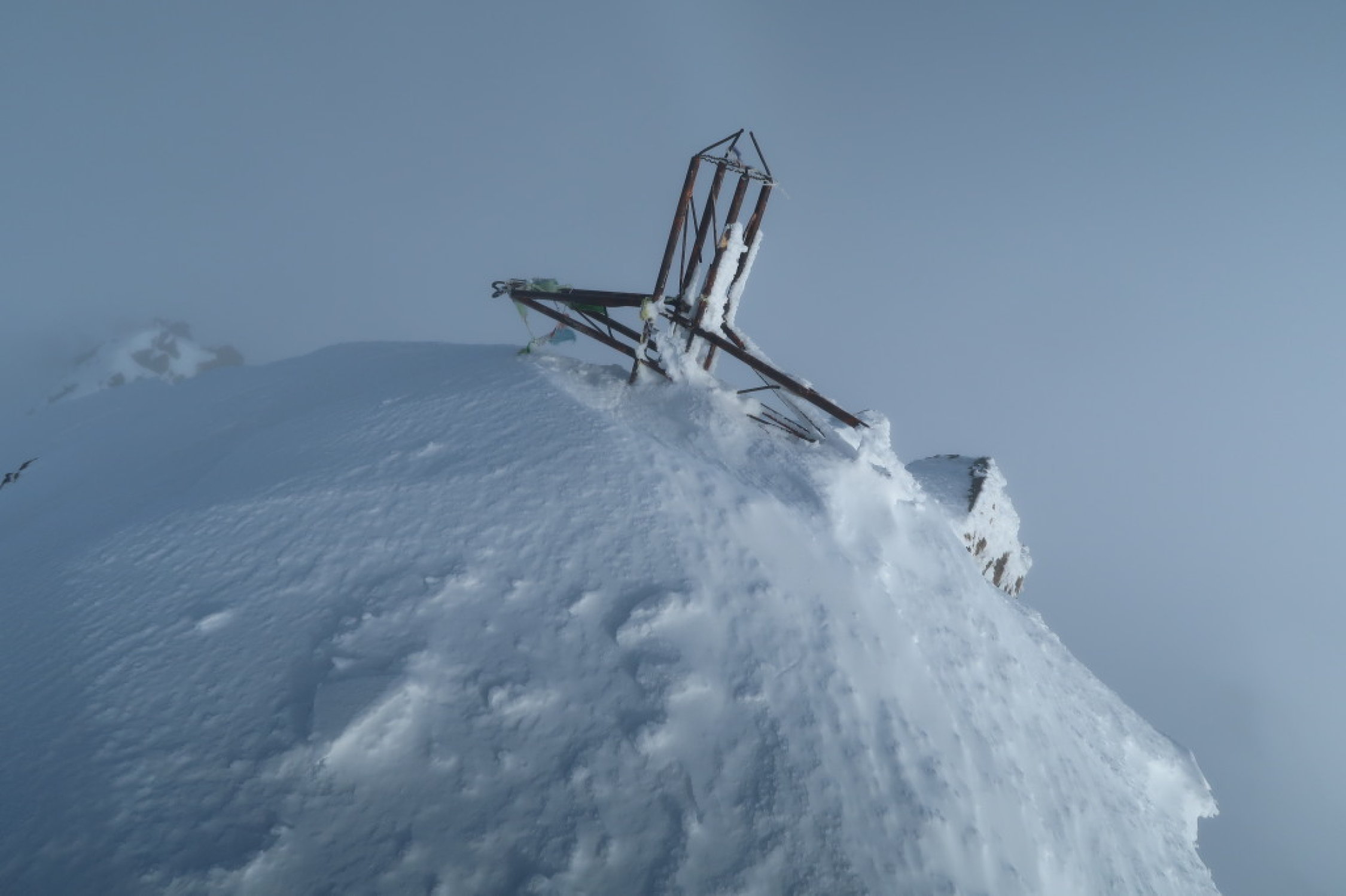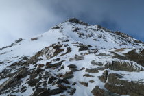 Der Aufstieg bis zum Skidepod ist sehr gut. Den Fussaufstieg auf den Gipfel machten wir mit Steigeisen. Das ist im Moment zu empfehlen. Es liegt viel Schnee im Gipfelbereich. Wir sanken im oberen drittel Hüfttief ein. Im oberen Gipfeldrittel liegt nicht sehr guter Trittschnee. Auf dem Gipfel herrschte starker Wind.
