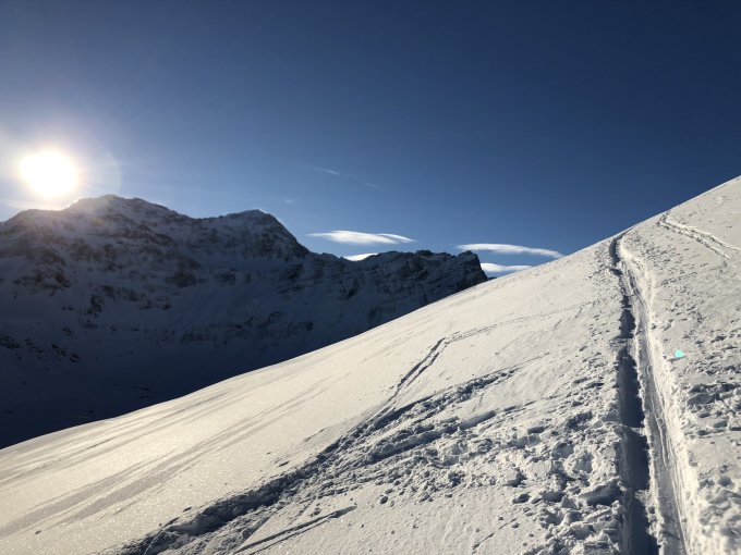 Gute Spur, Schnee oben noch pulvrig, gepresst, später mit Deckel, unten schwerer. Ca 30 Leute am Berg. Die meisten sind über die Aufsstiegsspur zurück (also über den Grat).