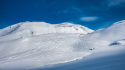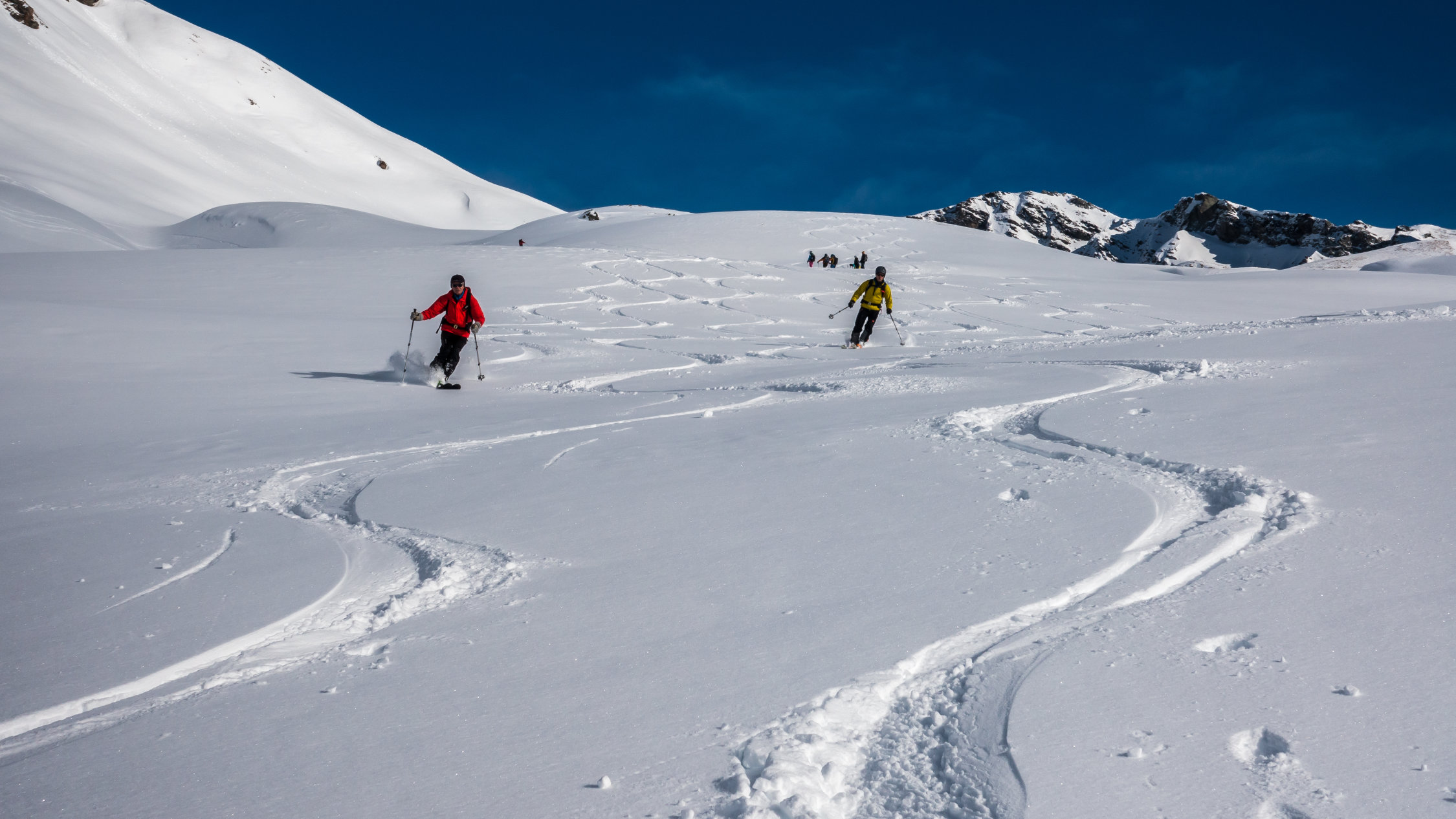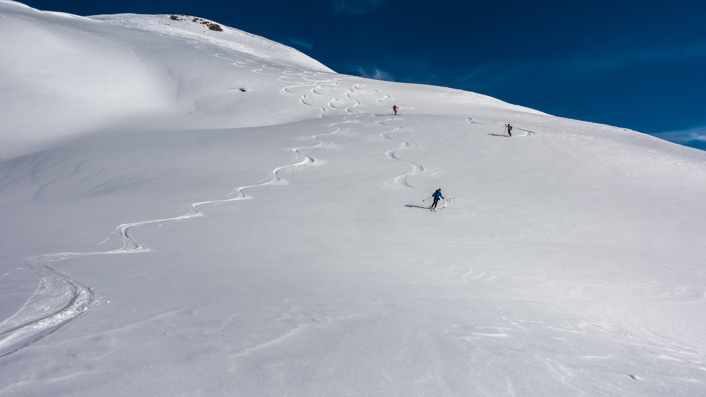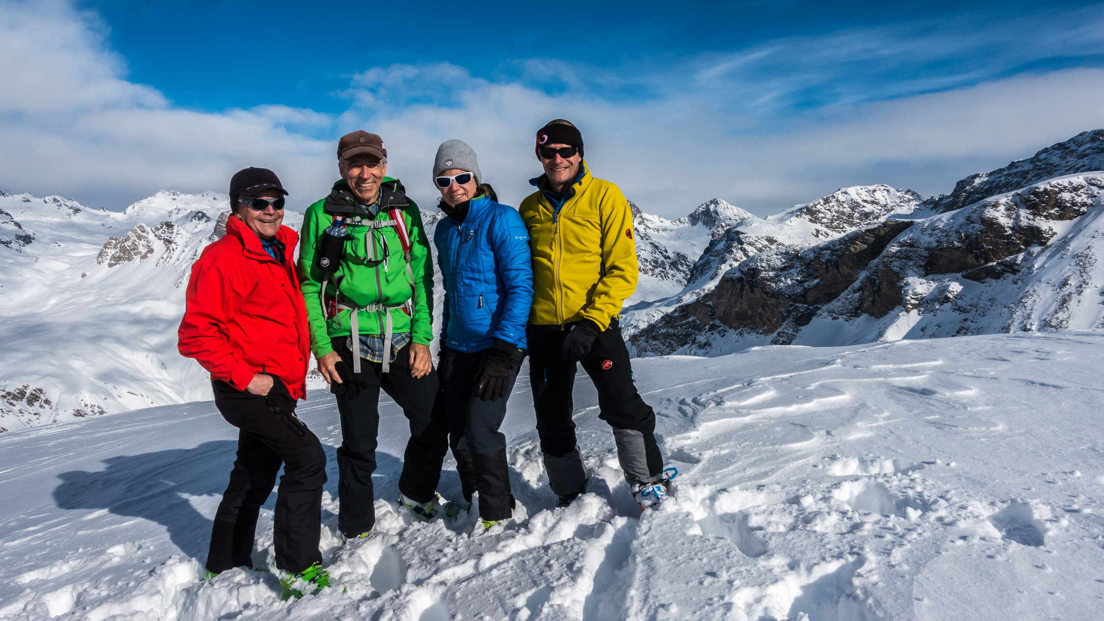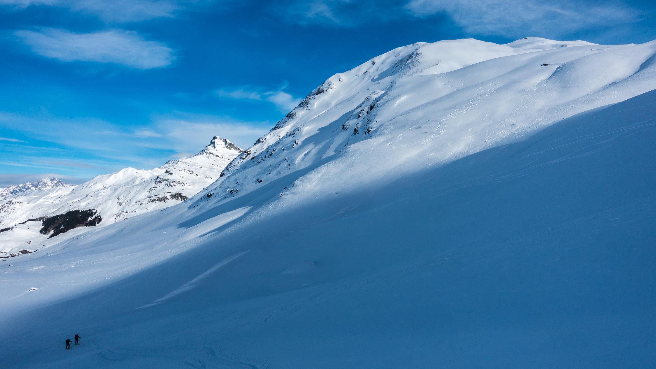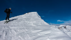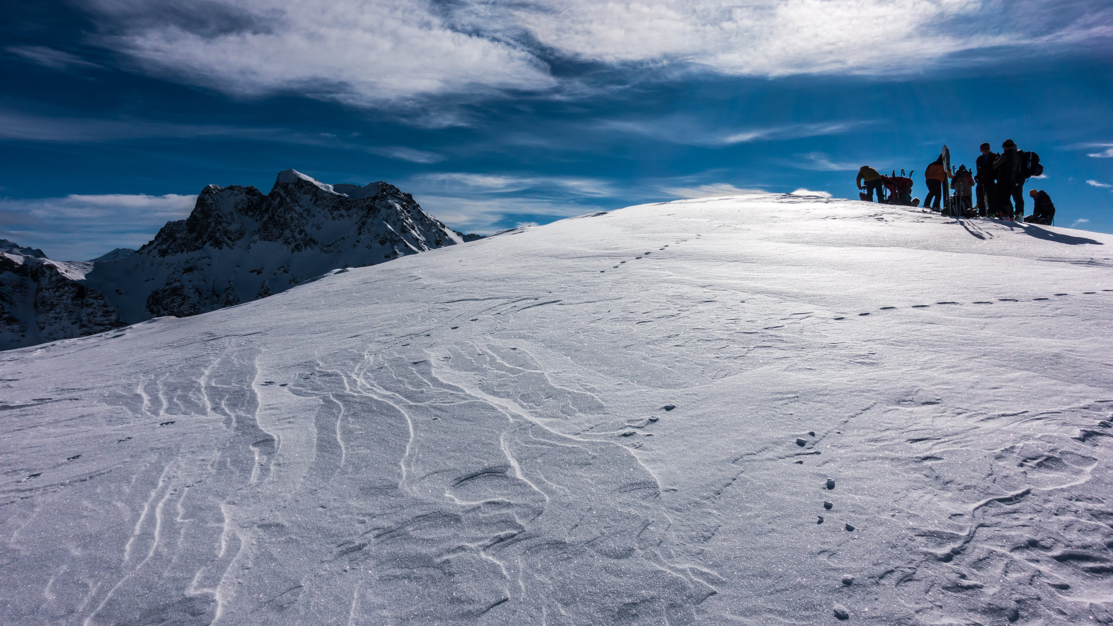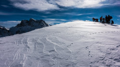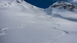 Super Verhältnisse; sonnig und mild, ein paar dünne Wolkenfelder aus Norden. An windgeschützten Hängen von Nordwest über Nord bis Ost herrlicher Pulverschnee. Übrige Hänge z.Teil windgepresster Pulver. Es gab heute noch überraschend viele unberührte Steilhänge.