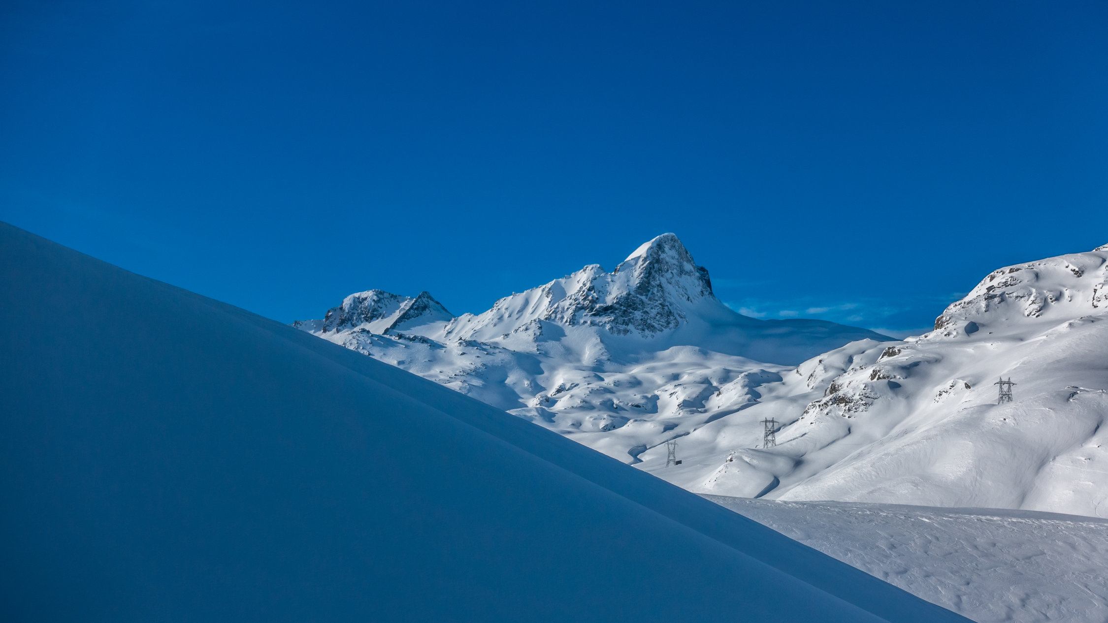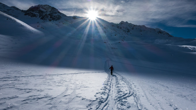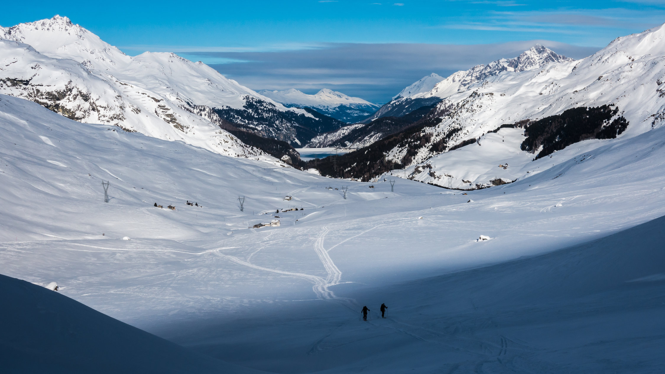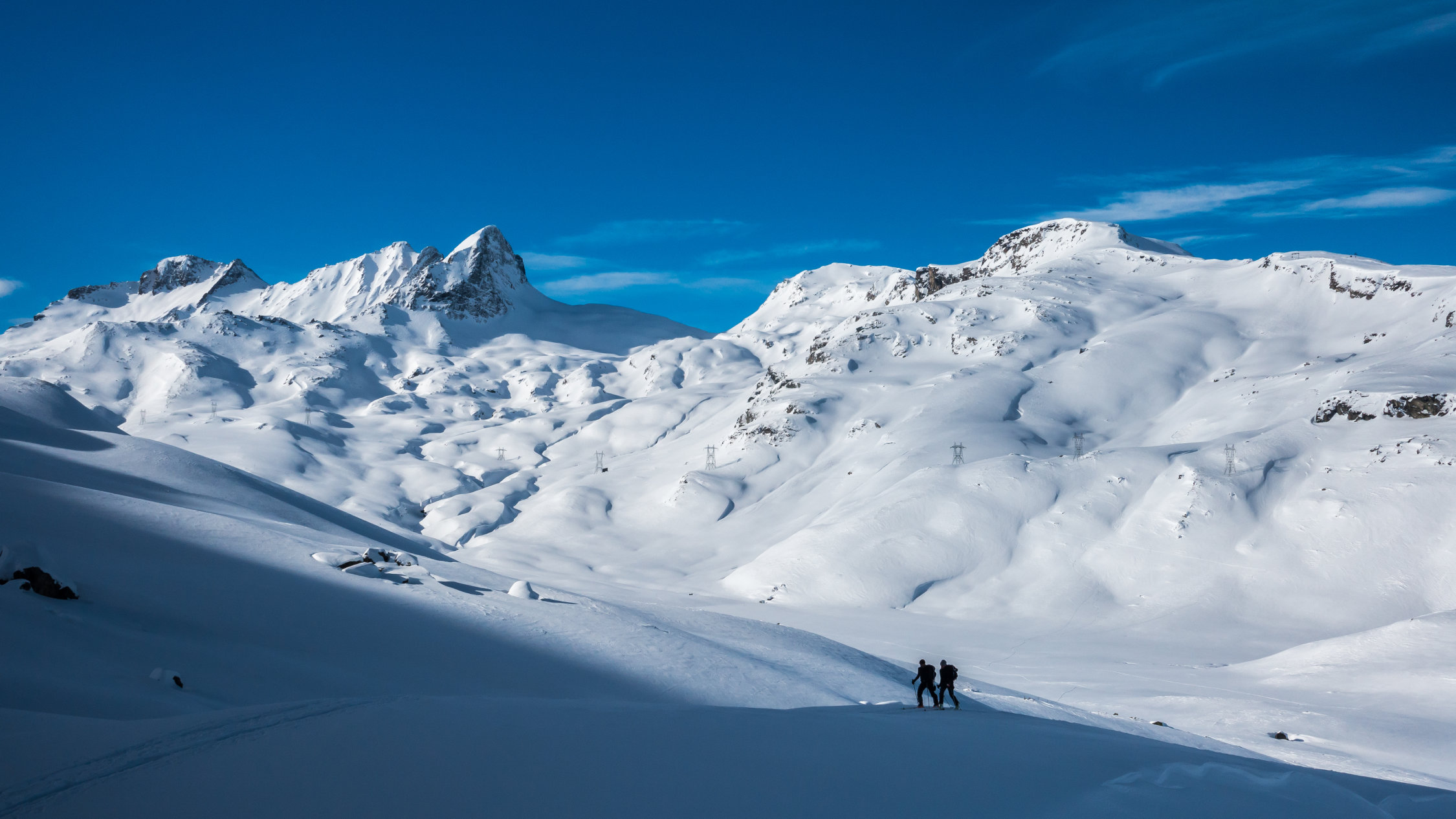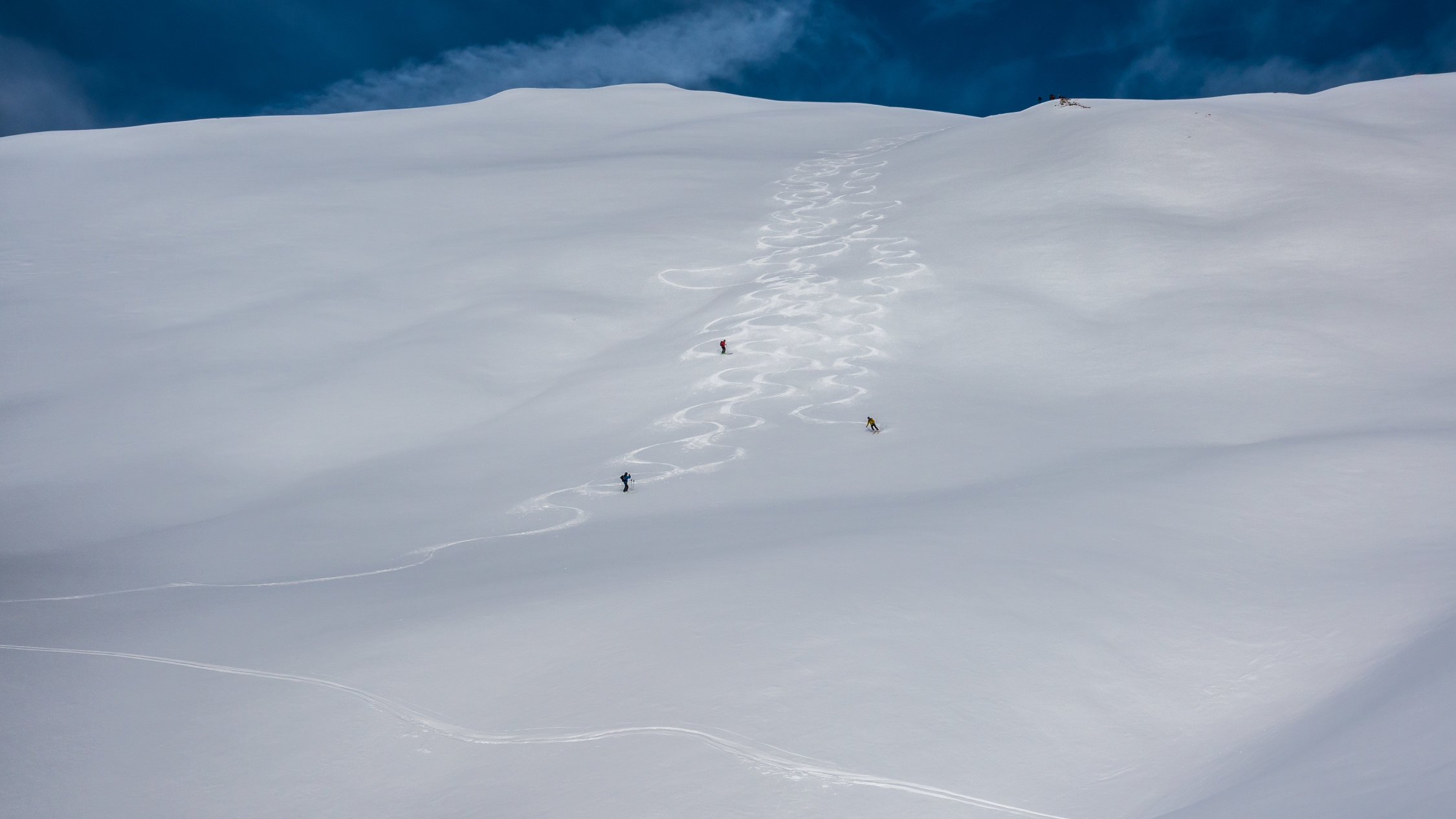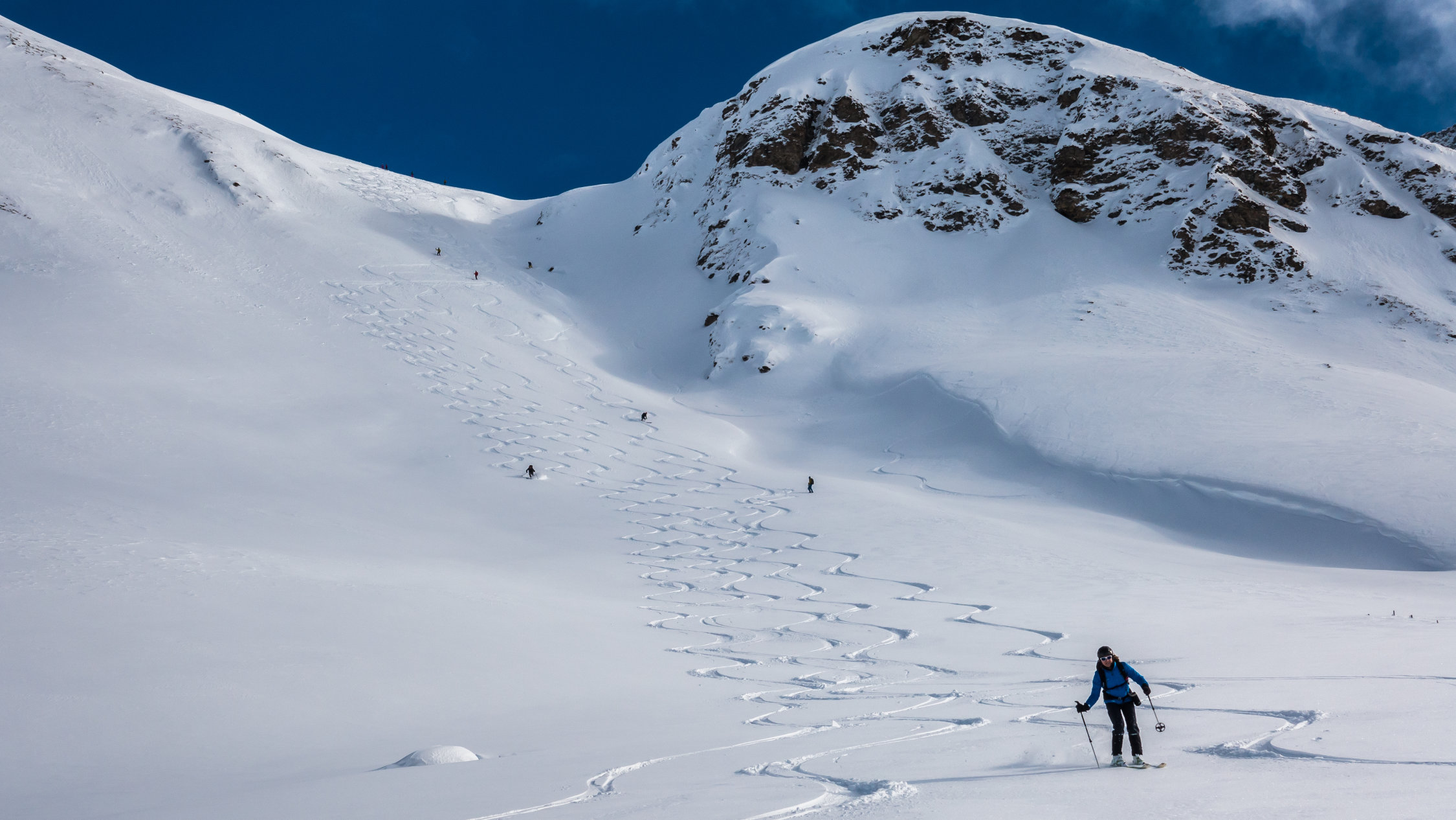 Super Verhältnisse; sonnig und mild, ein paar dünne Wolkenfelder aus Norden. An windgeschützten Hängen von Nordwest über Nord bis Ost herrlicher Pulverschnee. Übrige Hänge z.Teil windgepresster Pulver. Es gab heute noch überraschend viele unberührte Steilhänge.