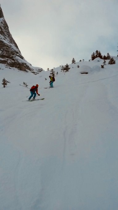 Querung einiger alter Lawinenkegel im Aufstieg. Teilweise im Zwischenstück gedeckelter Bruschharsch im Aufstieg - Abefahrt gut machbar.