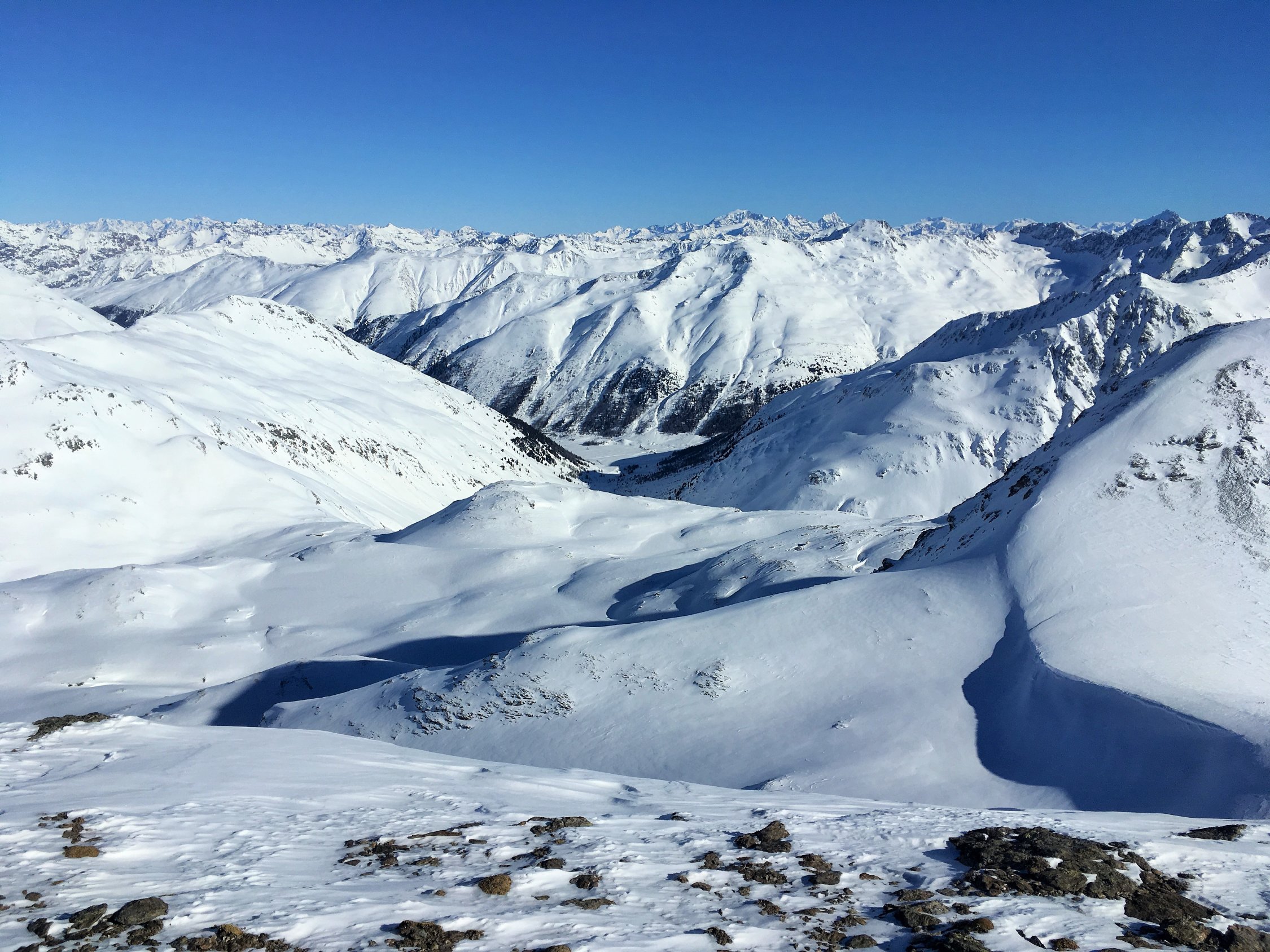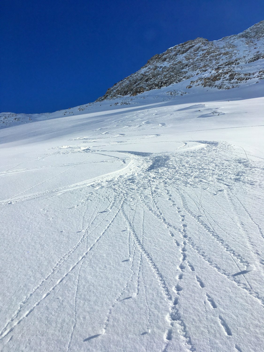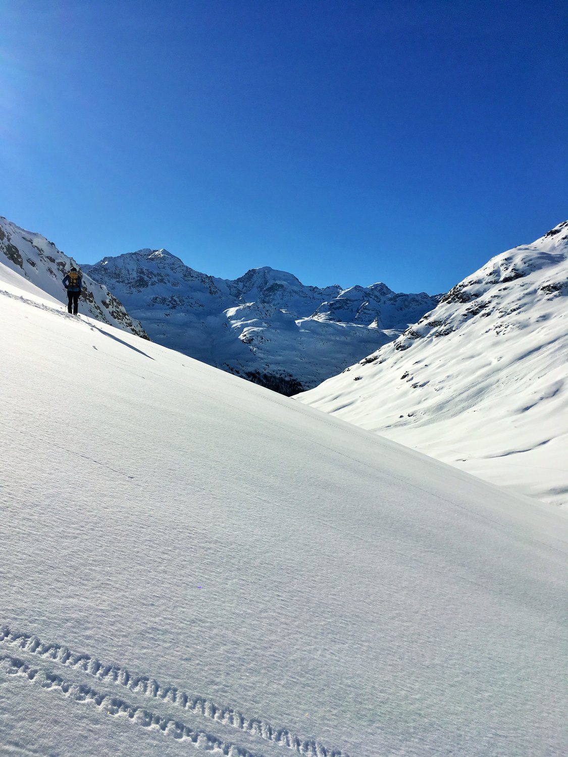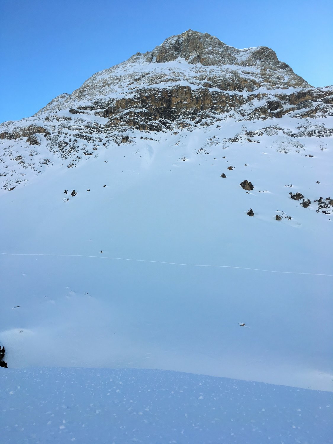 Minus 3 Grad bei Start Parkplatz Diavolezza 2093 m, windstill. Pulverschnee vom feinsten ganze Route. Ausgezeichnete Spur von P. 2582 bis 2832, herzlichen Dank. Von P. 2832 sind wir ziemlich direkt den unverspurten Hang hinauf und dann Richtung Gipfelflanke, wo wieder eine tadellose Spur vorhanden war. Grandiose Rundsicht auf dem Gipfel. Abfahrt ein Genuss mit vielen Hängen für eigene Linie. Wir sind ab P. 2531 auf der linken Talseite des Val da Fain abgefahren, zuerst tolle Schwünge und nachher lange Traverse in einmaliger Winterlandschaft via Laviners dal Piz Alv zu Parkplatz Diavolezza. Sehr zu empfehlen, perfekte Verhältnisse.