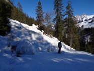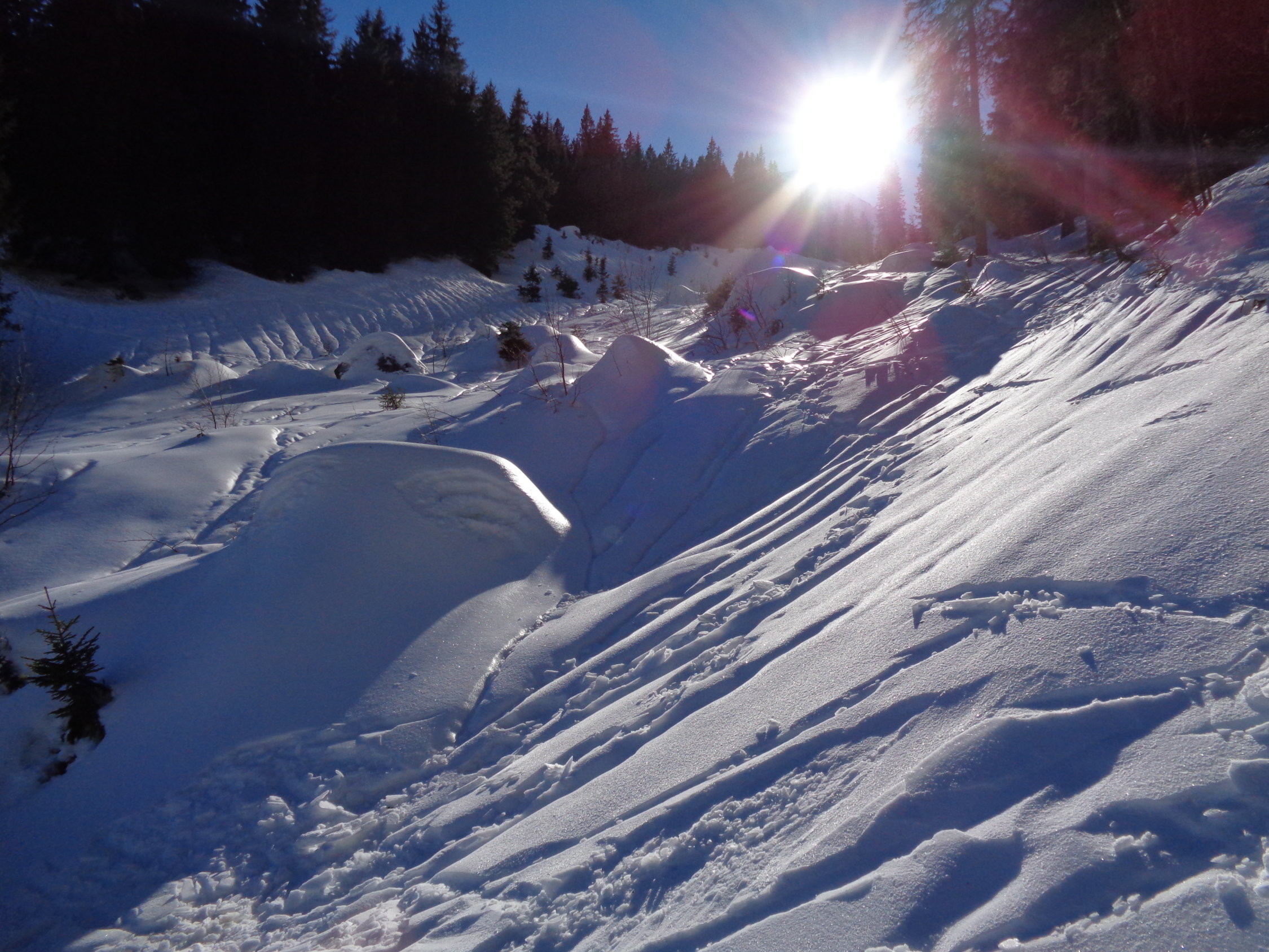 Waldstrasse ins Wildgrimmi: ab der Kiesgrube sehr gute Schneeverhältnisse (vorher am Rand fahr-/begehbar, in der Kiesgrube wird gearbeitet). Eine Riesenlawine hat vermutlich den grösseren Teil der ersten Abkürzung und die Waldstrasse bei der ersten Haarnadelkurve meterweise überdeckt. Die in den letzten Jahren normale Abkürzung geht nicht mehr, aber es gibt ja nur wenig weiter einen parallelen Wanderweg. Bei der Lawine war dann durch den Wald eine Spur hinauf auf die Strasse oberhalb der Kurve. Das wird sich vermutlich diesen Winter nicht mehr ändern! Siehe Bilder.