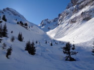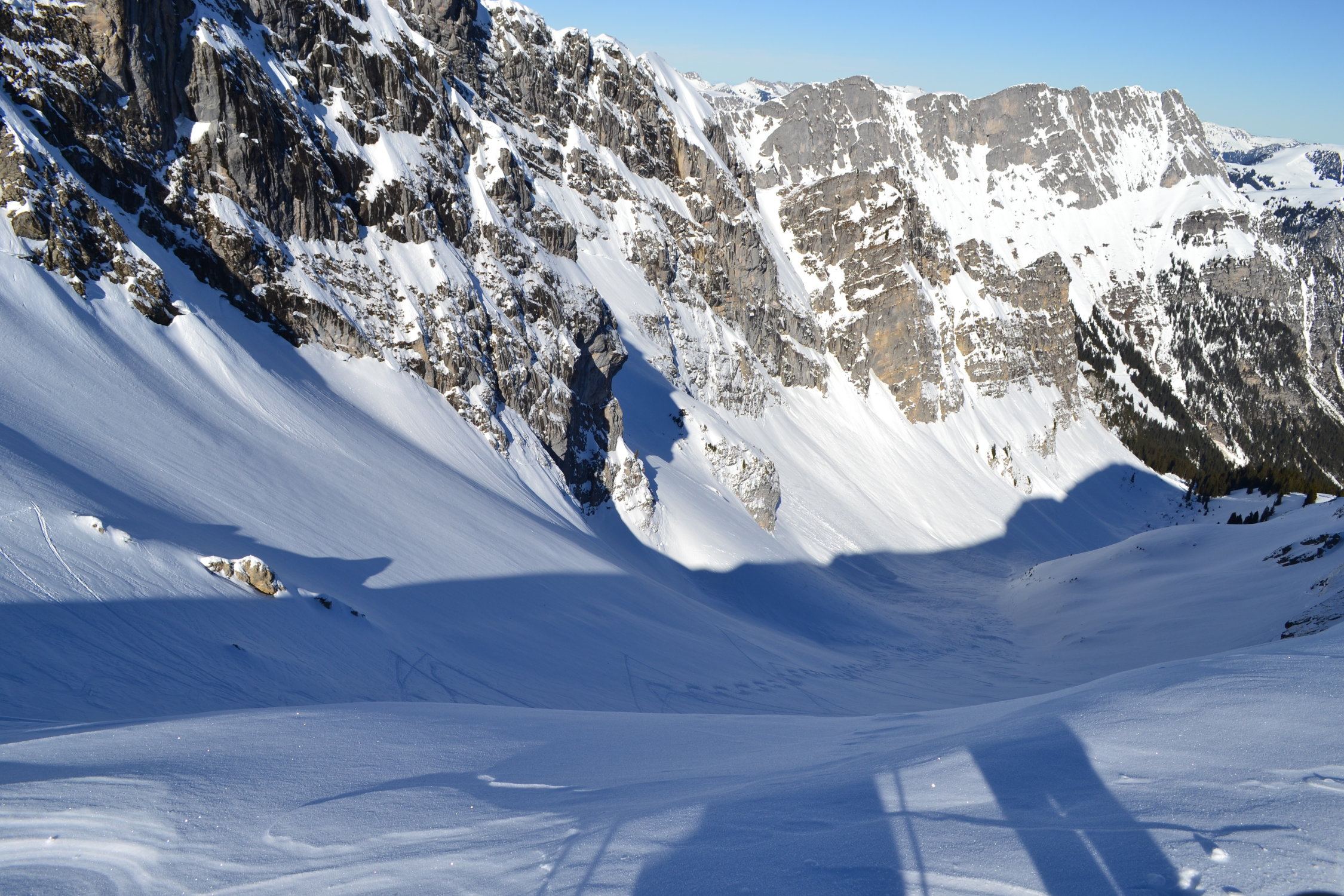 Oberhalb der Waldstrasse hinein ins Wildgrimmital dann die schon oft gelesene Abfolge von ca 100 Hm Eisdeckel, dann ca 100Hm harte Regenrinnen. Im Wildgrimmi bis weit hinauf praktisch der ganze Talboden mit Lawinenschnee übersät (noch nicht genug überschneit, dass man da bedenkenlos hinunterfahren könnte). In der Abfahrt teils etwas Windharsch, aber auch gut fahrbarer Presspulver.