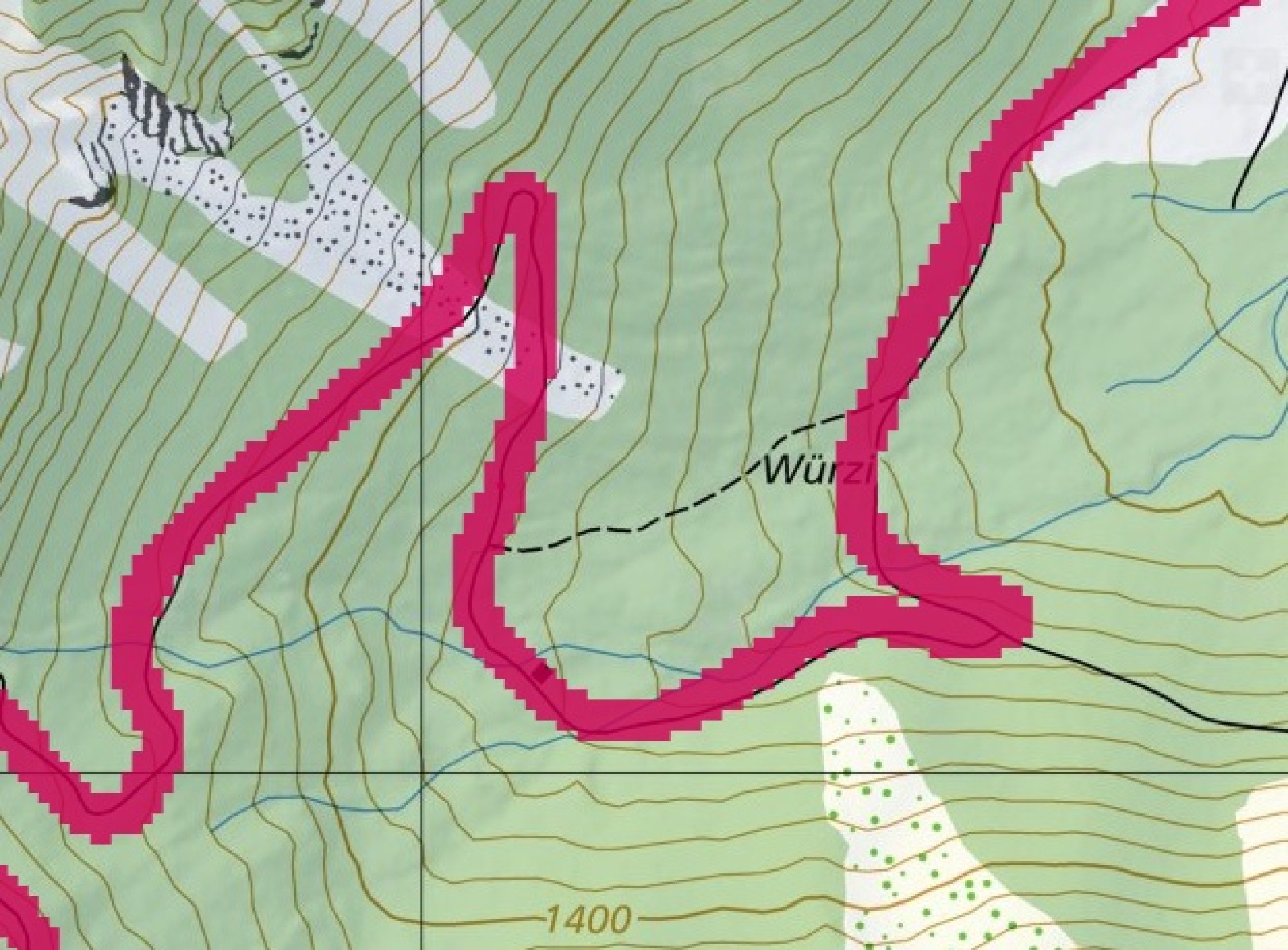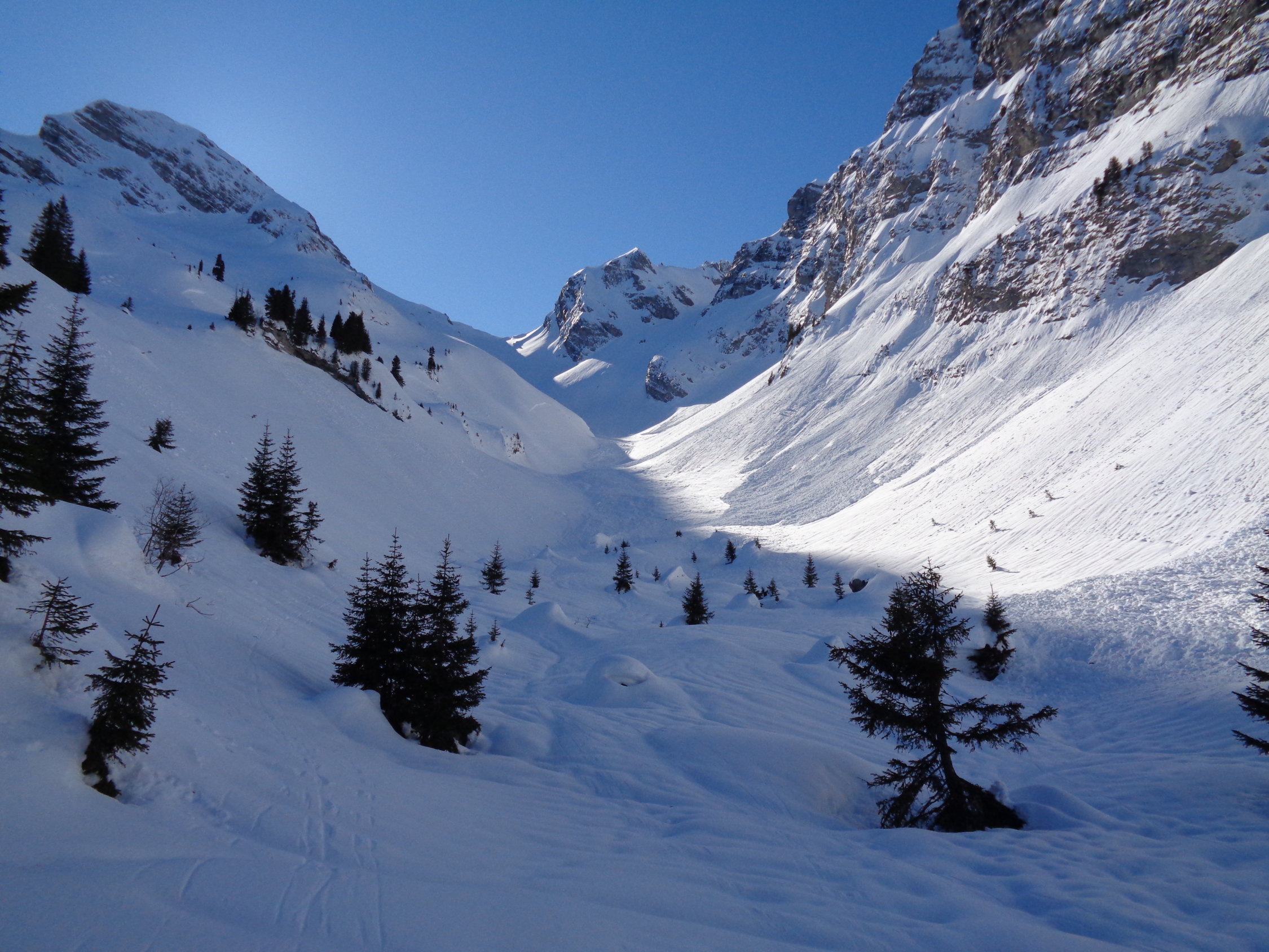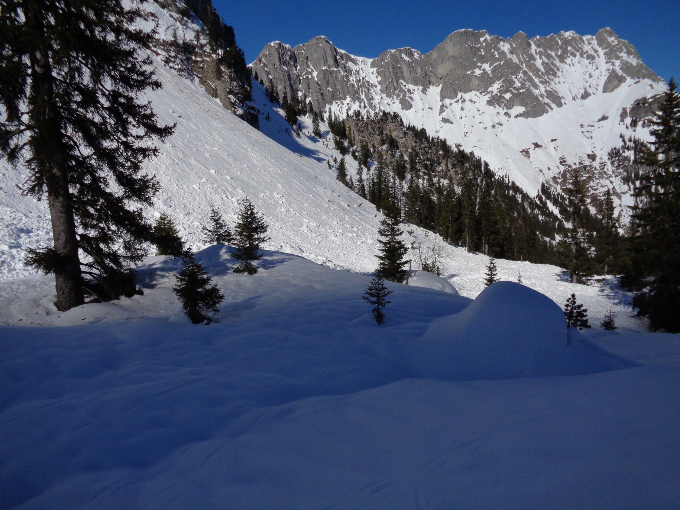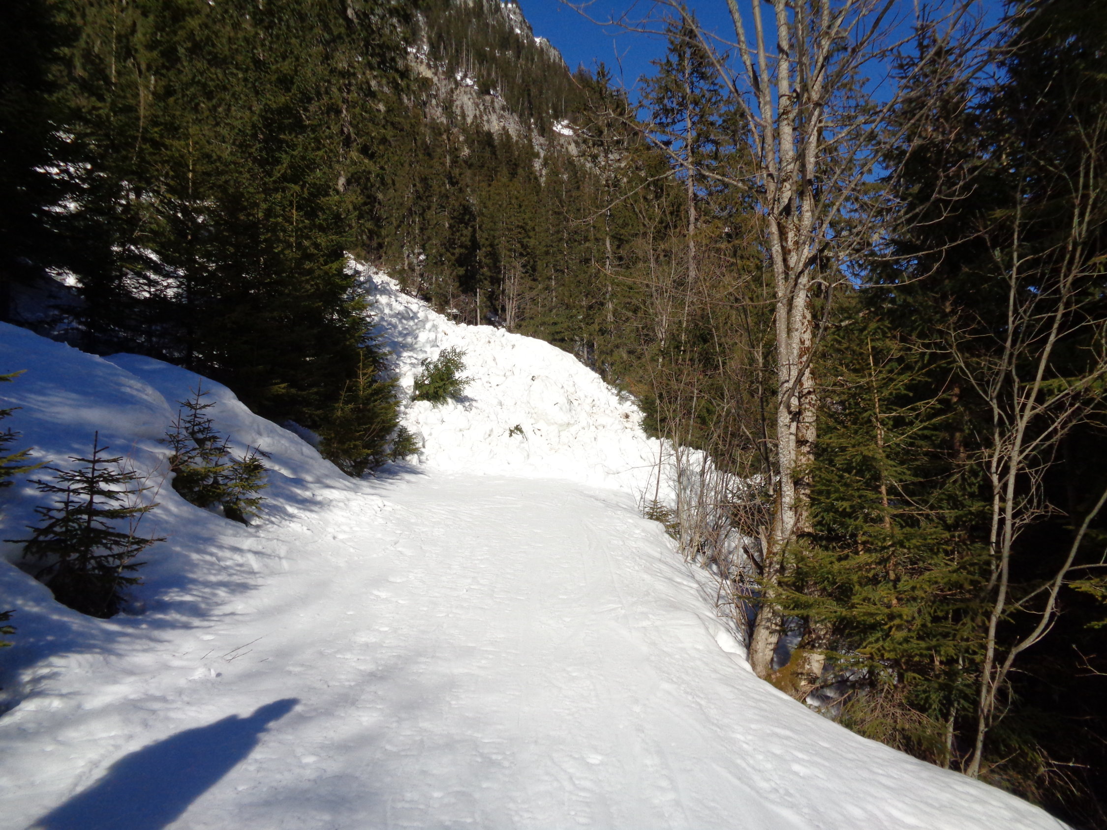 Die Lawine auf der Waldstrasse bliebt. Im Wildgrimmi die Lawinenspuren überschneien lassen...