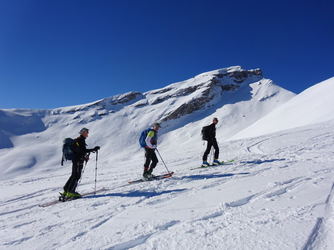 Gipfelhang und mittlerer Teil der Abfahrt bis 2100 m 10 cm Pulver auf festem Untergrund. Weiter unten Sulzschnee, aber noch ordentlich zu fahren. Trotz vielen Spuren findet man in den weiten Hängen teilweise noch Platz für eigene.