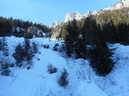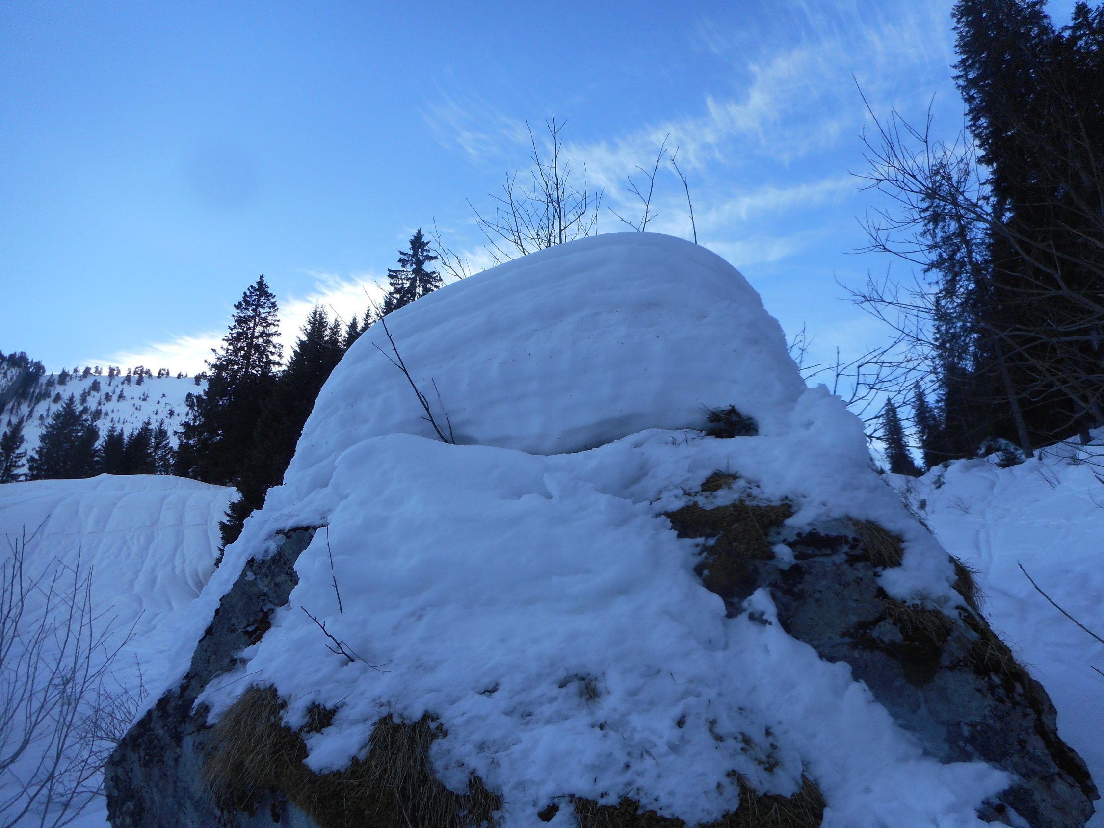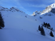 Abfahrt: In der Wildgrimmi noch sehr schöne Pulverschnee auf tragender Unterlage bis 1700m. Kurz vor der Waldstrasse lustiges Wellen fahren. Das gehört auch dazu. Die Waldstrasse auf die Grimmialp ist gut zum Fahren. D. h. auf griffigem Hartschnee.