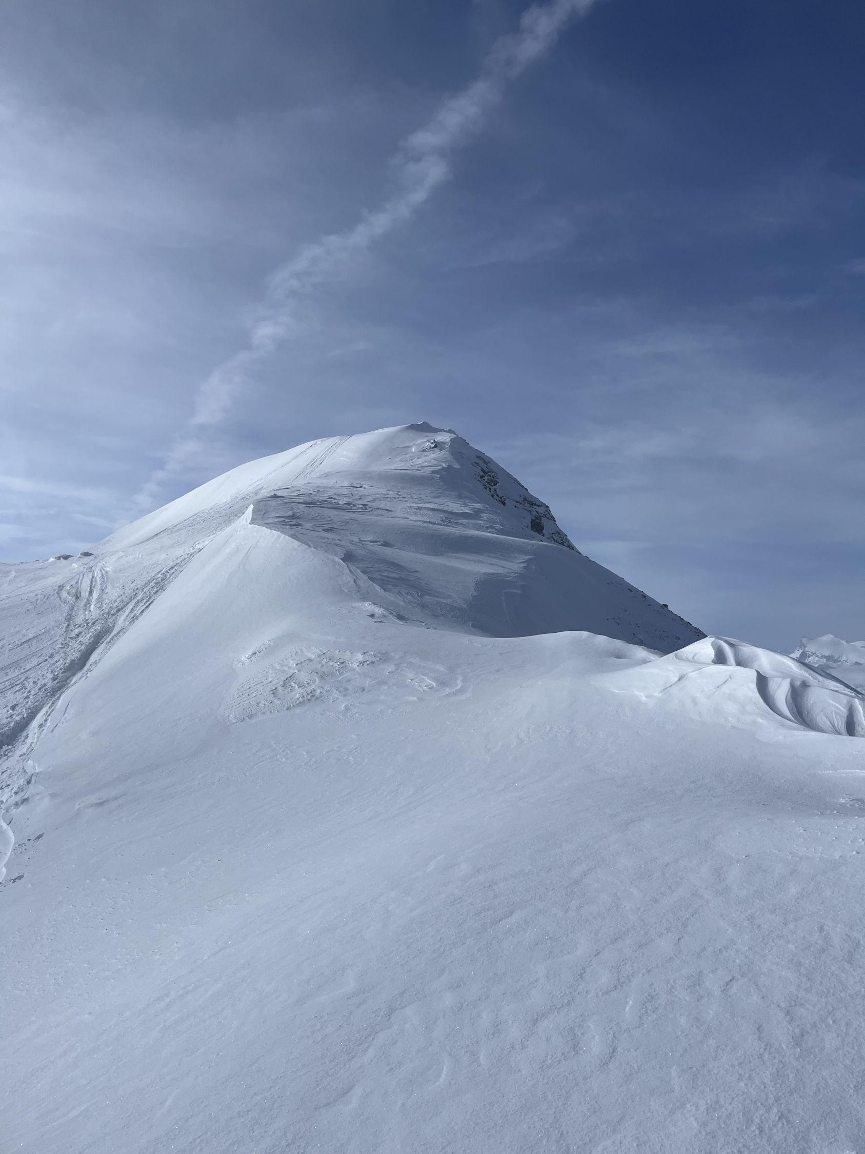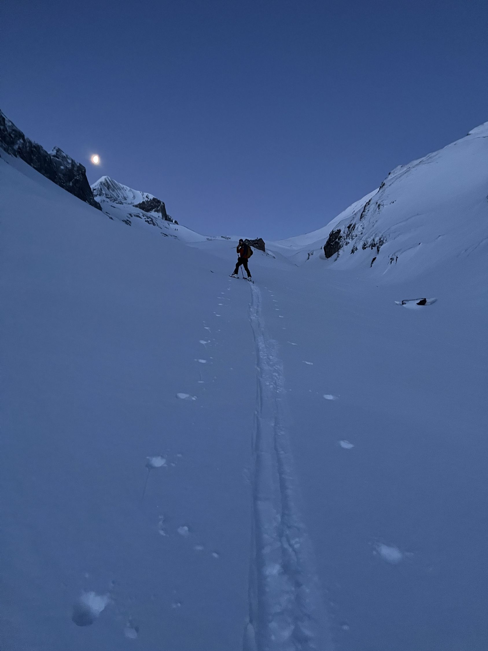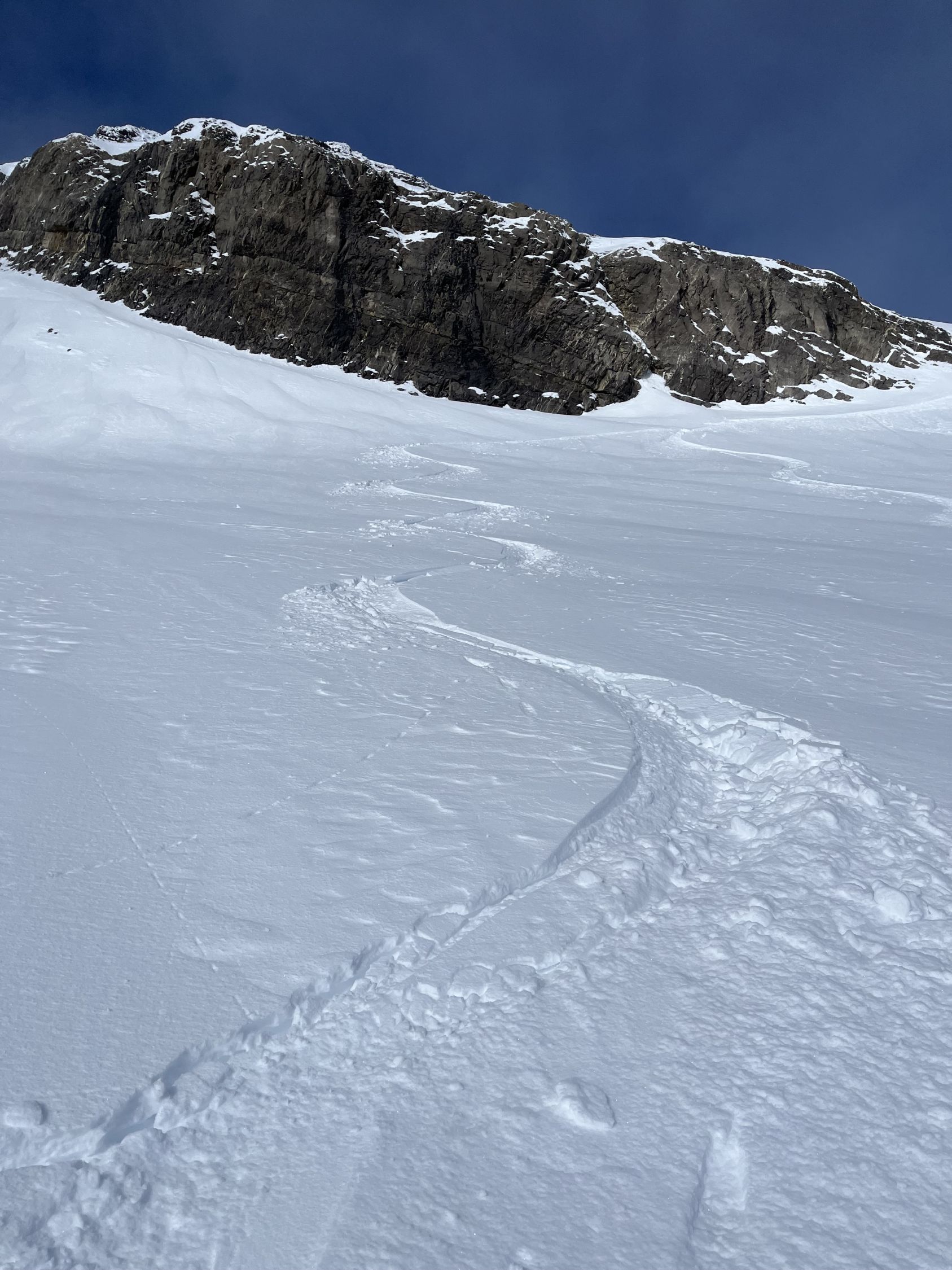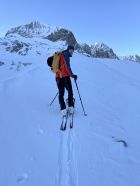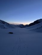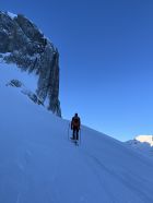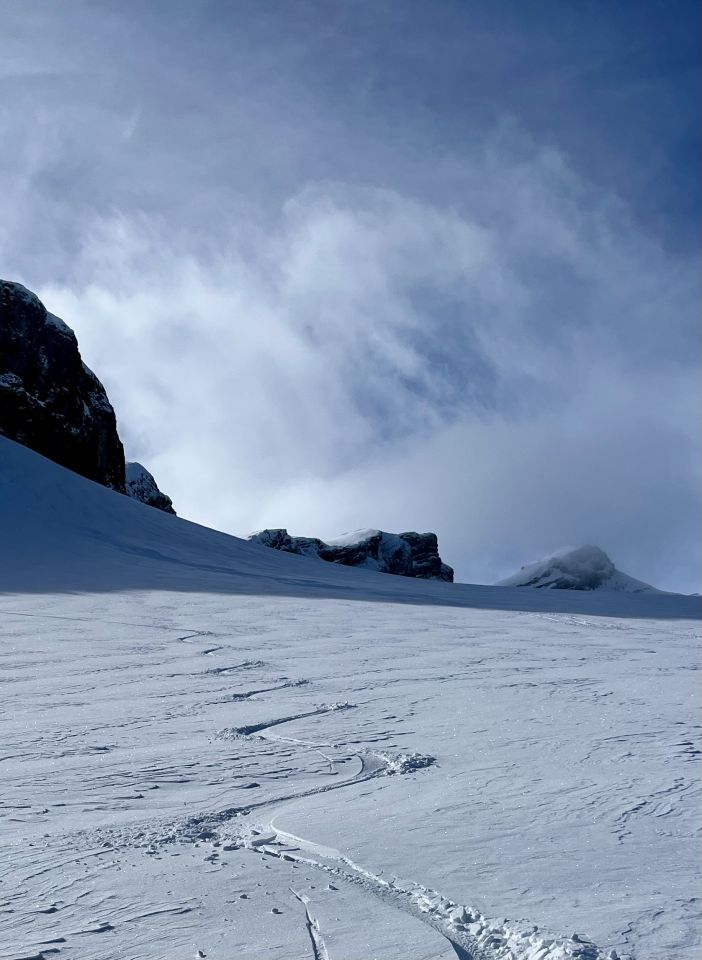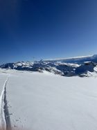 Zum Hochfahren auf Iffigenalp 4x4 Taxi anrufen +41 79 639 00 35. Um 5.30 Uhr bei -7 Grad auf Iffigenalp gestartet. Von Beginn weg 5-10 cm Neuschnee. Weiter oben hat es bis zu 40 cm Neuschnee. Wir waren ganz alleine unterwegs. Emanuel hat gute Spurarbeit geleistet. Der Übergang vom Tungelgletscher zum Wildhorn Gletscher wird jedes Jahr steiler, weil der Gletscher unten wegschmilzt. Weil die Lawinen Situation auf Erheblich war, sind wir auf dem harten Grat, mit den Skier aufgebunden direkt hochgestiegen. Aber dann kamen die Heliskiertouristen und fuhren voll in den Lawinenhang. Weil drei Helikopter ganz viele Passagiere auf dem Gipfel rausliessen, haben sie die Hänge verkarrt. Weiter haben noch zwei Flugzeuge auf dem Gletscher gelandet. Es war recht viel los da oben. Die Wildhorn Hütte ist noch bis am 21. Februar geschlossen. Die Abfahrt war traumhaft schön bei feinstem Pulverschnee von oben bis unten. Das Wetter war bombastisch.