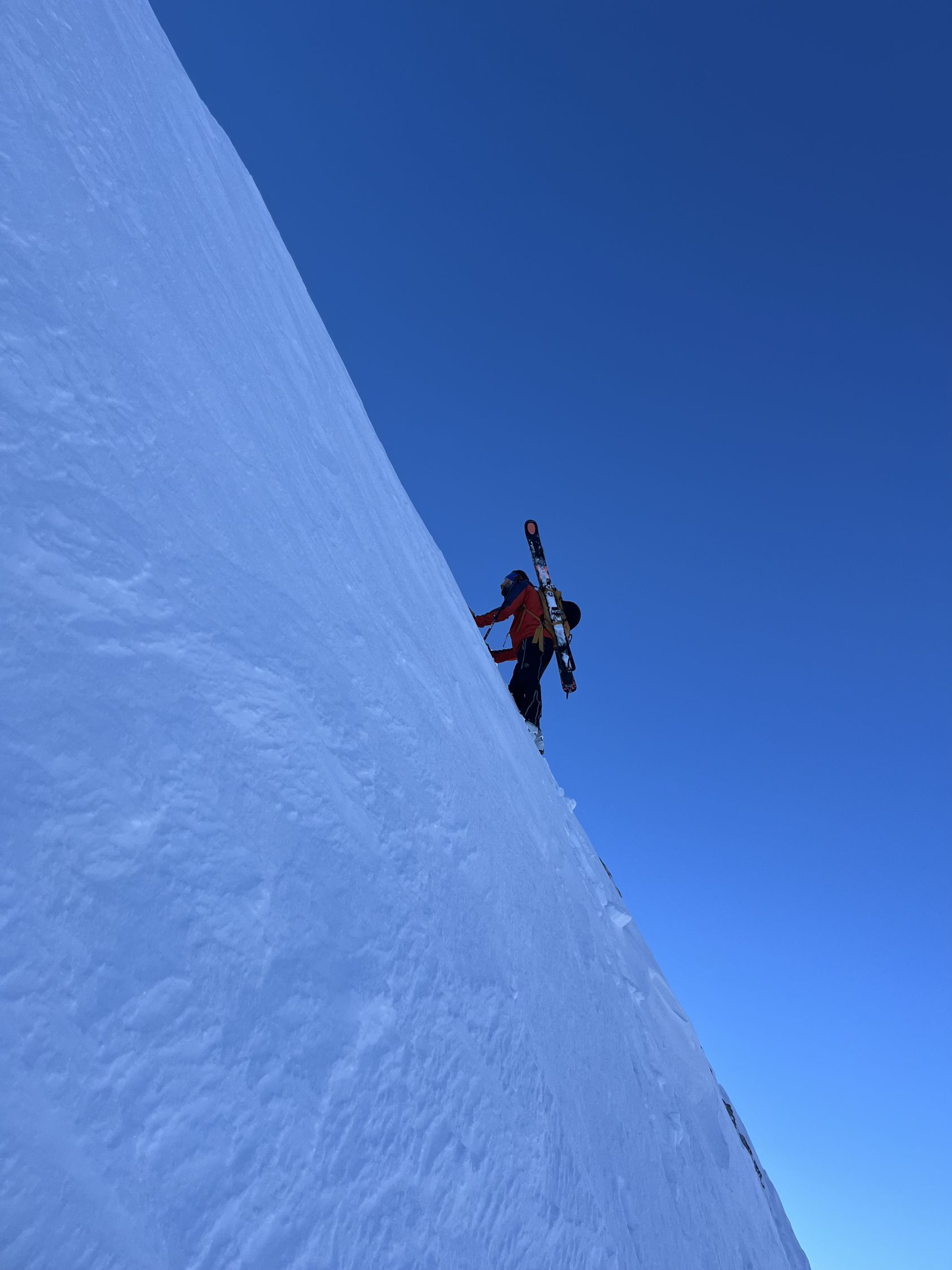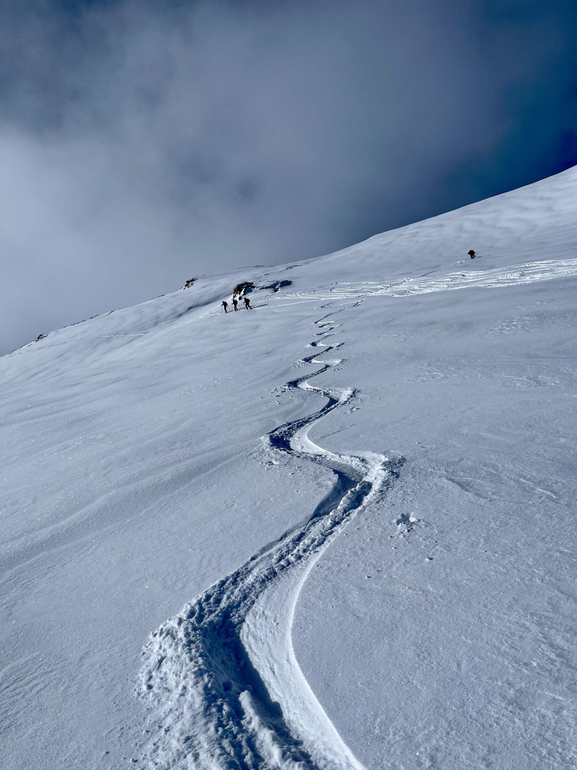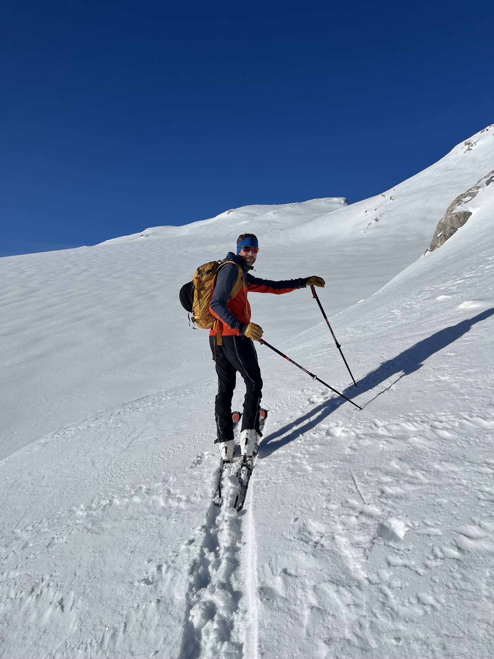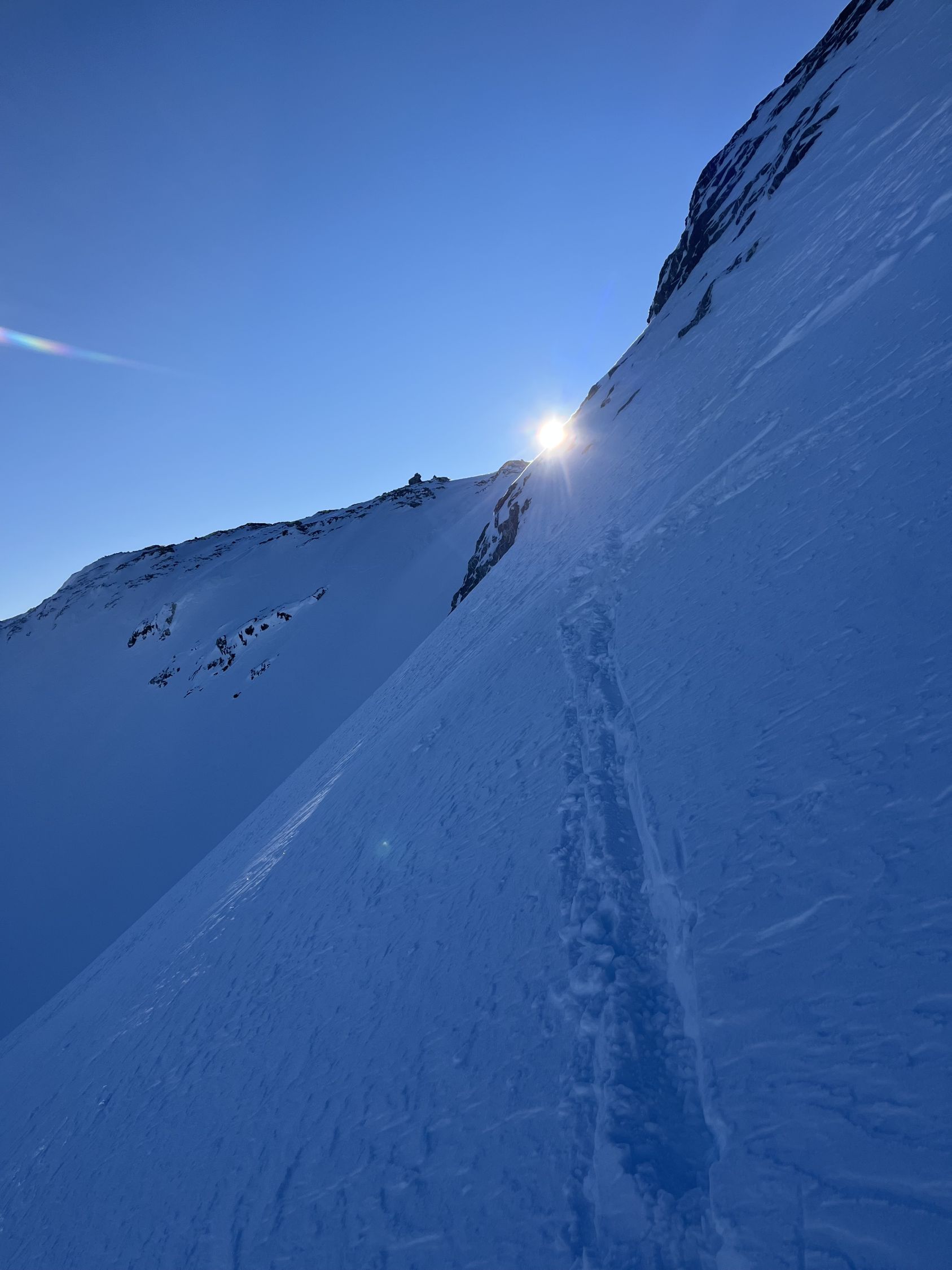 Zum Hochfahren auf Iffigenalp 4x4 Taxi anrufen +41 79 639 00 35. Um 5.30 Uhr bei -7 Grad auf Iffigenalp gestartet. Von Beginn weg 5-10 cm Neuschnee. Weiter oben hat es bis zu 40 cm Neuschnee. Wir waren ganz alleine unterwegs. Emanuel hat gute Spurarbeit geleistet. Der Übergang vom Tungelgletscher zum Wildhorn Gletscher wird jedes Jahr steiler, weil der Gletscher unten wegschmilzt. Weil die Lawinen Situation auf Erheblich war, sind wir auf dem harten Grat, mit den Skier aufgebunden direkt hochgestiegen. Aber dann kamen die Heliskiertouristen und fuhren voll in den Lawinenhang. Weil drei Helikopter ganz viele Passagiere auf dem Gipfel rausliessen, haben sie die Hänge verkarrt. Weiter haben noch zwei Flugzeuge auf dem Gletscher gelandet. Es war recht viel los da oben. Die Wildhorn Hütte ist noch bis am 21. Februar geschlossen. Die Abfahrt war traumhaft schön bei feinstem Pulverschnee von oben bis unten. Das Wetter war bombastisch.