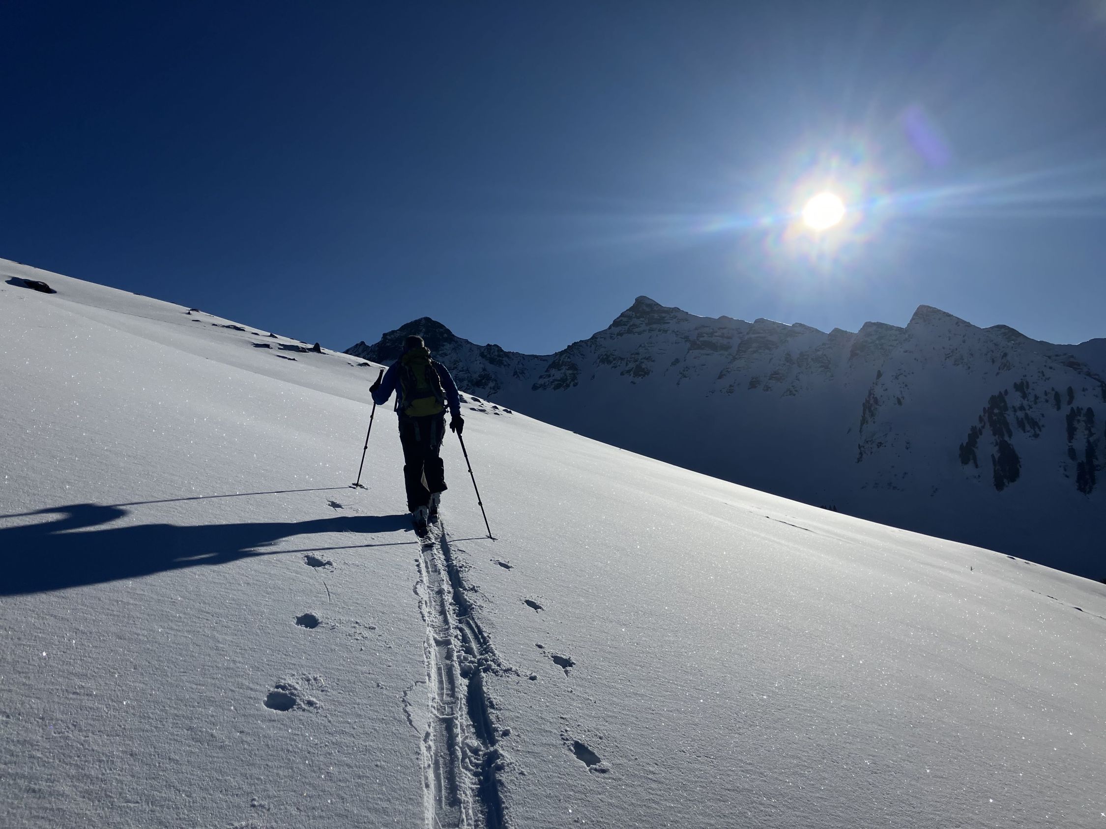 Aufstiegsspur im Gipfelhang etwas steil, aber profimässig angelegt mit so wenig Spitzkehren wie noch nie und den ganzen Hang ausgenutzt. Merci dem frühen Einzelgänger!