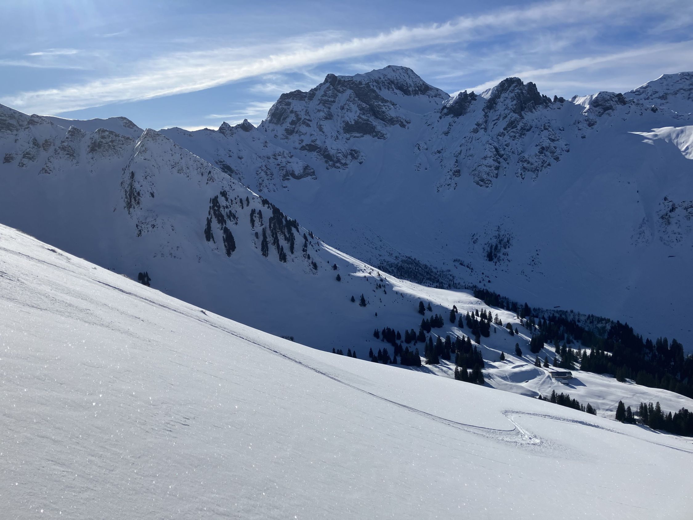 Abfahrt Gipfelhang in 10-20 cm (je nach Expo bzw. Mulde) frischem Pulver auf (meist) hartem Untergrund, bei richtiger Spurwahl war der ruppige Untergrund vermeidbar.