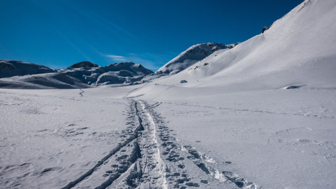 Traumtag, wolkenlos, windstill und sehr mild. Es wird langsam schwierig, unverspurtes Gelände zu finden. Anstatt der Abfahrt durchs Val Gronda hinunter nach Stalveder bin ich auf den westlichen Grat gegenüber des Piz Surparé kurz aufgestiegen und von dort über die sehr steilen Osthänge abgefahren. Nur möglich dank der momentan günstigen Lawinensituation. Hier alles noch unverspurt und man findet noch schöne Pulverhänge. Dann nach kurzem Flachstück wieder sehr steil hinunter ins Valletta da Beiva und das Tal hinaus zurück nach Bivio. Die Abfahrt ins Valletta da Beiva ist momentan nicht zu empfehlen; zwar sind die Schneeverhältnisse gut, aber die wenigen Durchgänge in den Steilhängen sind schwierig zu finden und unter den Felsen befinden sich gewaltige Fischmäuler....