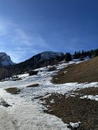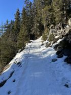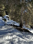 Es hat Schnee ab der Bergstation. Wenig Schnee entlang des Waldweges, die Stufen deshalb etwas mühsam und man musste die Ski auch kurz tragen.