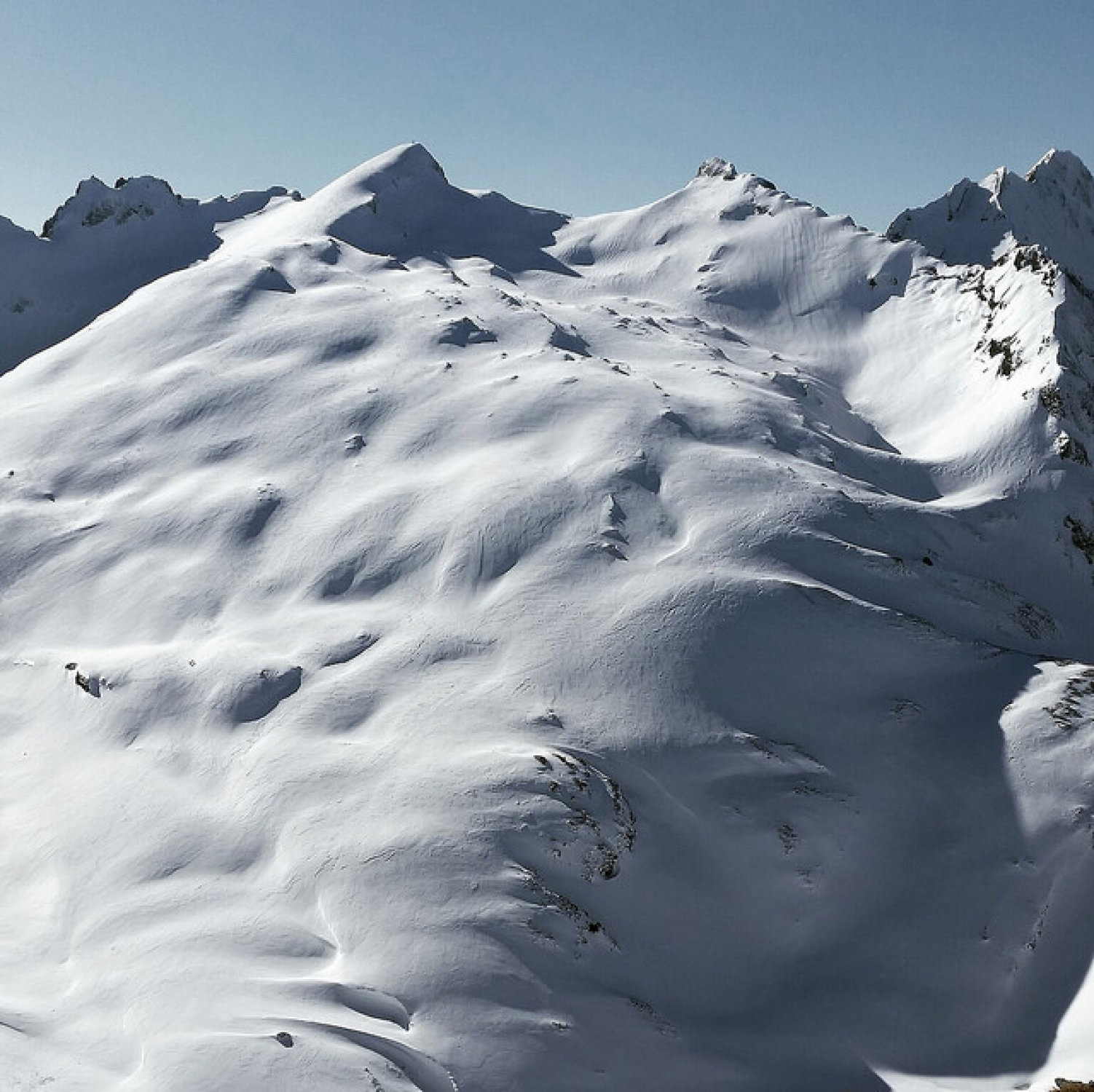 Harte Unterlage wie gepistet, vor allem der Gipfelhang super zu fahren, nur wenige Stellen mit Bruchharsch. Isisizer Grat abgeblasen und stellenweise eisig. Unterhalb 1700 m Wasserrillen im Schnee.