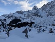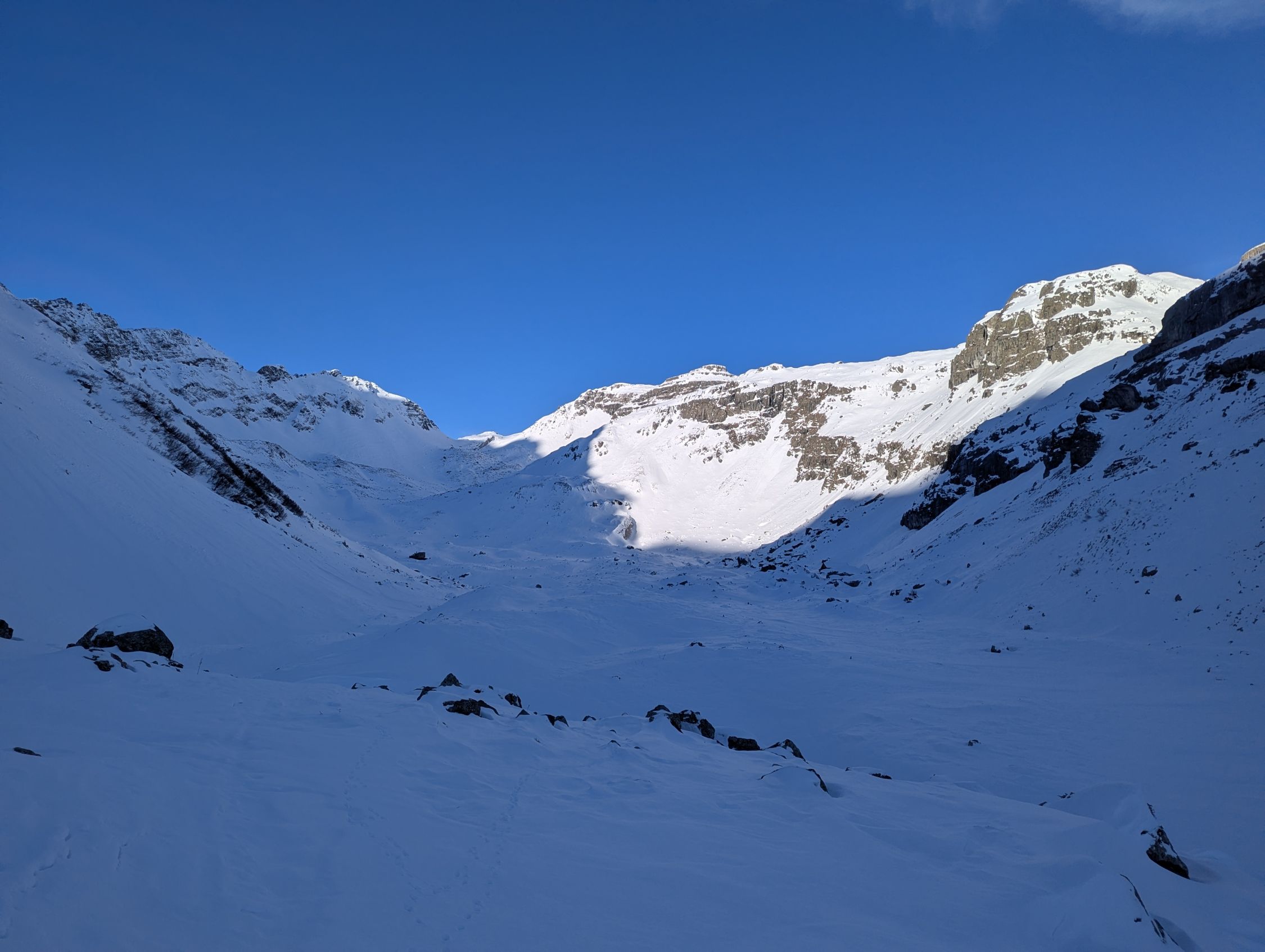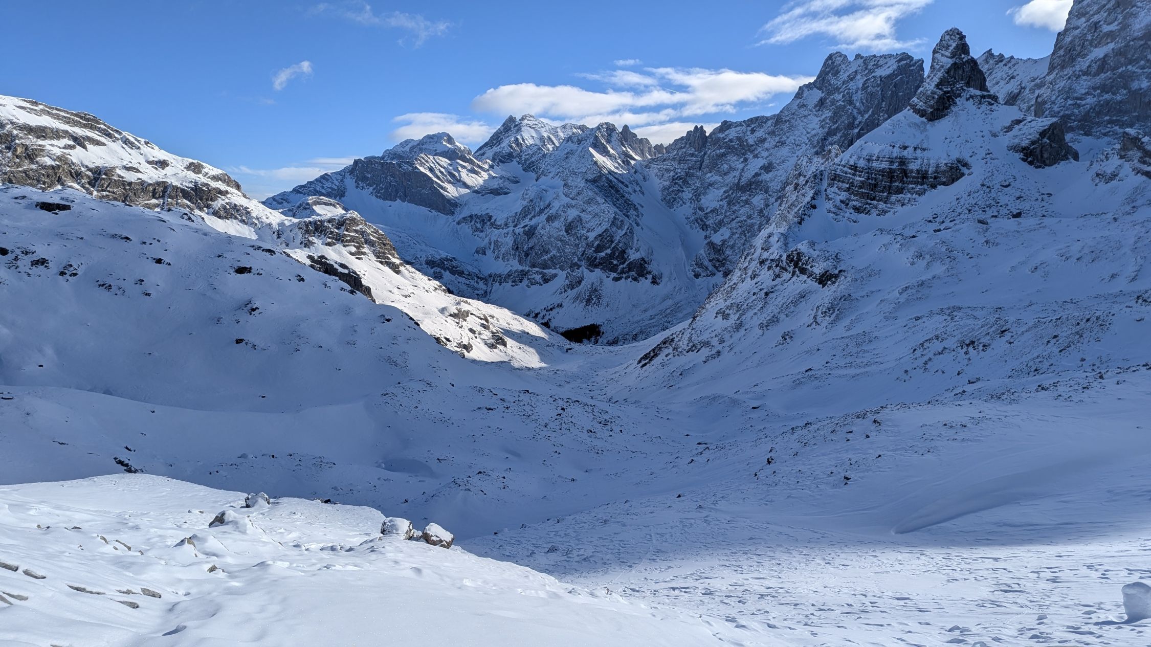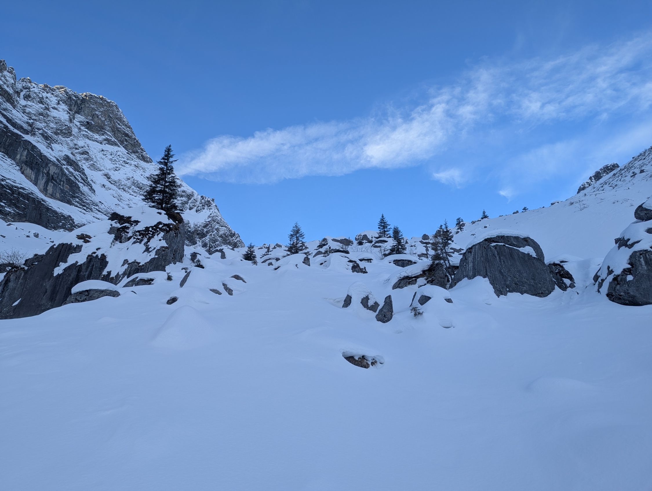 Ab Fahrverbot immer wieder eisige, planierte Straße bis Brunni. Hier könnte man glauben der Schnee reicht für eine passable Tour. Das Griesstal ist aber mehrheitlich vom Wind ausgefegt, die Unterlage relativ dürftig: Oft tragend, 5cm-Neuschneeschäumchen. Wäre gut, wenn nicht die Steine nur unzureichend eingeschneit gewesen wären. Unterlage beim Spuren teils rutschig, Harscheisen sinnvoll. Abfahrt muss sehr defensiv sein, der eine und andere Steinkontakt konnte nicht vermieder werden. Glattere, windabgewandte Flächen waren ok zu fahren. Richtung Brunni unten raus feuchter Bruchharsch. Die eisige Straße ging dann besser als gedacht. Über die Loipe direkt zum Parkplatz.