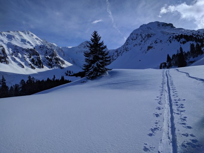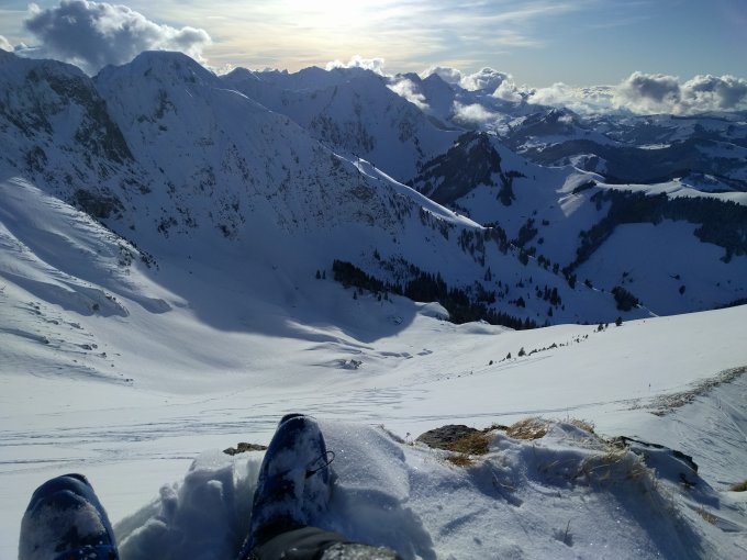 Unten schöner Pulver auf harter Unterlage, oben teils Pulver mit leichtem Deckel, kleine Eispassagen wo verblasen. Umgekehrt beim Skidepot, für den obersten Hang (ab Pass) sind Eisen von Vorteil