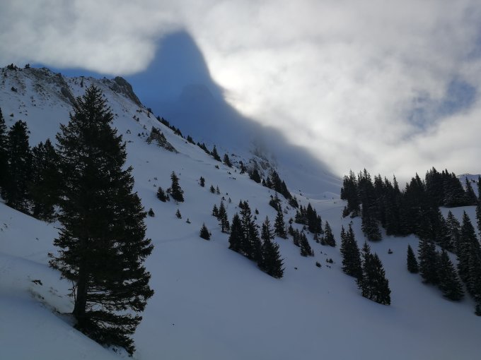 Abfahrt durch die Nordflanke in welcher unten der Kegel eines doch grösseren Schneebretts gequert wurde.