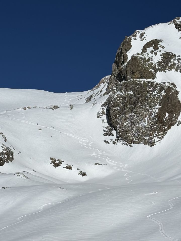 Abfahrt: auf dem Chüefadfirn schöner Pulverschnee, ab ca. 2300 etwas ruppiger, aber bis zum Auto gut fahrbar. Kein Steinkontakt bei vorsichtiger Fahrweise.