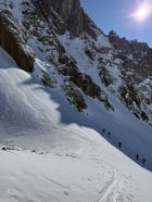 Sehr gute Spuranlage mit ca. 30 Spitzkehren. Harscheisen im Steilhang ab ca. 2100 sinnvoll.