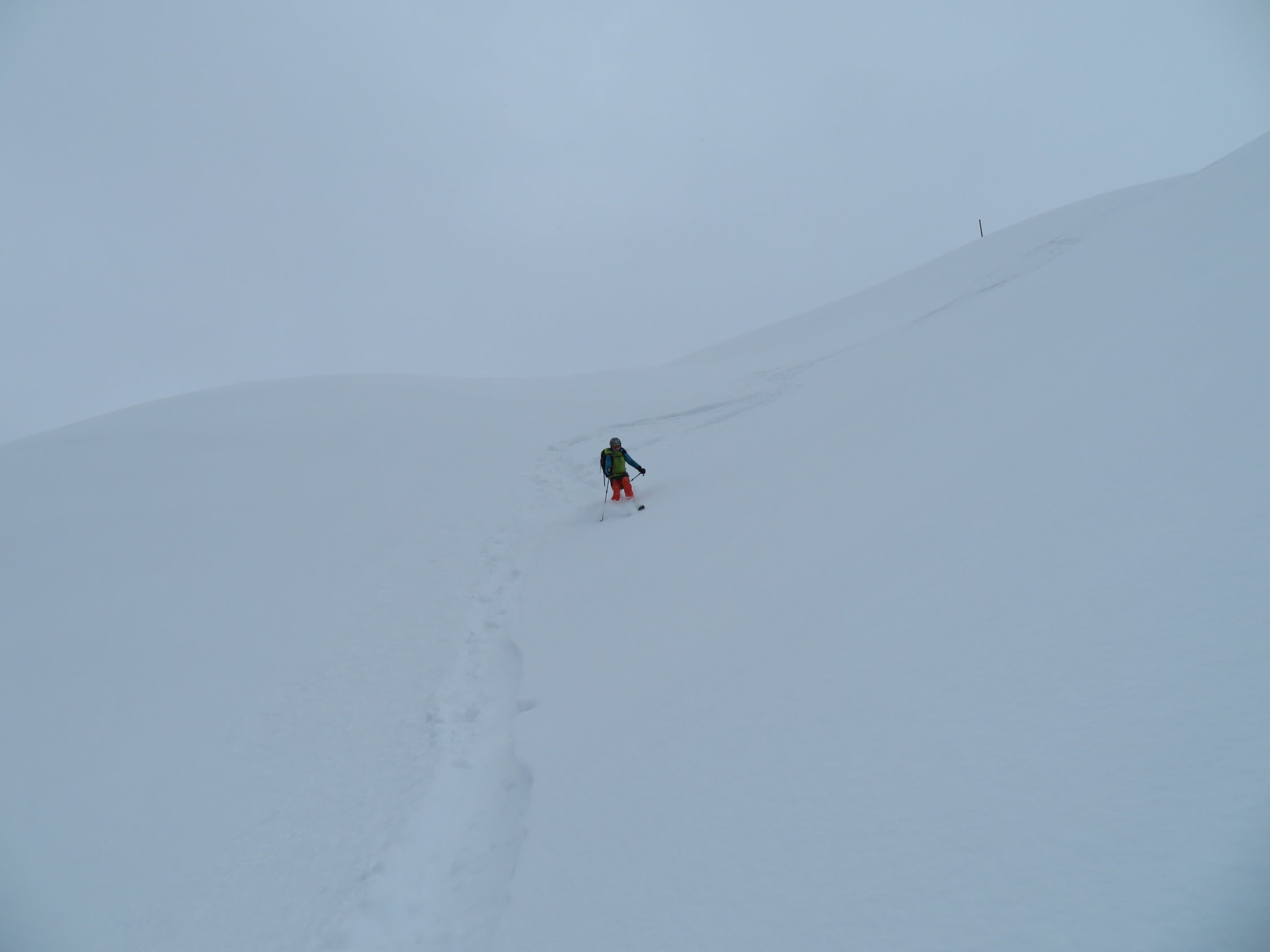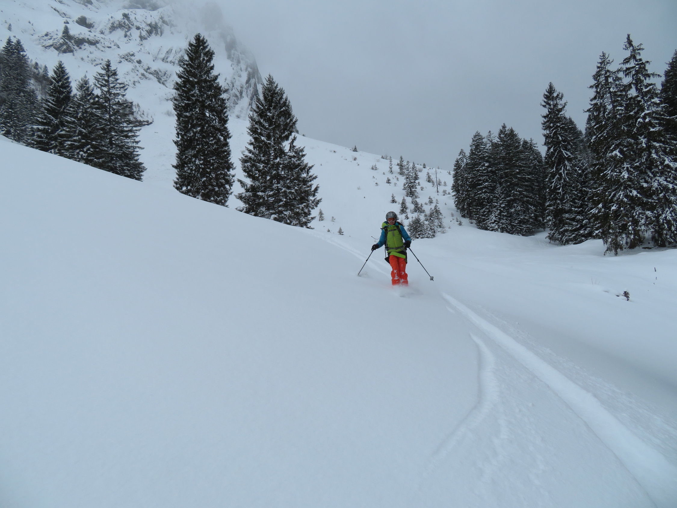 Im oberen Teil ca. 30cm Pulver der die harte Unterlage richtig abgefedert hatte. Im unteren Teil ca. 15cm. Da ist die harte Unterlage etwas durchgedrungen. Das unterste Waldstück knapp, da der Schnee in den Bäumen hängenblieb.