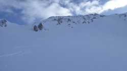 Vielen Dank den Pazolastock-Spurer - ab dort hiess es selber spuren. Der Fussaufstieg ging gerade noch ohne Pickel, wobei meine Spur links bei den Felsen suboptimal war (harter, teilweise gefrorener Schnee, wenig Griffe). Besser wäre rechts rum gewesen - wurde heute von Kollege J. später so eingespurt.