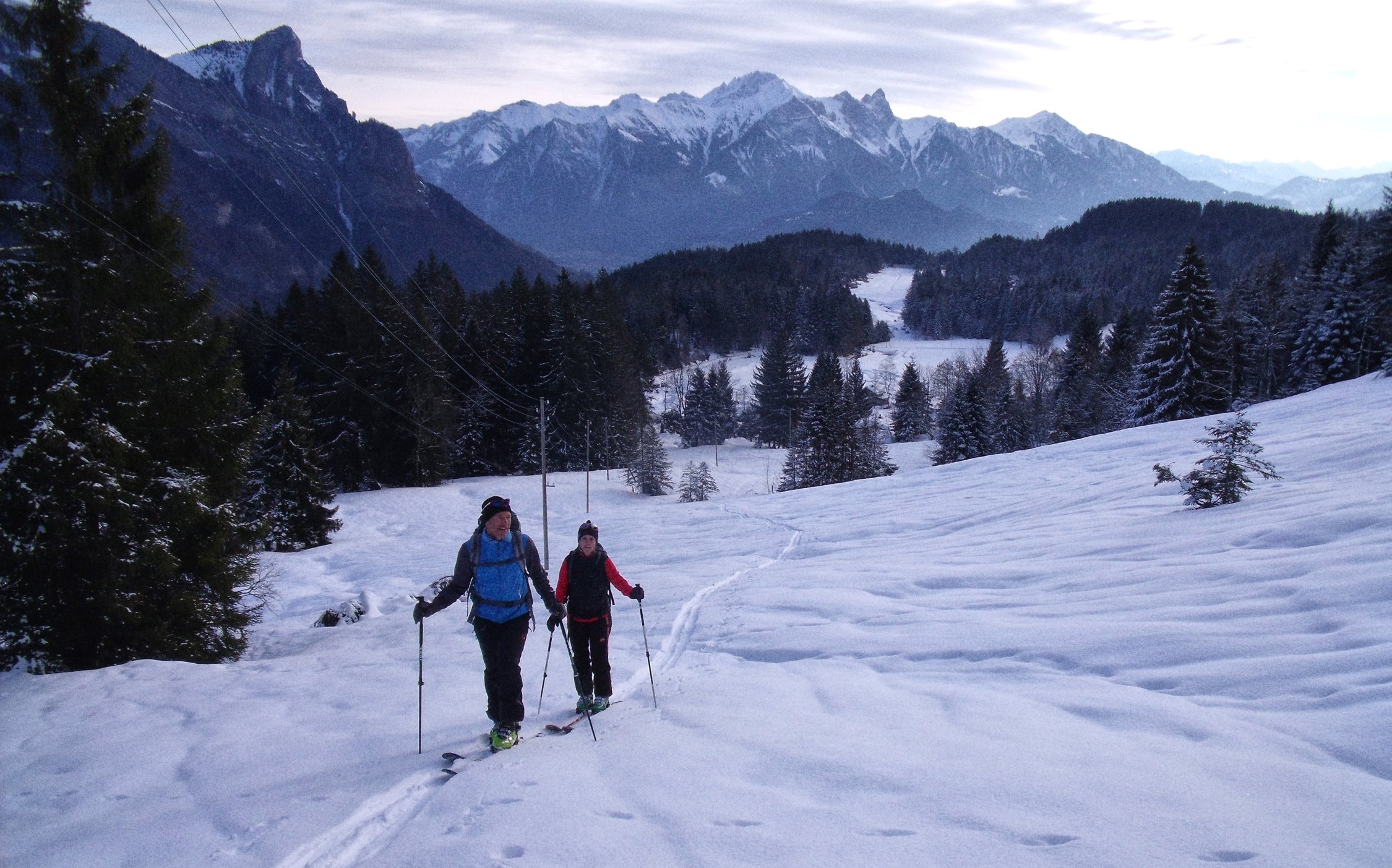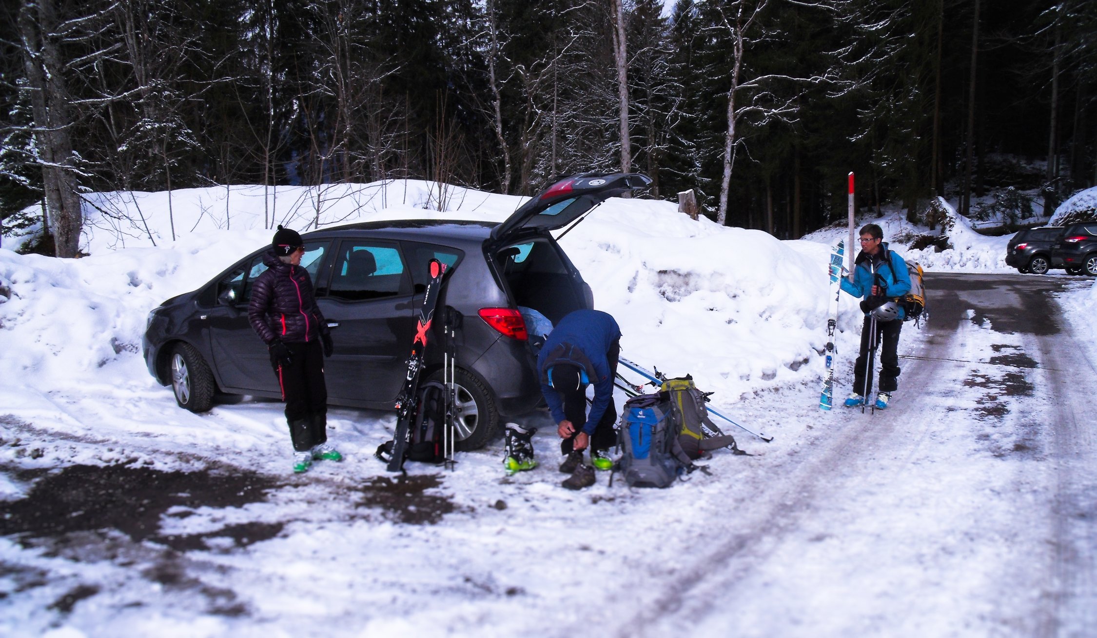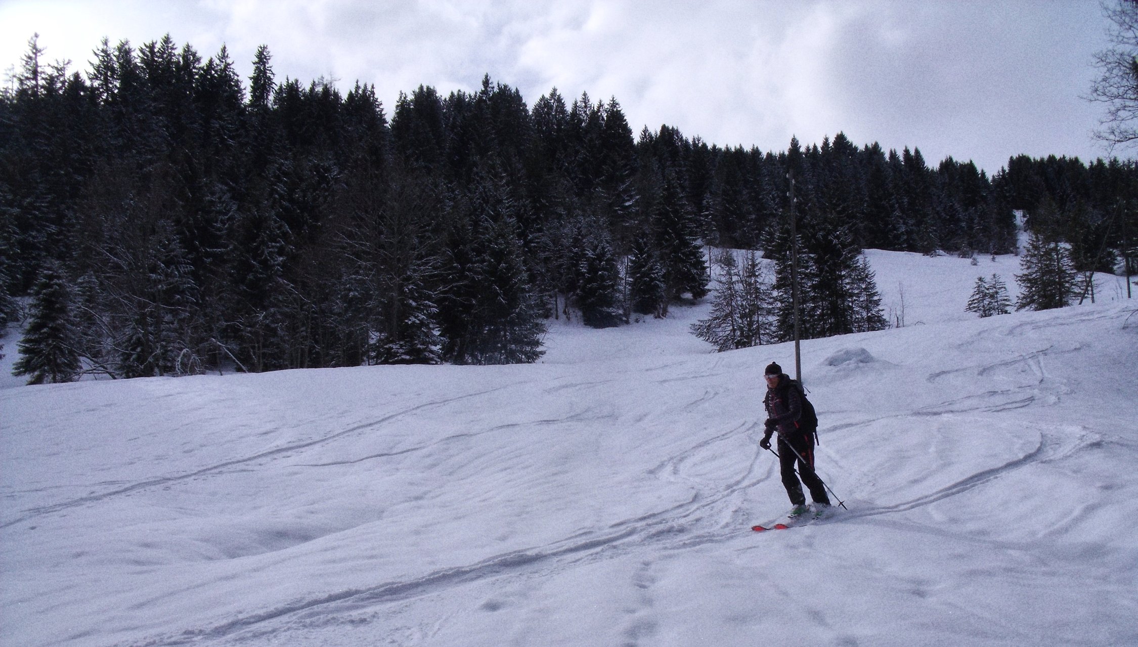 Im Unteren Teil steigt man über Wasserriefen auf. Mit der Höhe werden die Verhältnisse immer besser. Es liegen zirka 20cm Pulverschnee auf einer harten Unterlage.