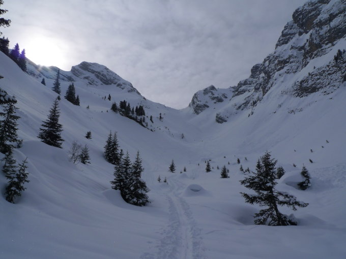 Env 30cm de neige fraiche sur la pente des Spillgerten, je me suis arrêté sur le replat sous la pente qui va au sommet, il y avait deux petites plaques parties sur celle ci, j'étais seul, il était assez tard et plus personne sur l'itinéraire... donc demi tour, même si la face était bien tracée du jour.