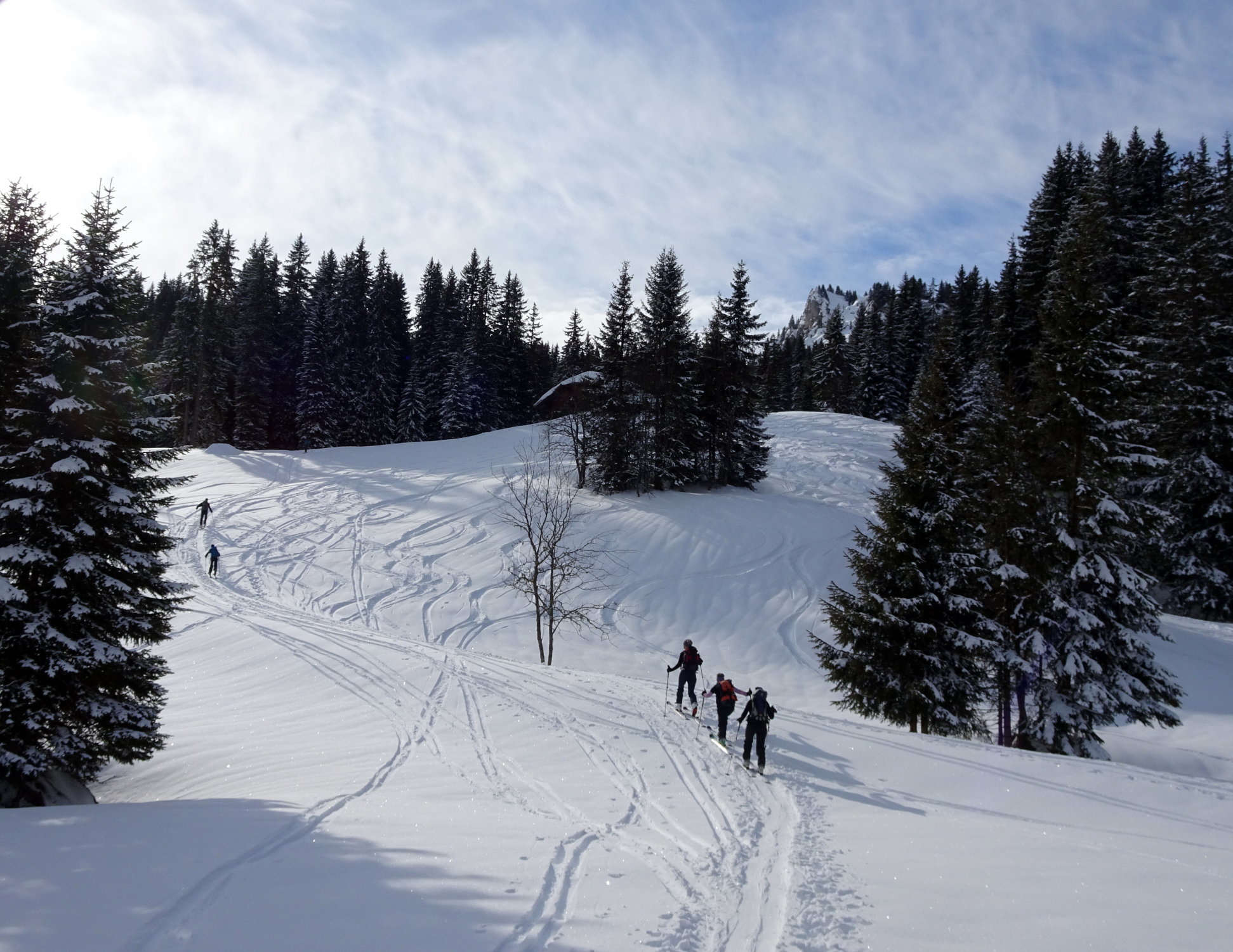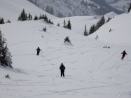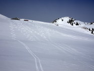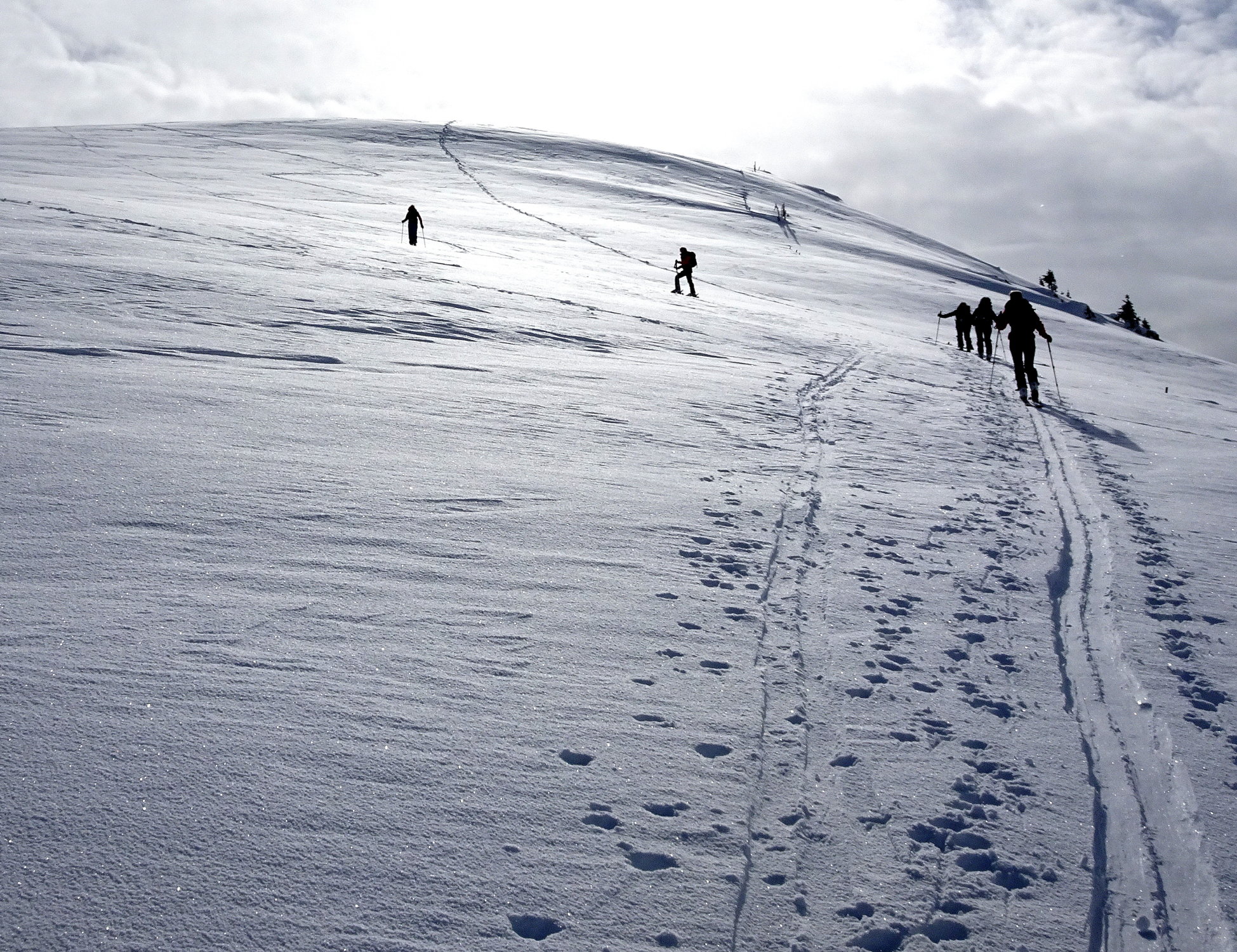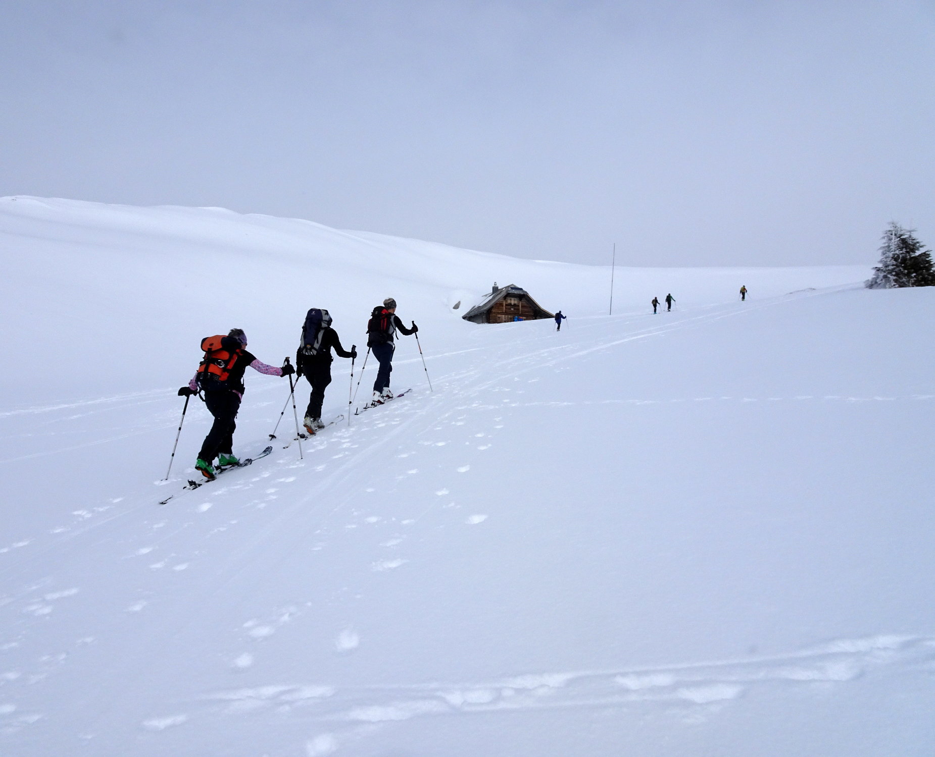 Das ganze Gebiet ist sehr gut gespurt, mit etwas Fantasie findet man noch schöne Hänge, aber nicht zu steil. Der Neuschnee liegt auf einer harten , glasiger Kruste und das merkt man im steilen Aufstieg schon.