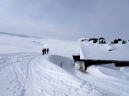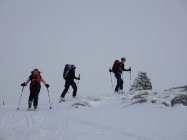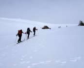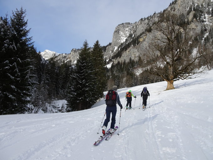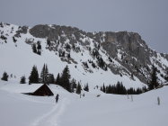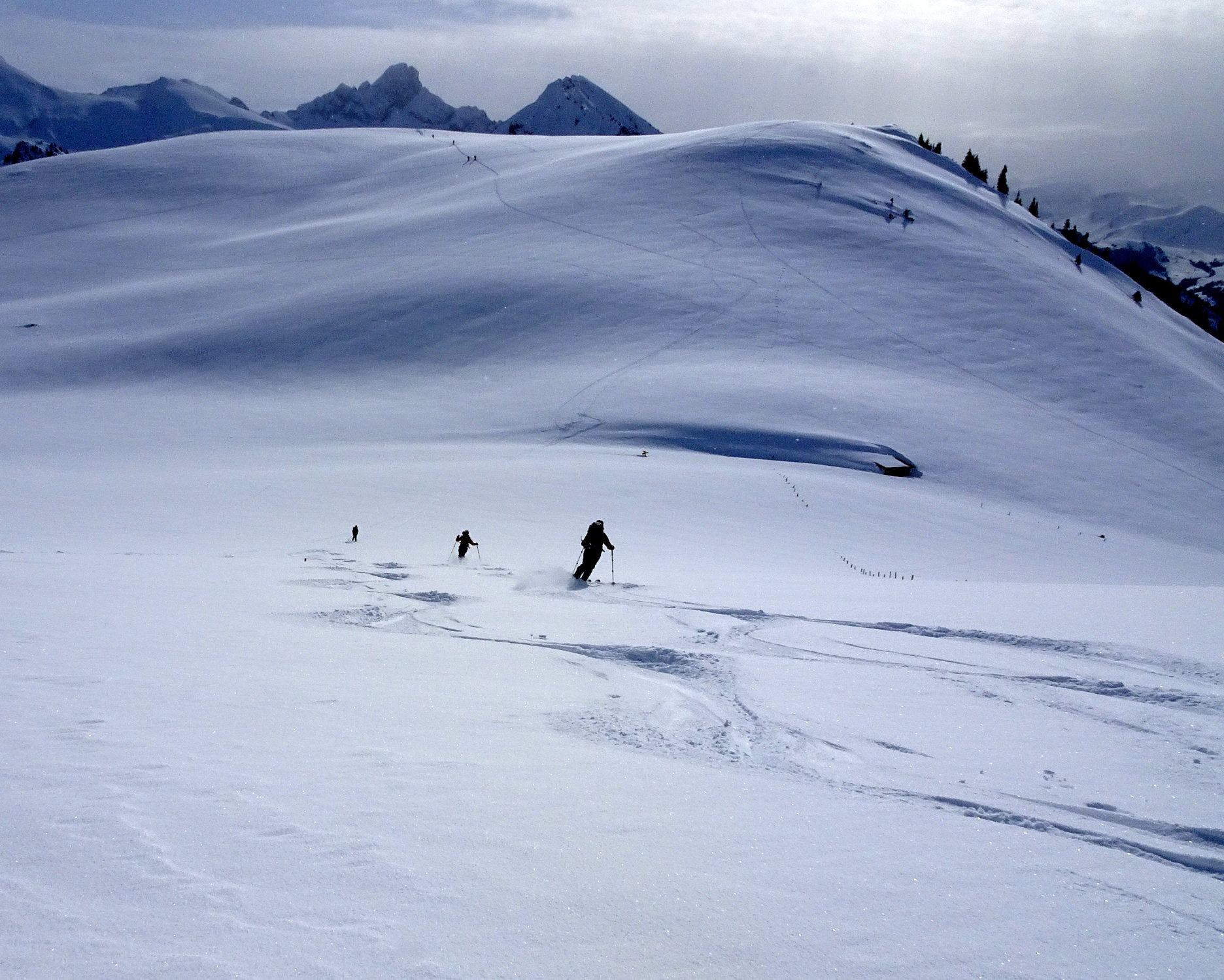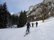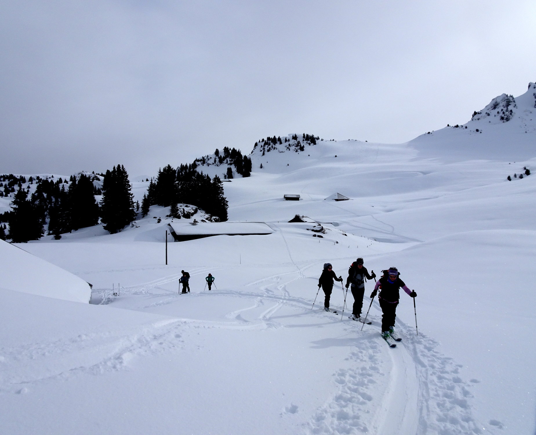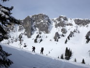 Das ganze Gebiet ist sehr gut gespurt, mit etwas Fantasie findet man noch schöne Hänge, aber nicht zu steil. Der Neuschnee liegt auf einer harten , glasiger Kruste und das merkt man im steilen Aufstieg schon.
