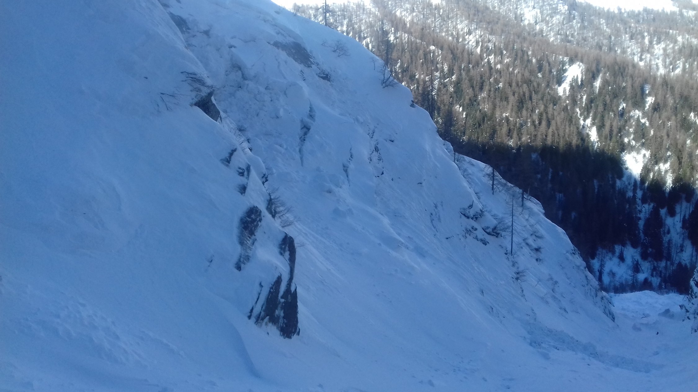 Auf 1800 meter, westlich von Alpe Piemantiu hat eine Frische Gleitschneelawine das Aufstiegsspur verschuttet. Auf die steile Platten oben liegt noch Schnee von Rissen durchzogen.