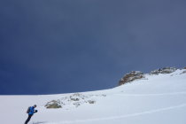 Aufstieg Problemlos, 50m unterm Gipfel schnee hart und abgeblasen, sonst schöne 10-20cm Presspulverauflage. Aufstieg zum Gipfel in guten Trittschnee auch in Filzpantoffel (SB-Boots) einfach nöglich