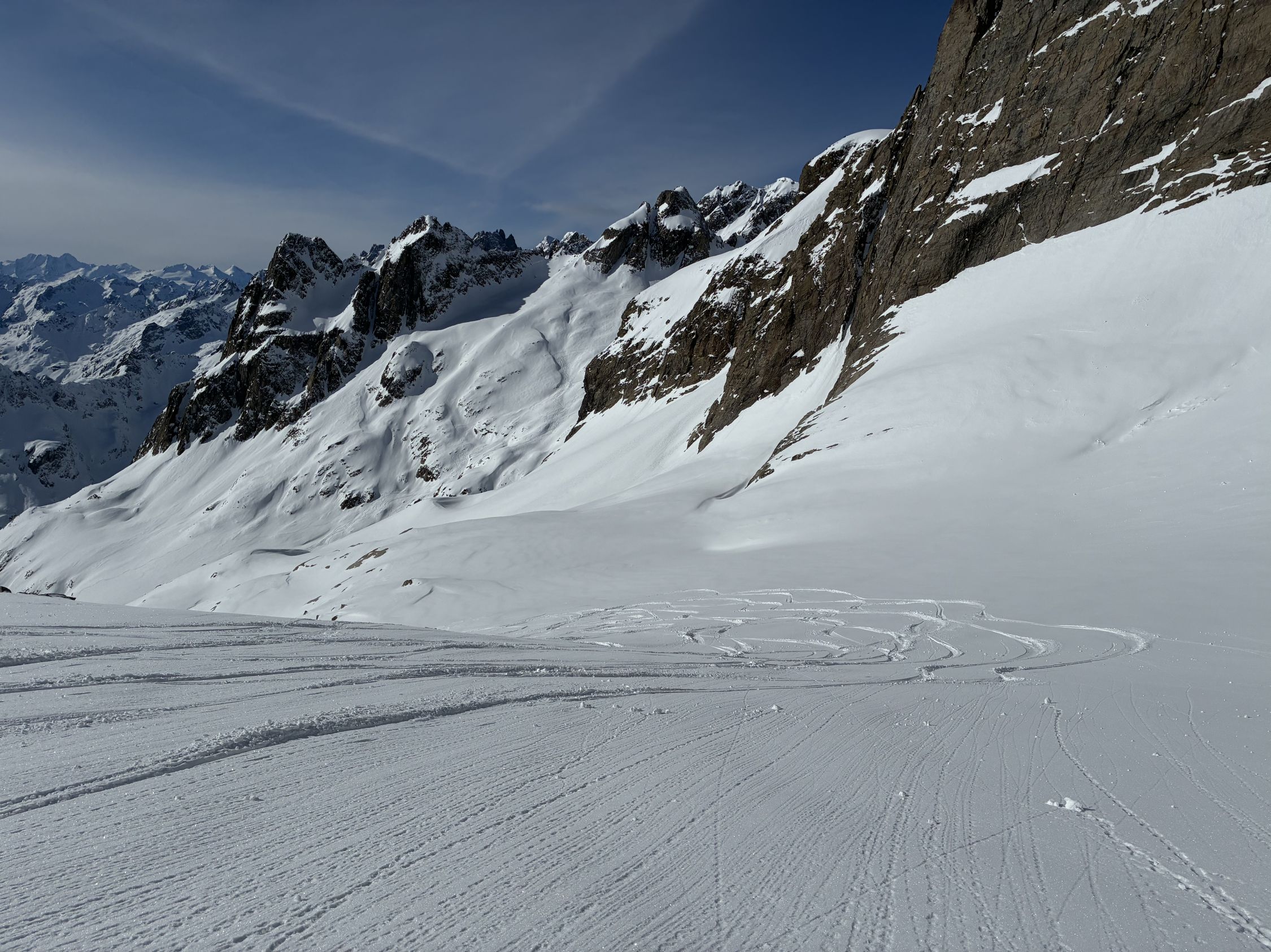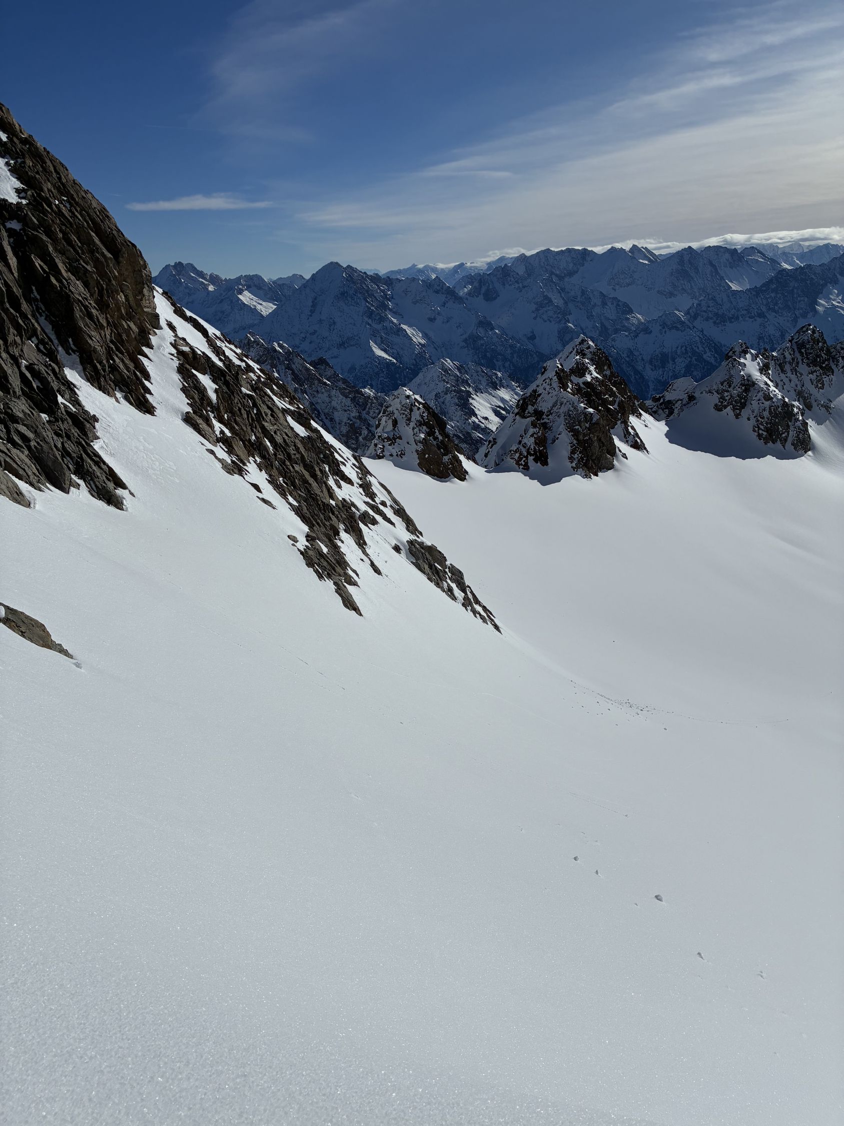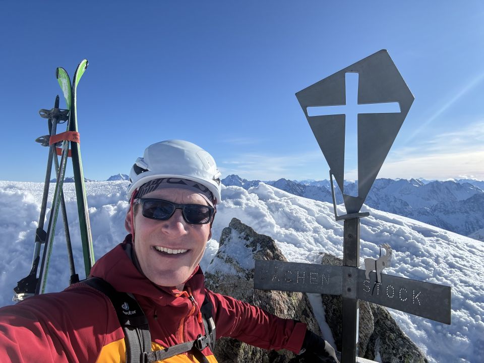 Spontane Entscheidung, nachdem die allgemeine Schneearmut eine gewisse Lustlosigkeit ausgelöst hat. Ein gutes Feedback zu ganz brauchbaren Verhältnissen am Bächenstock hat mich dann doch motivieren können, es zu probieren. Und es war mehr als lohnend. Der Verhauer auf den Bächenfirn ist mittlerweile fast obligat, seitdem wir vor mittlerweile 15 Jahren uns einmal durch die doch beachtliche Wächte gearbeitet haben. Nein, man muss da nicht runter, auch wenn der Wiederaufstieg zu P2970, um wieder auf den Weg zum Zwächten zu kommen, die Tour alpinistisch durchaus bereichert. Naja, immerhin eine First-Line. Auch den Verhauer schreibe ich der Altersturheit zu...