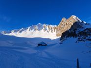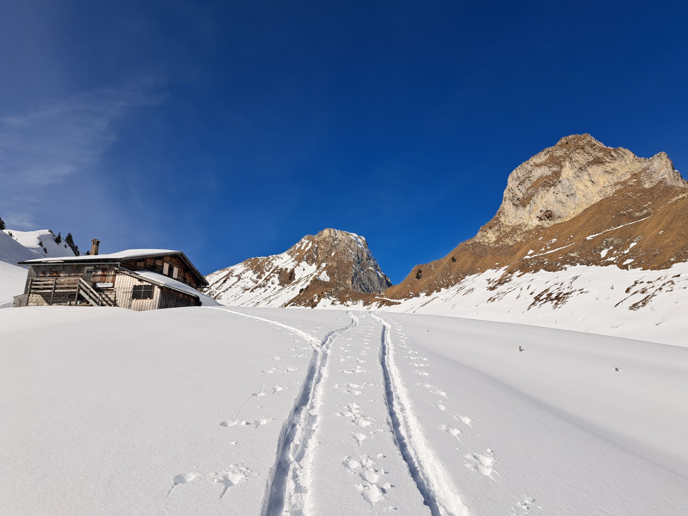 Aufstieg über Wannenhütte, Pass vor Schibespitz und Südseitig bei wenig Schnee zum Schidepot 2100m des Gantrisch.