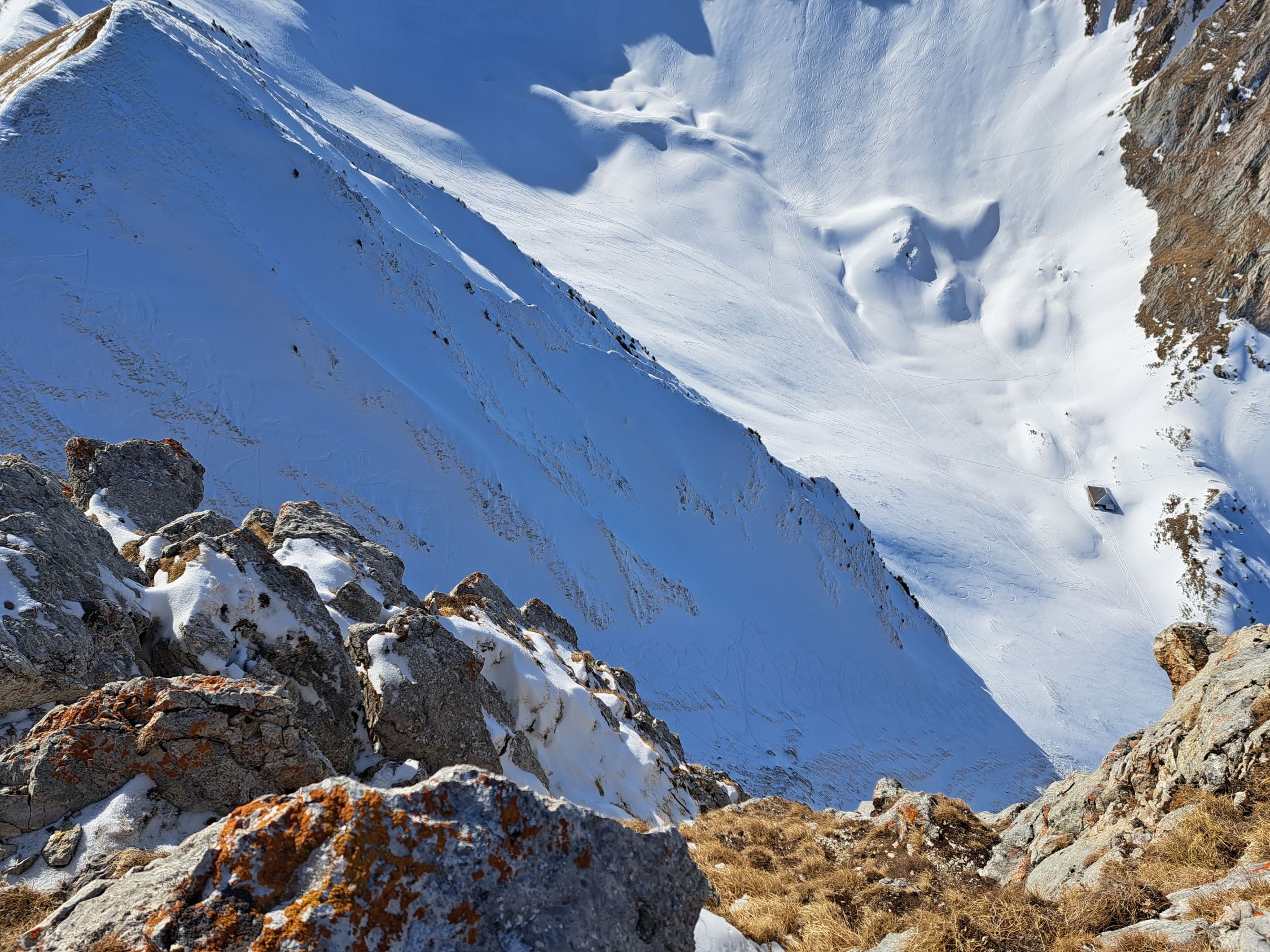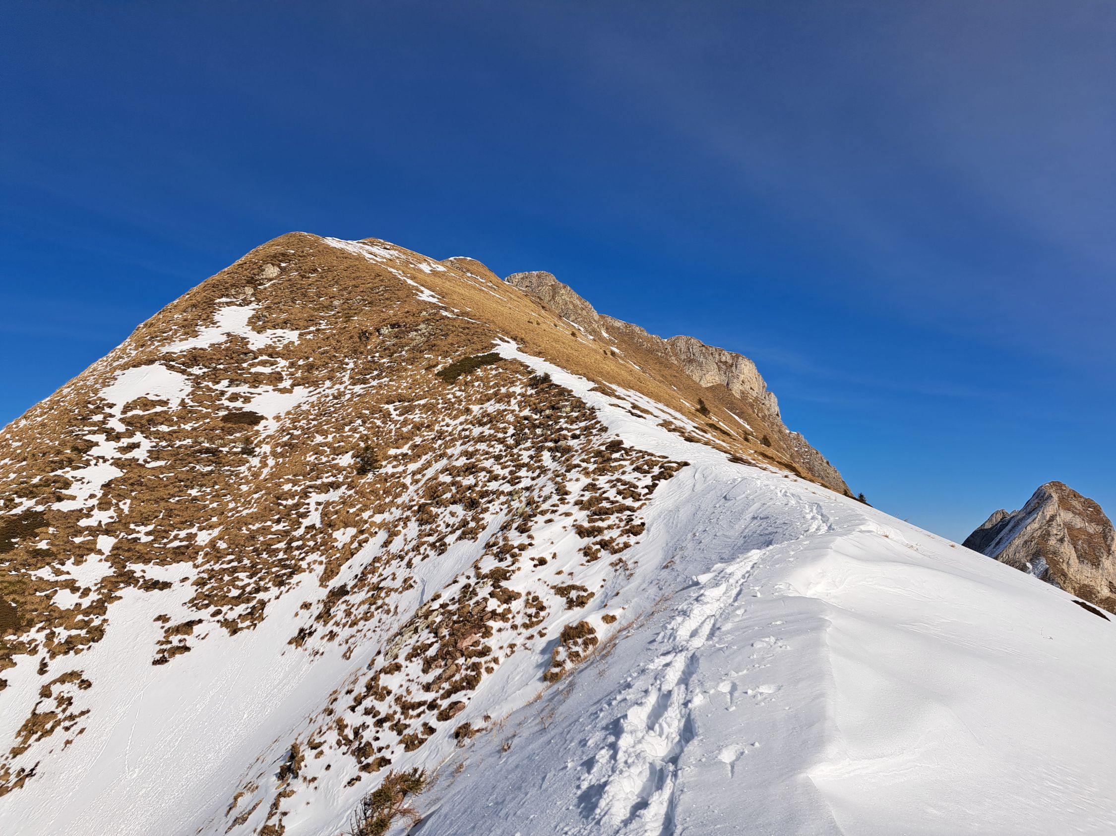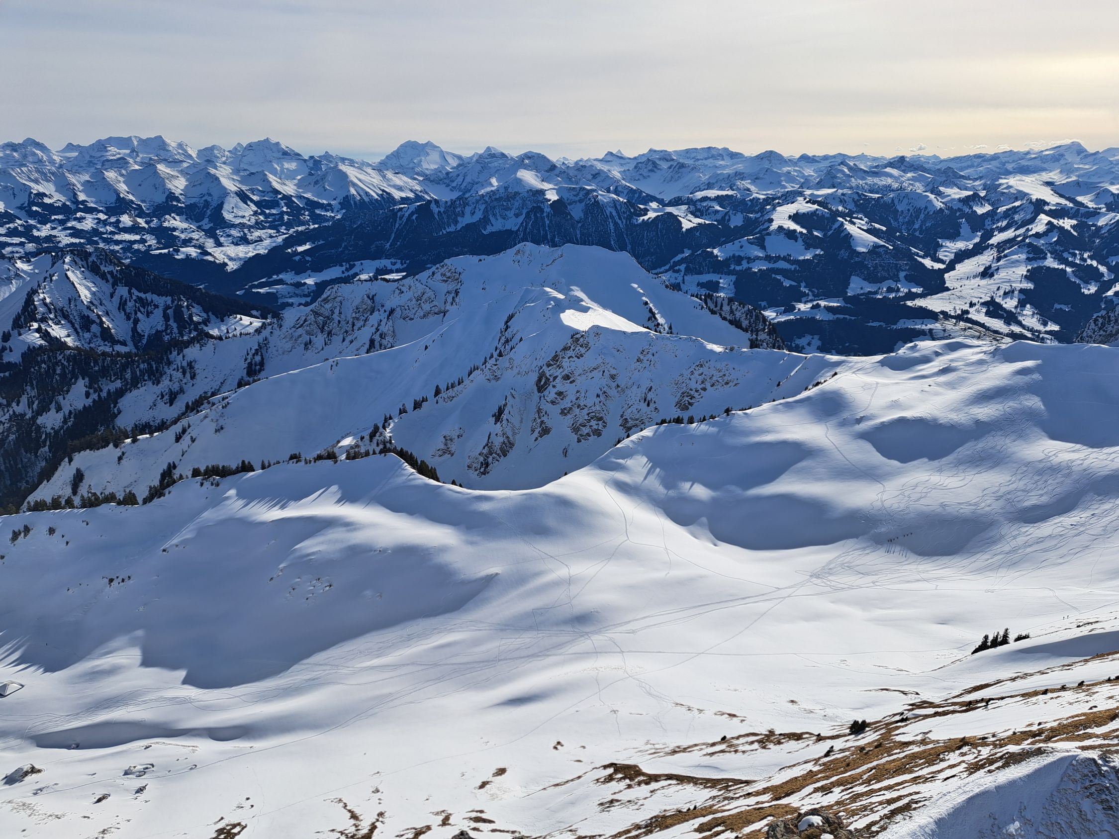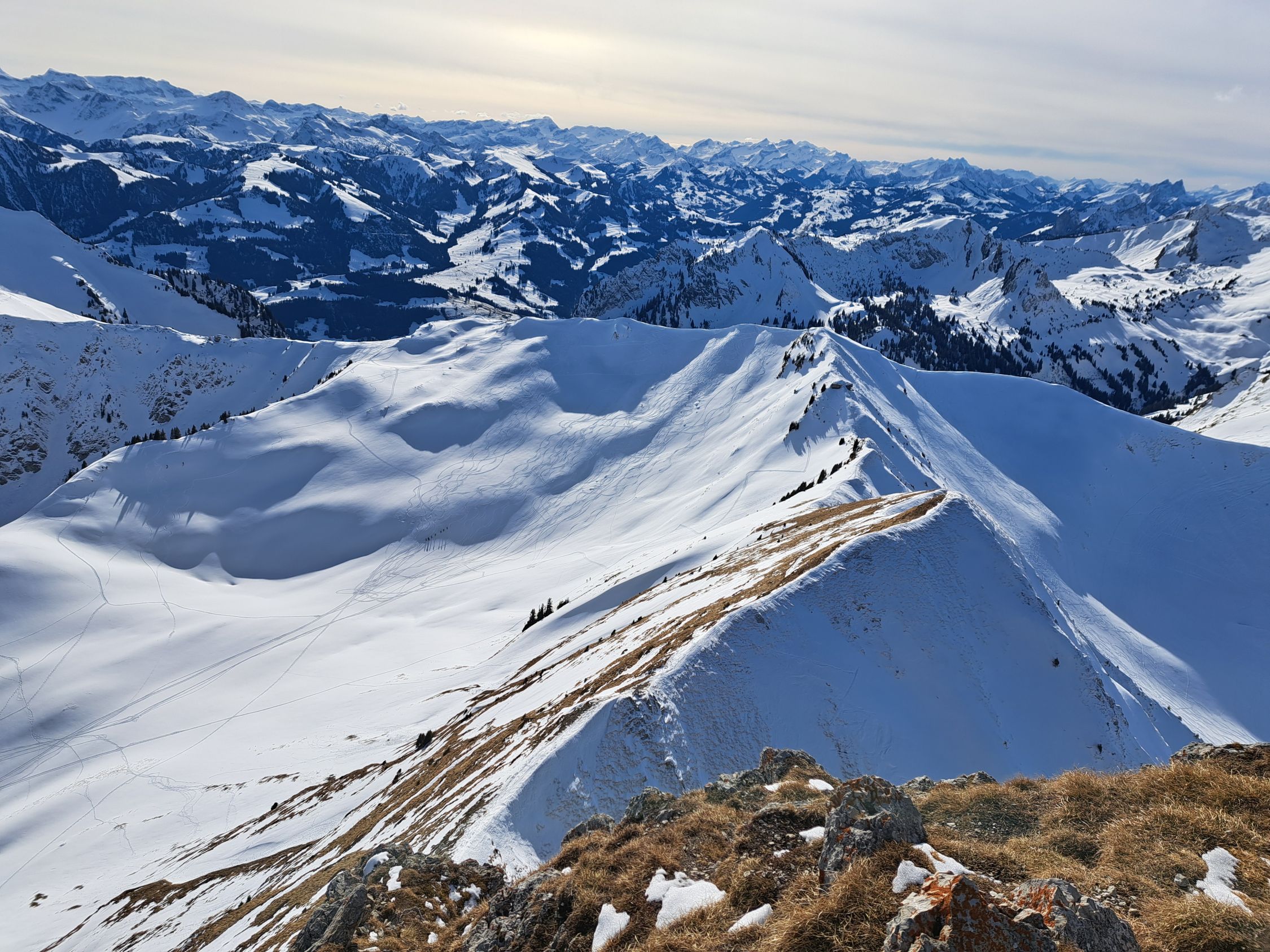 75hm problemlos zu Fuss schneefrei dem SW-grat entlang auf den Gantrisch 2175m