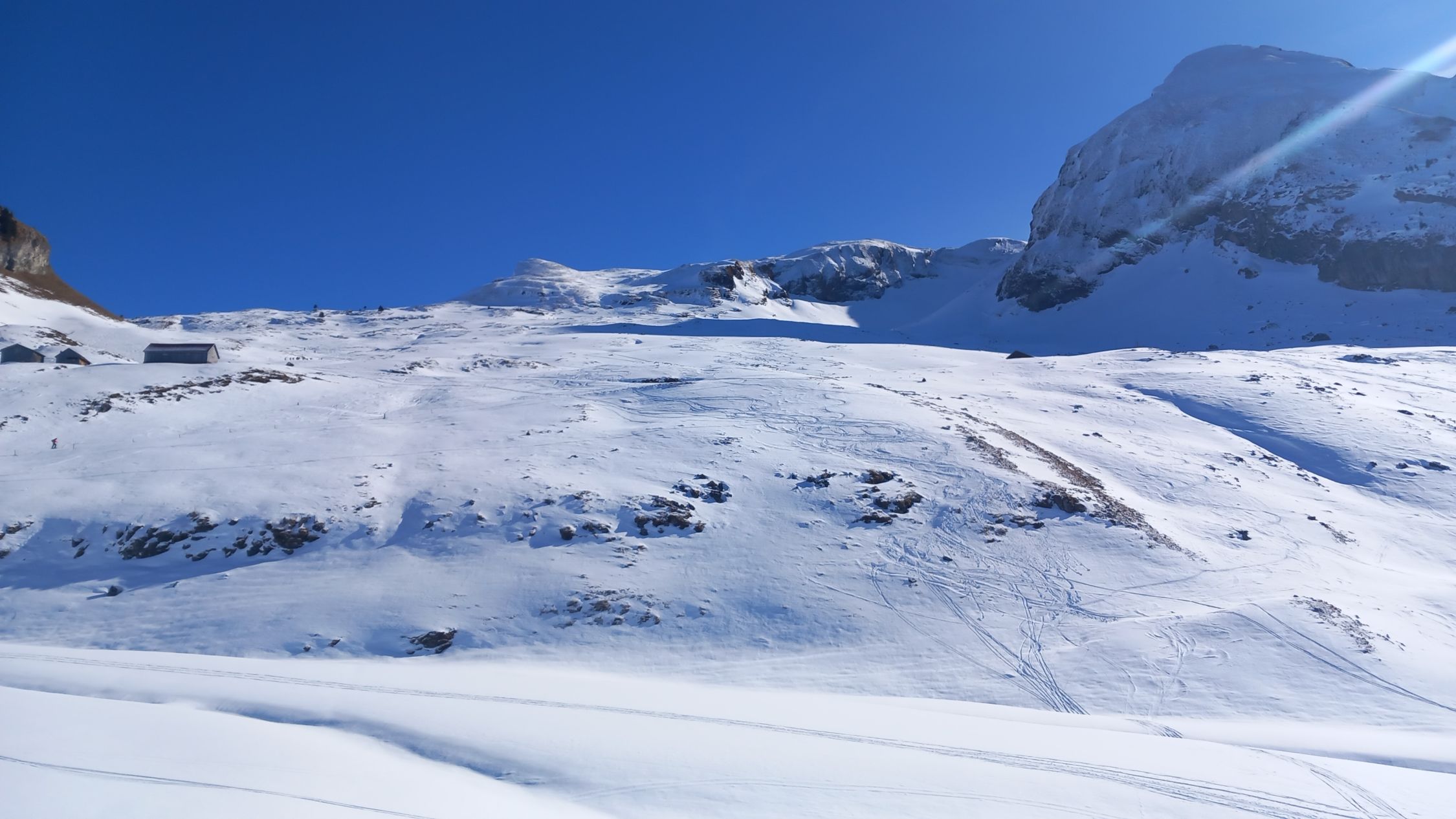Gebiet mager aber ausreichend eingeschneit um ohne Steinkontakt abfahren zu können. Eigentlich wie Piste, nur ohne Lift. Steilstufe ausgefahren, bedarf gute Skitechnik. Ansonsten easy und griffig.