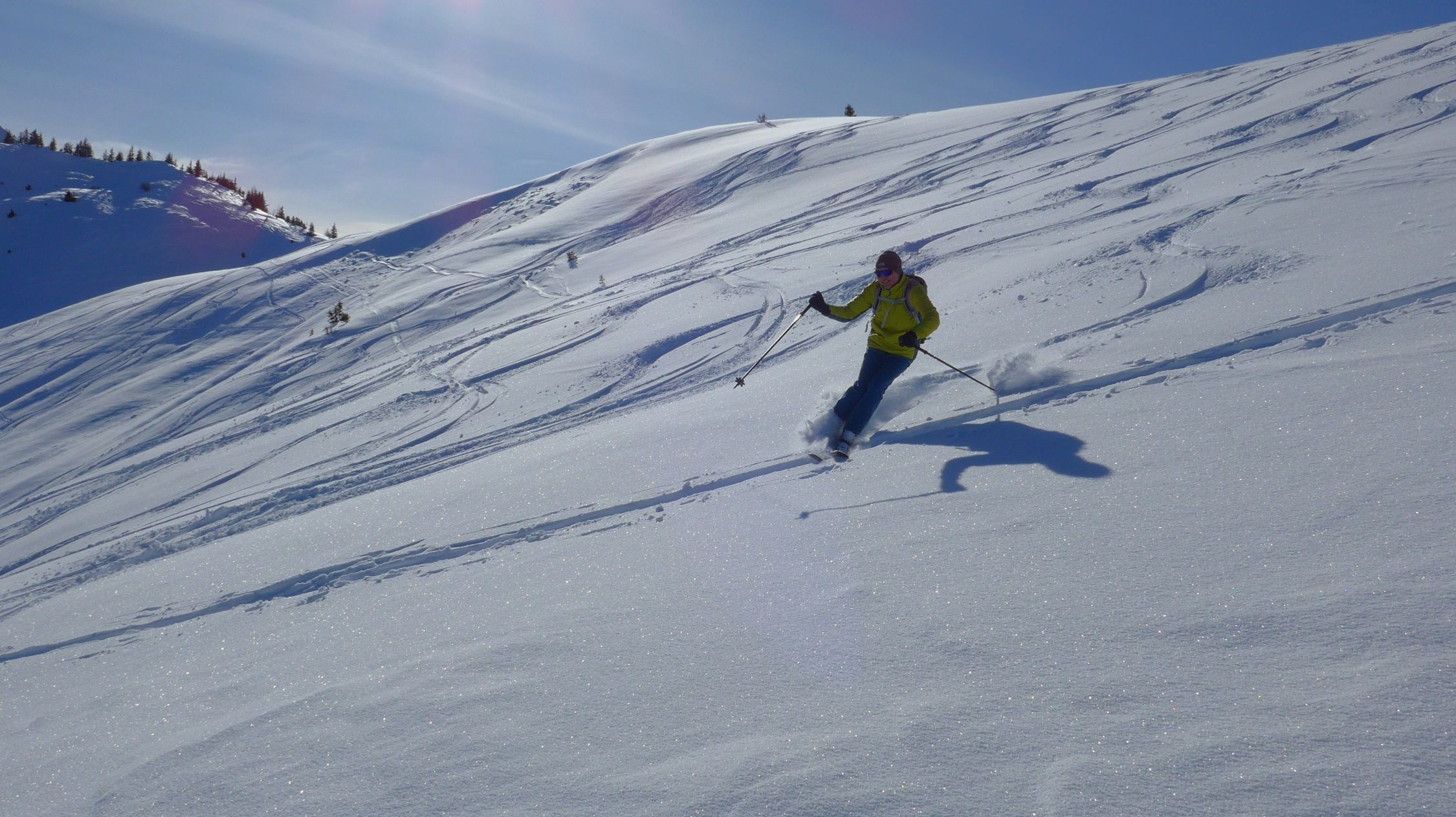 Und tatsächlich, bis weit hinunter können wir endlich wieder einmal unbeschwert wedeln. Es folgen dann sehr gut ausgefahrene, pistenähnliche Abschnitte und schliesslich geht's etwas tricky, ähnlich einem Bikepark, durch den Wald hinab, direkt bis vor die Autotür.